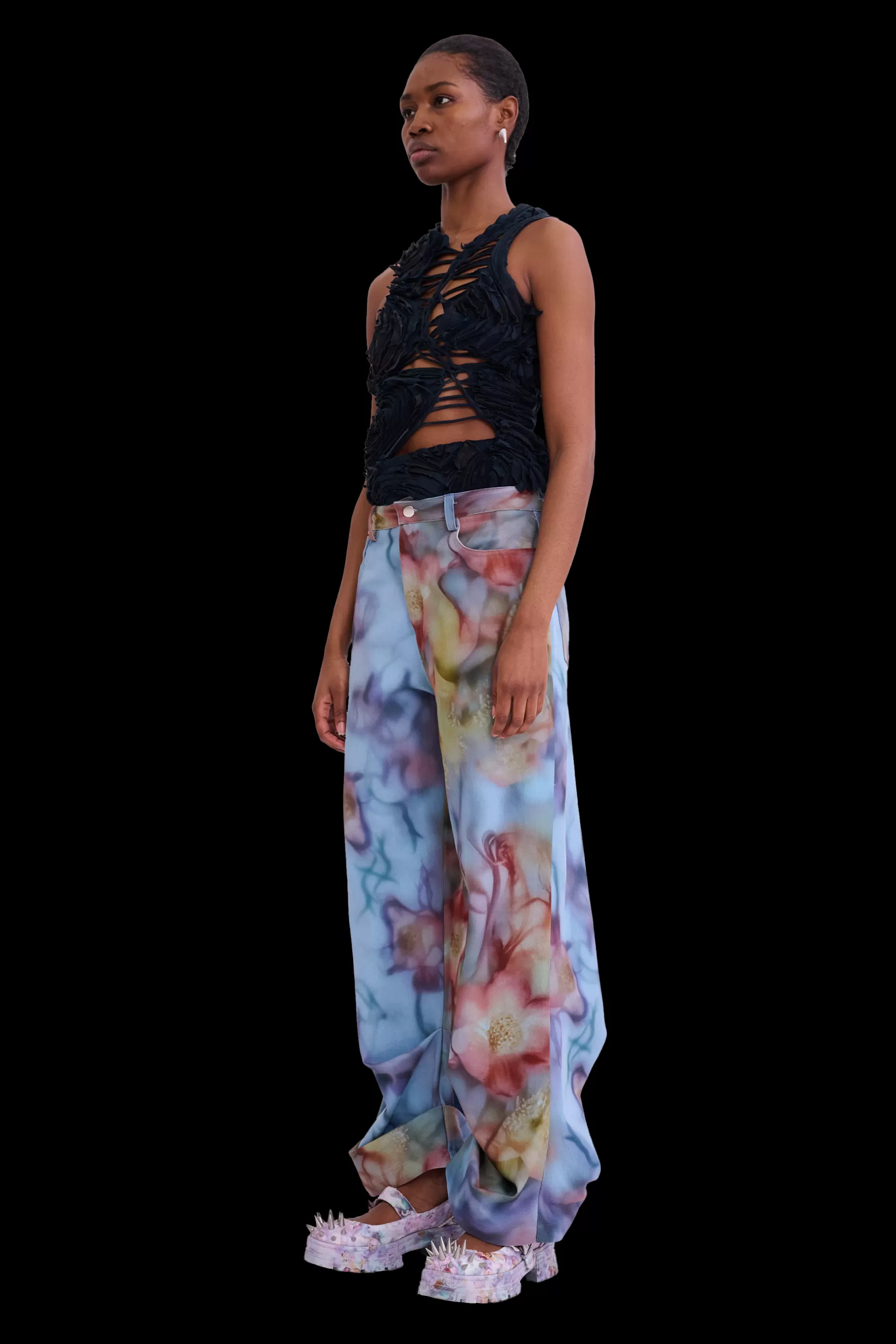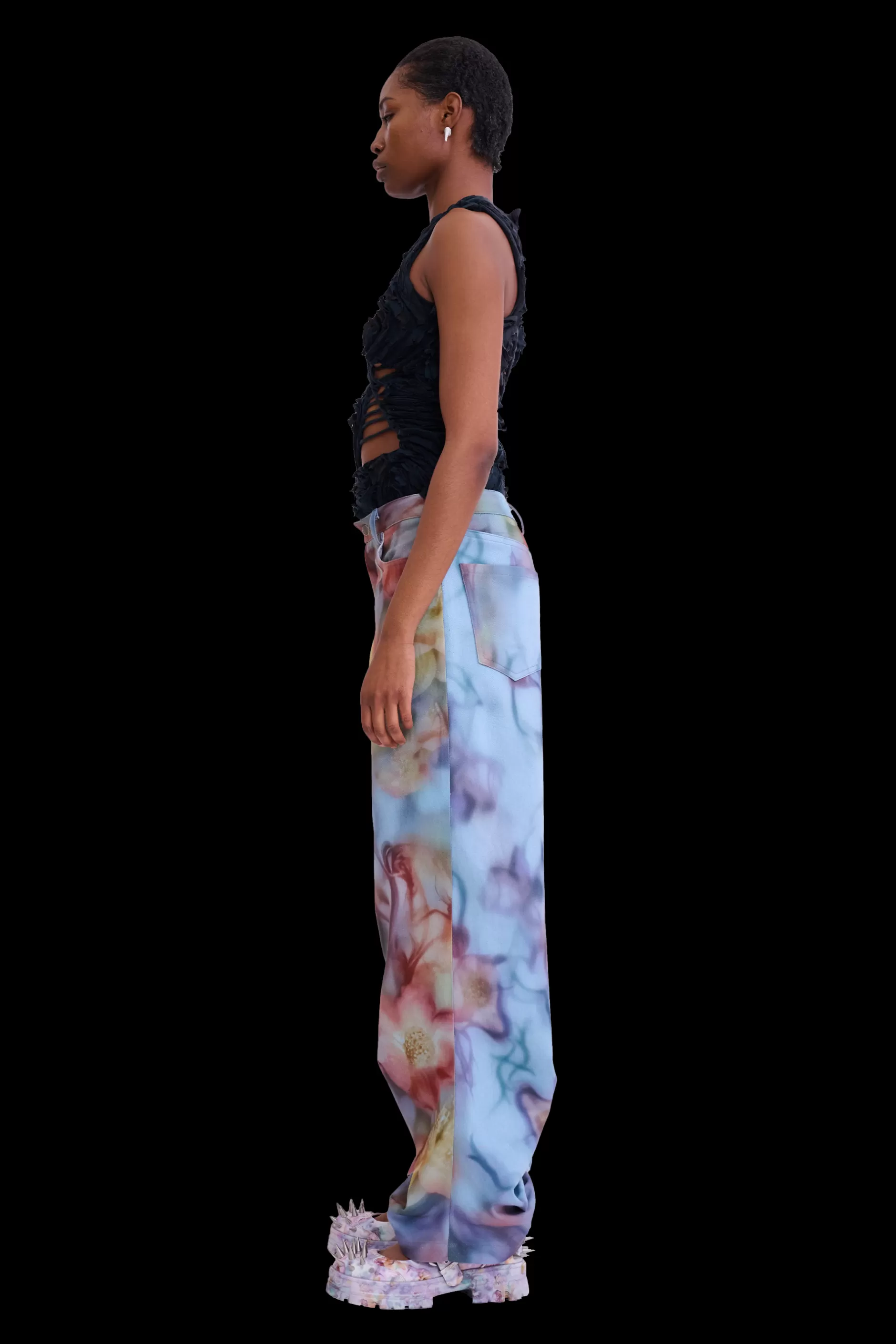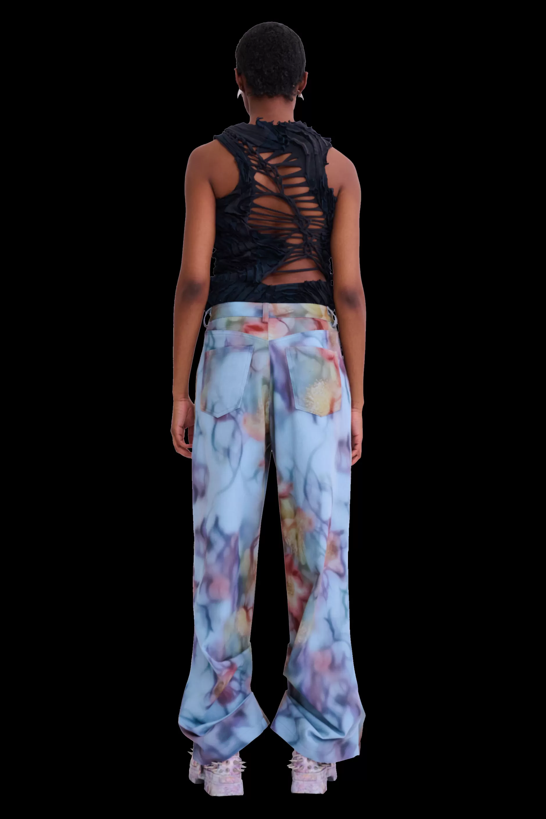 Relaxed fit mid-rise jean with draped hem. Collina Strada’s Barbed Floral printed denim.