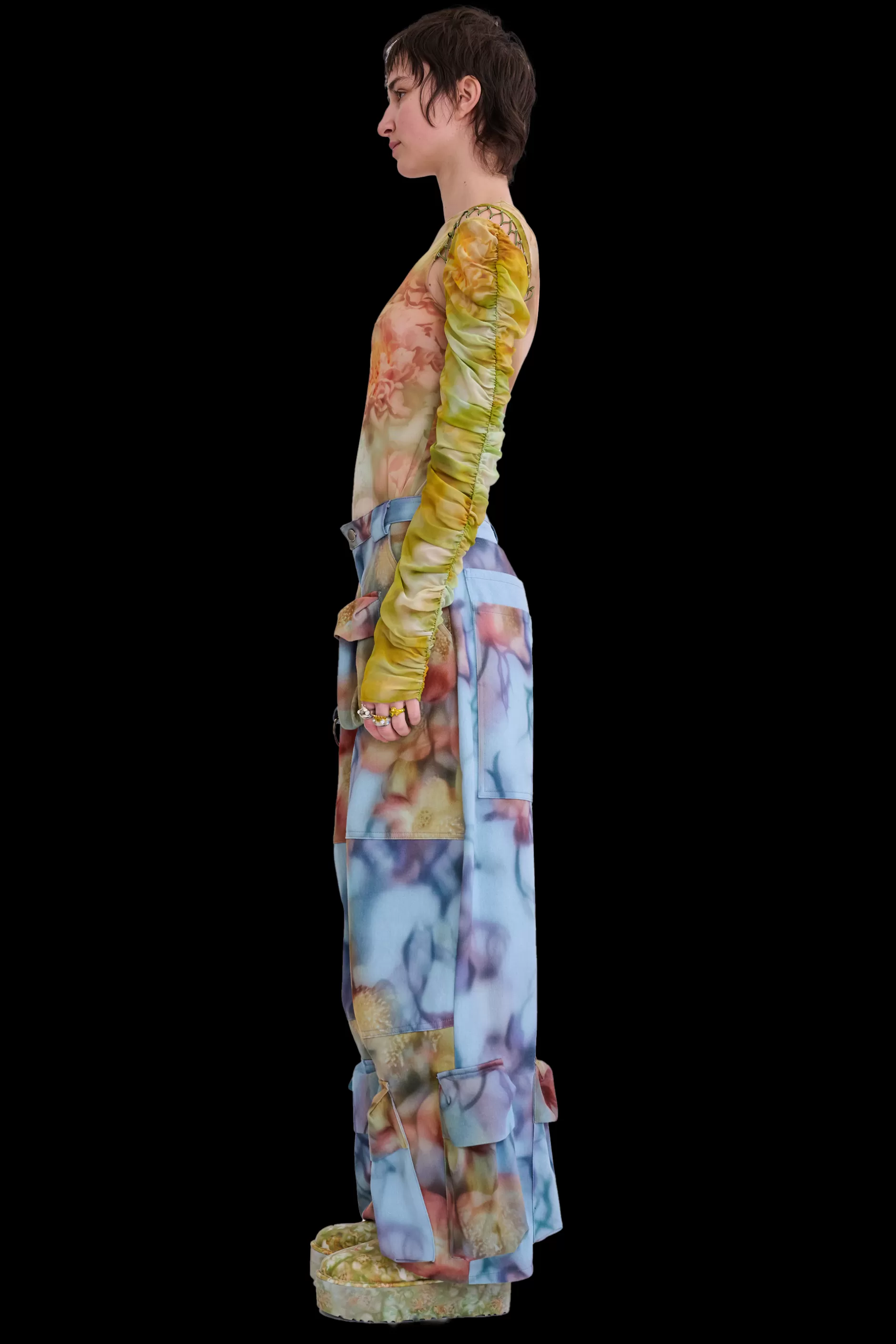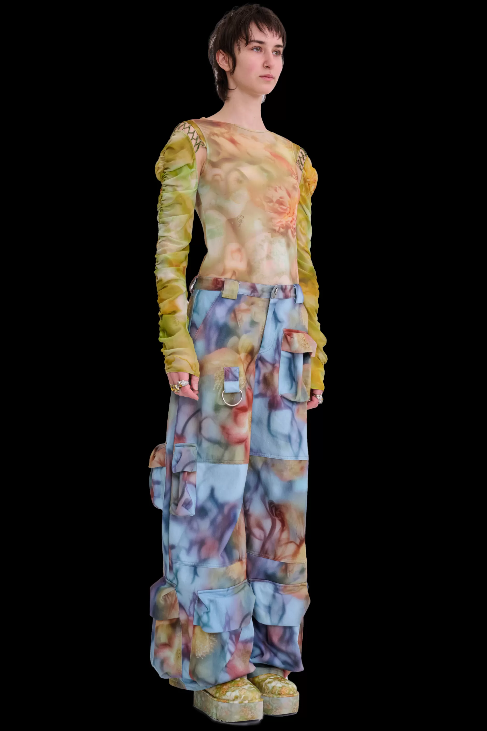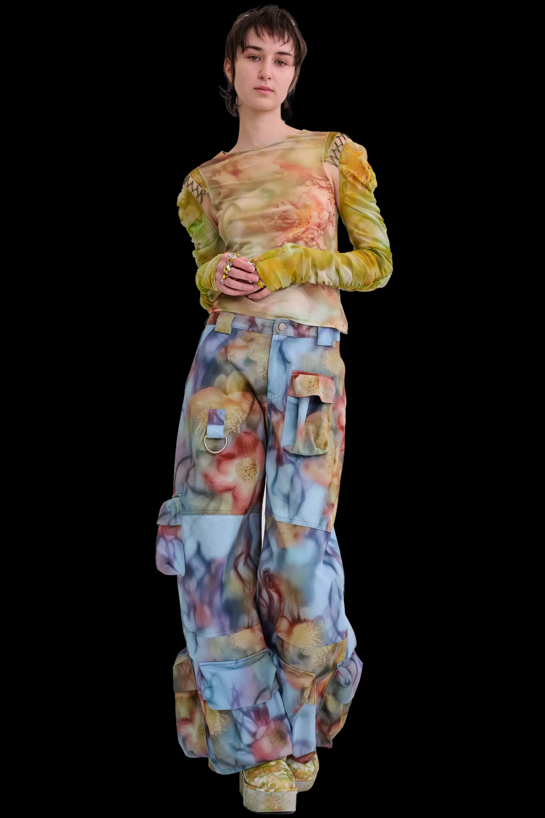 Relaxed fit with mid rise, wide leg cargo pant with large pockets all over so you can go out without a bag! Collina Strada’s AI-generated Barbed Floral printed denim.