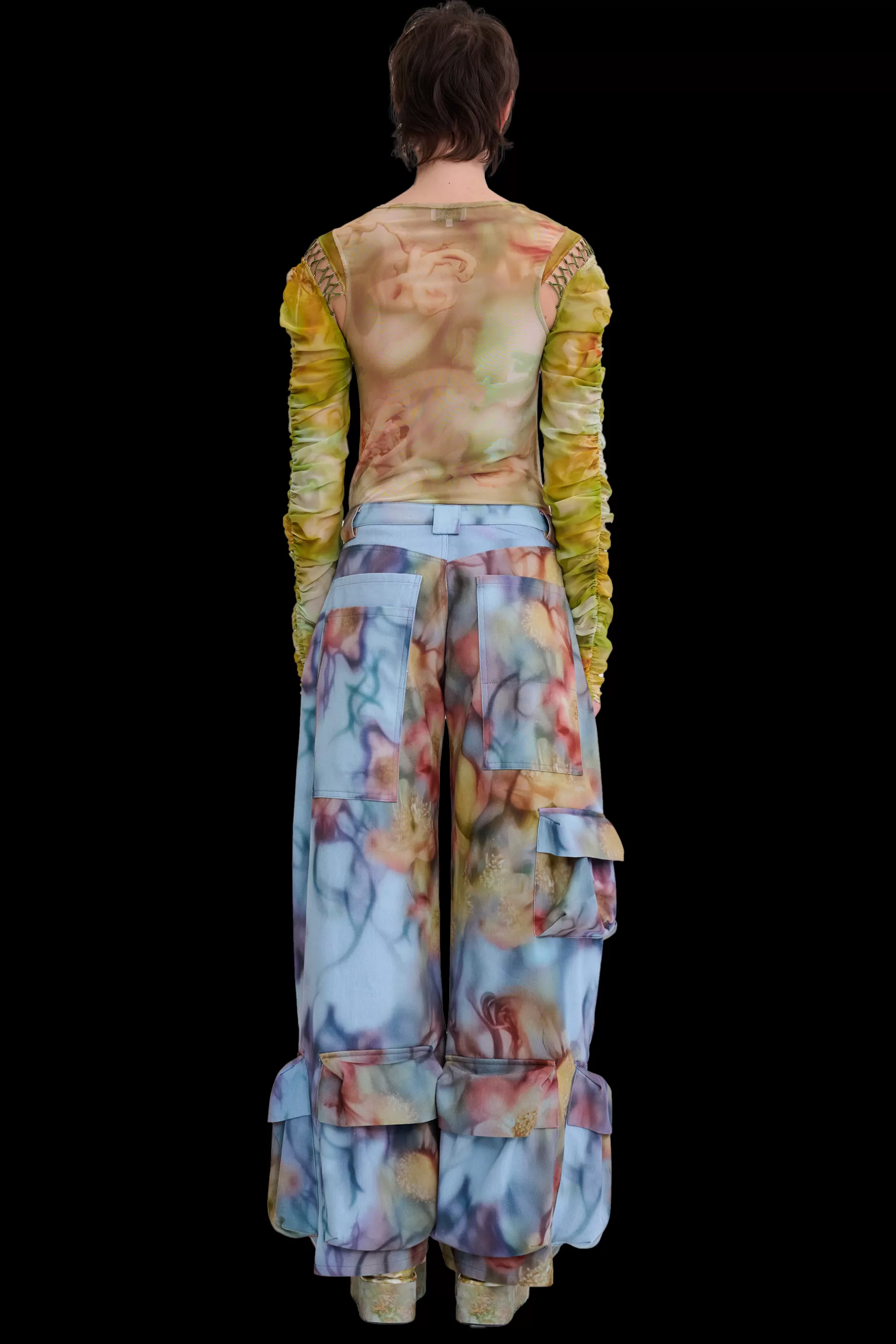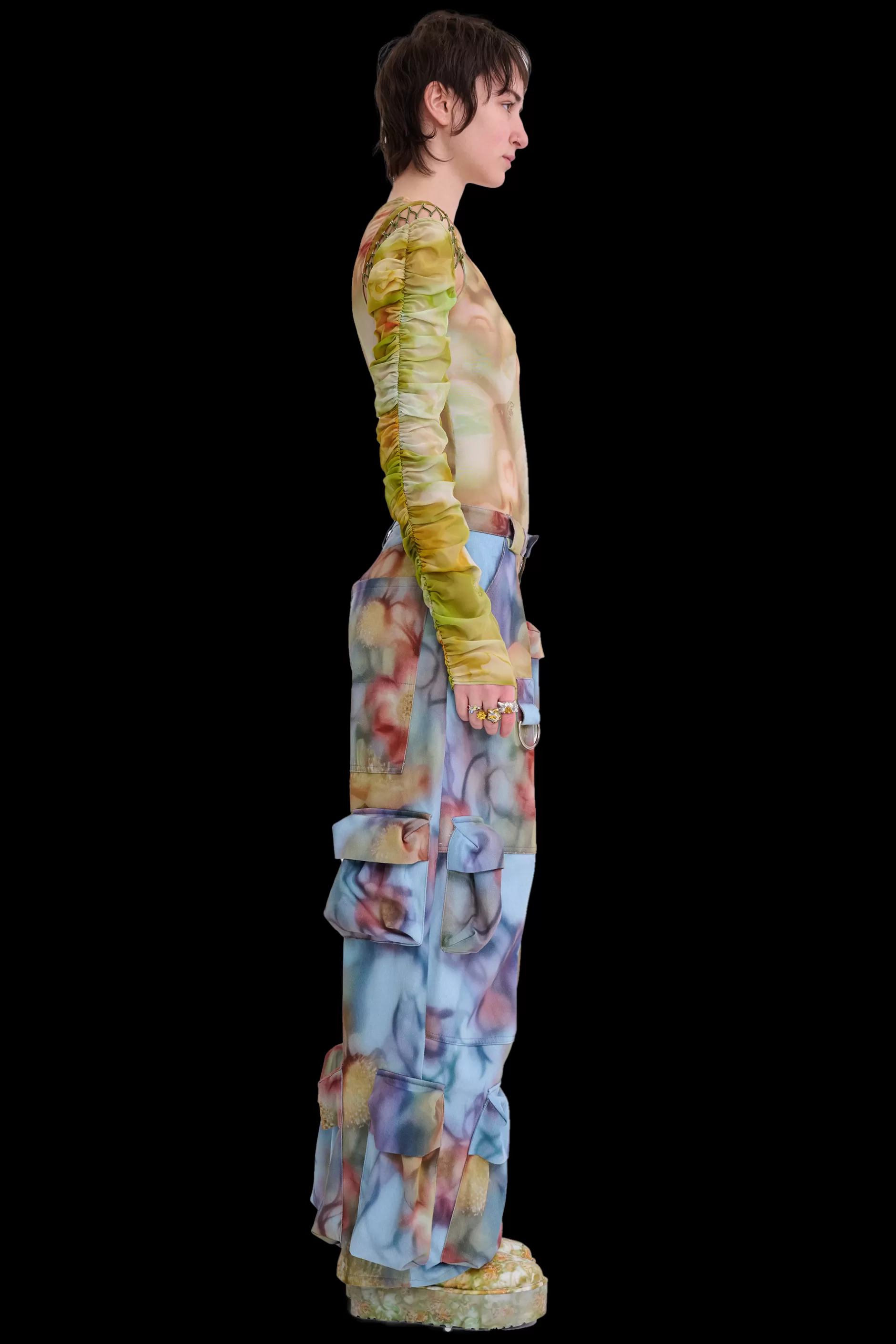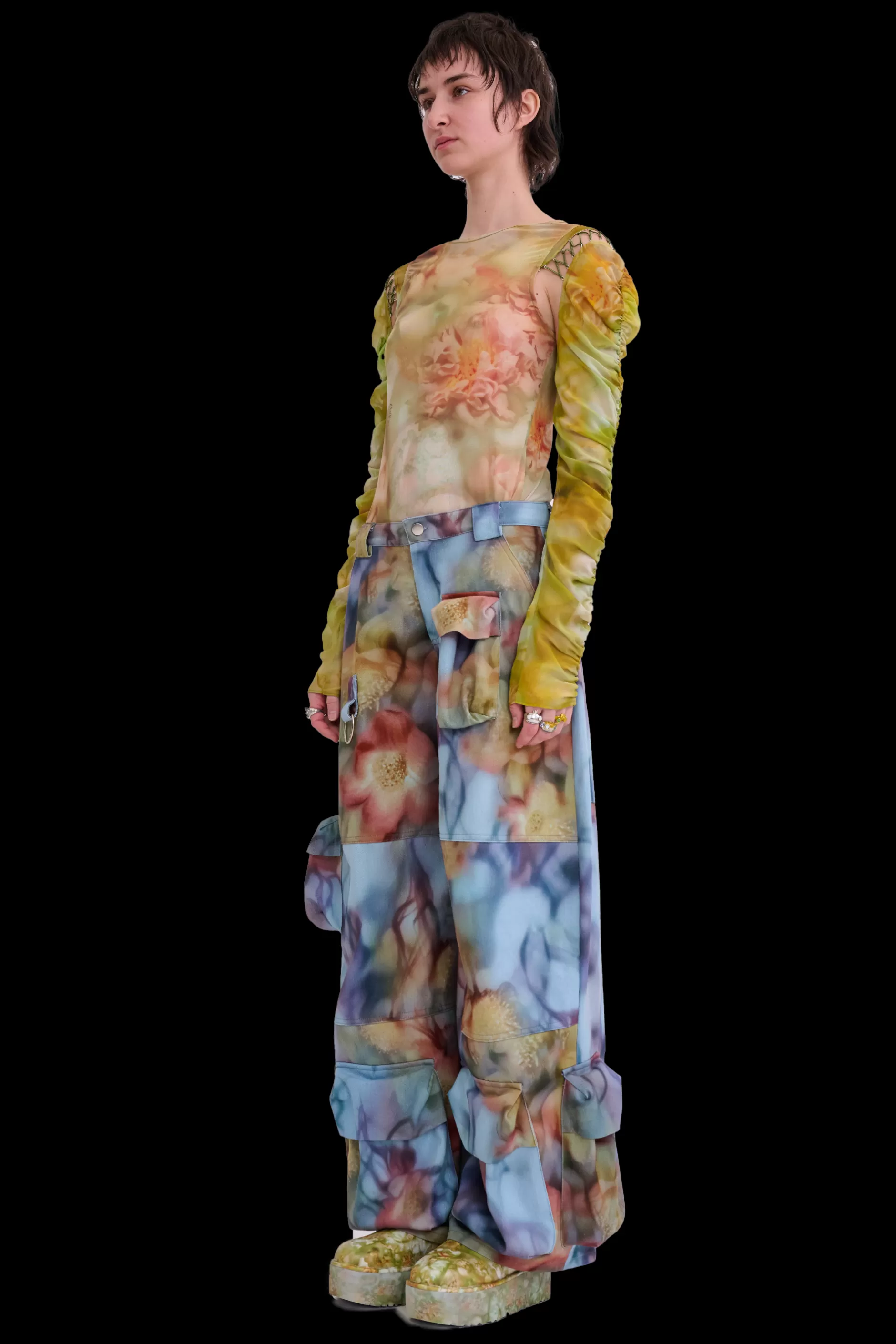 Relaxed fit with mid rise, wide leg cargo pant with large pockets all over so you can go out without a bag! Collina Strada’s AI-generated Barbed Floral printed denim.