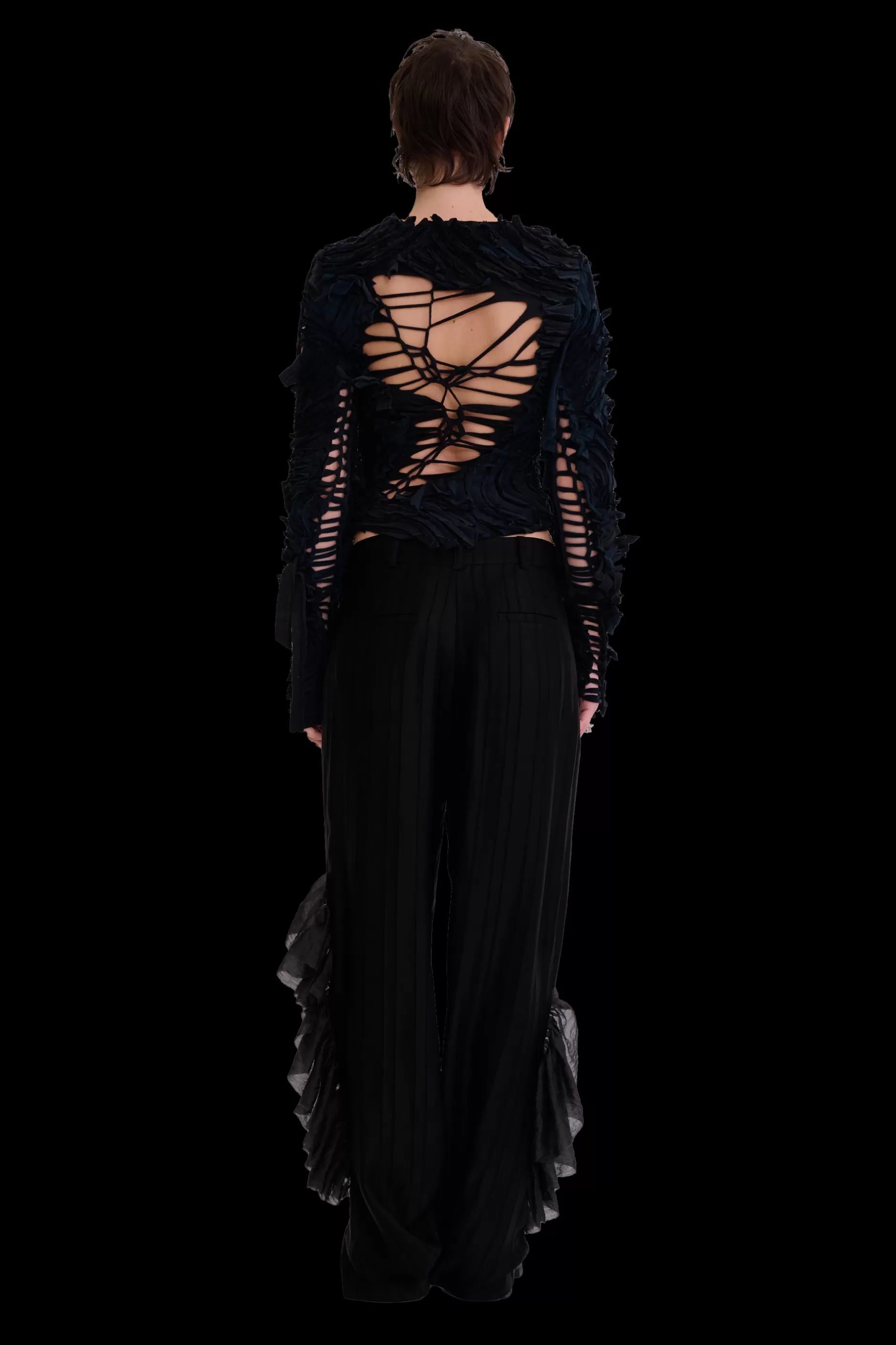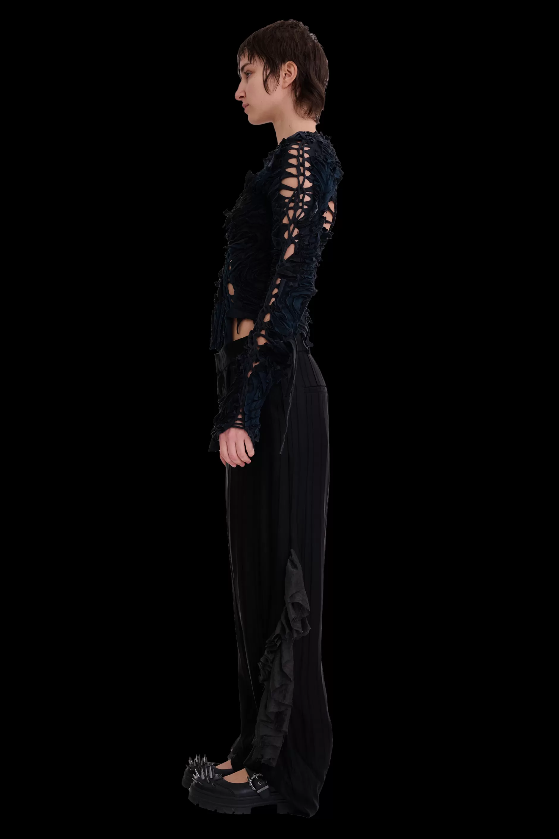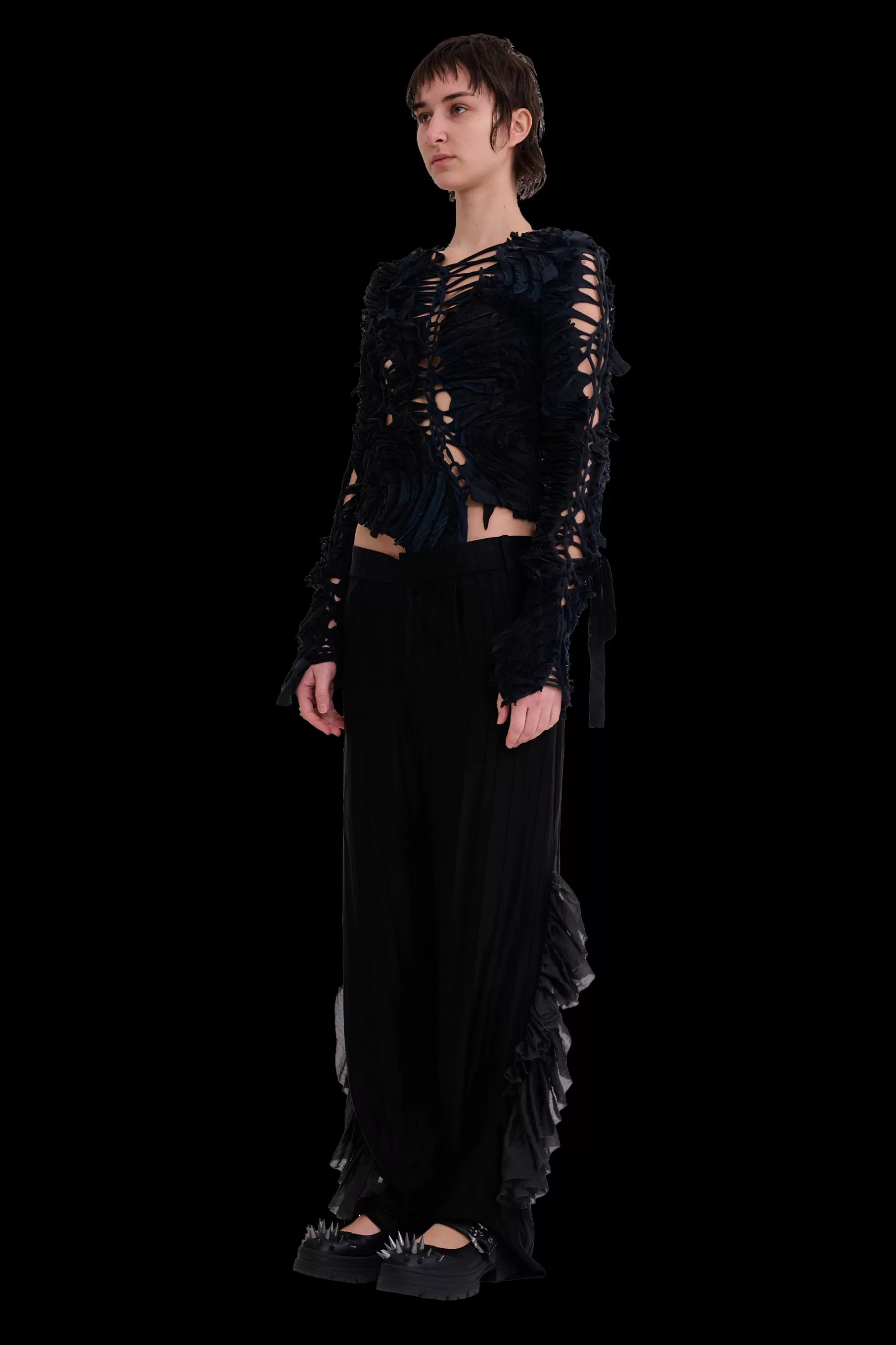 Relaxed fit, mid-rise, satin pant with crinkle voile ruffles around the leg.42% triacetate 40% cupro 18% polyester and 7…