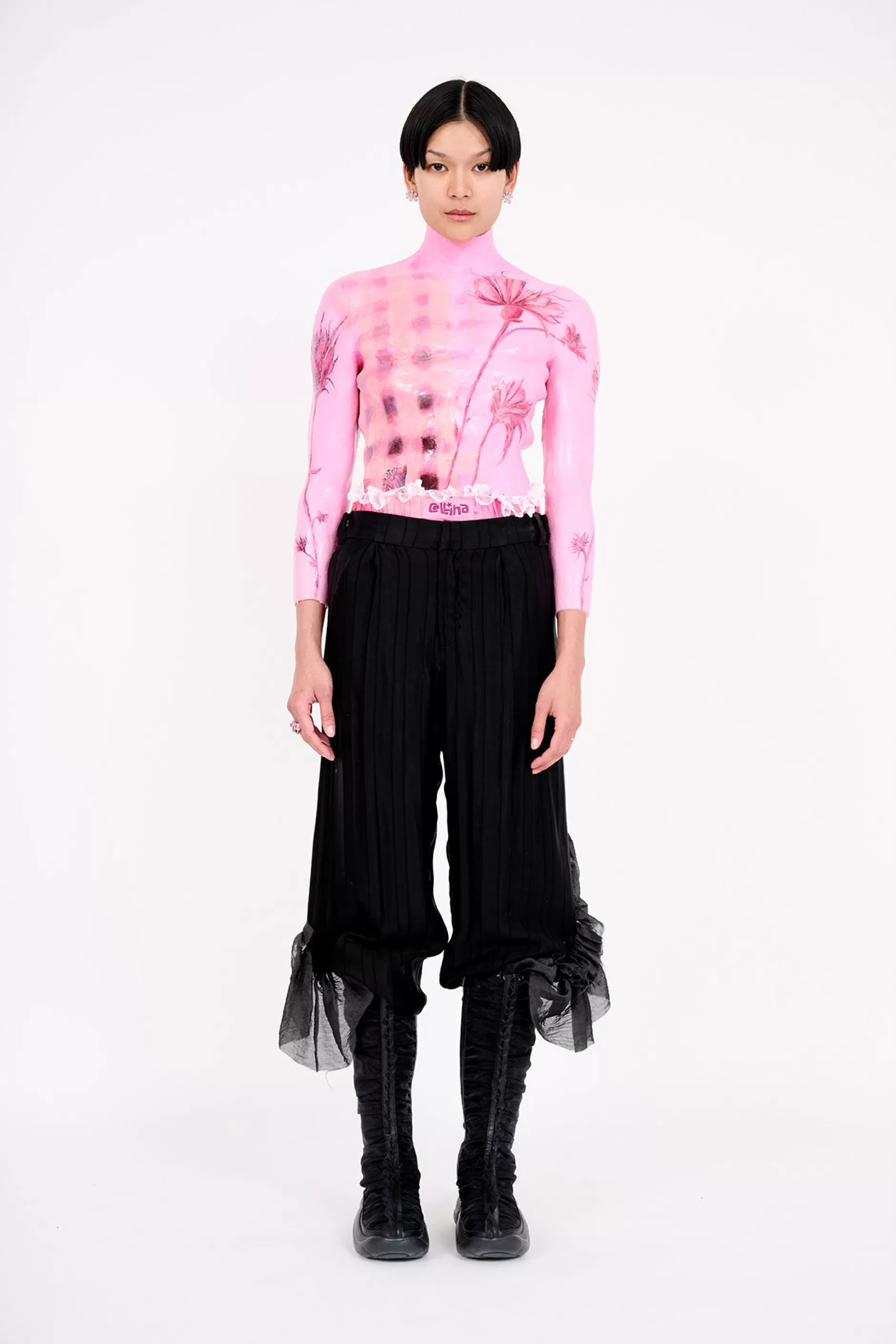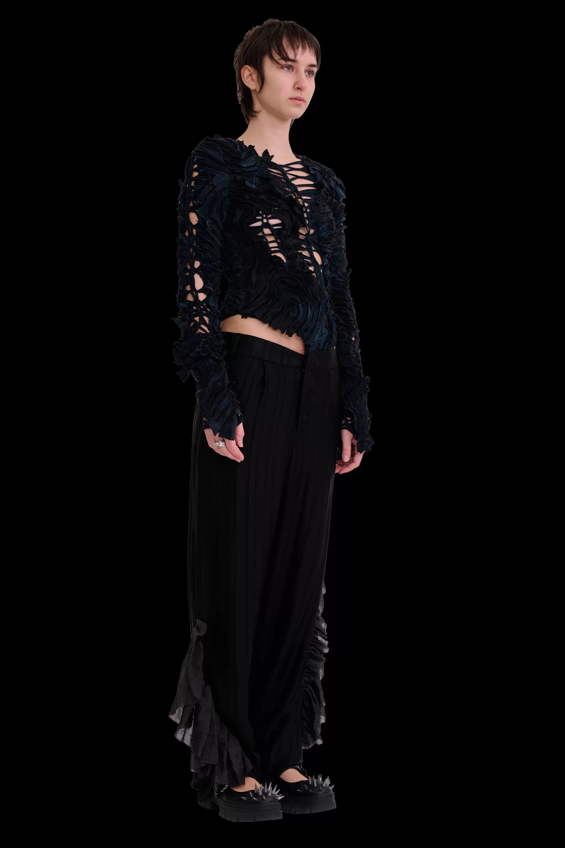 Relaxed fit, mid-rise, satin pant with crinkle voile ruffles around the leg.