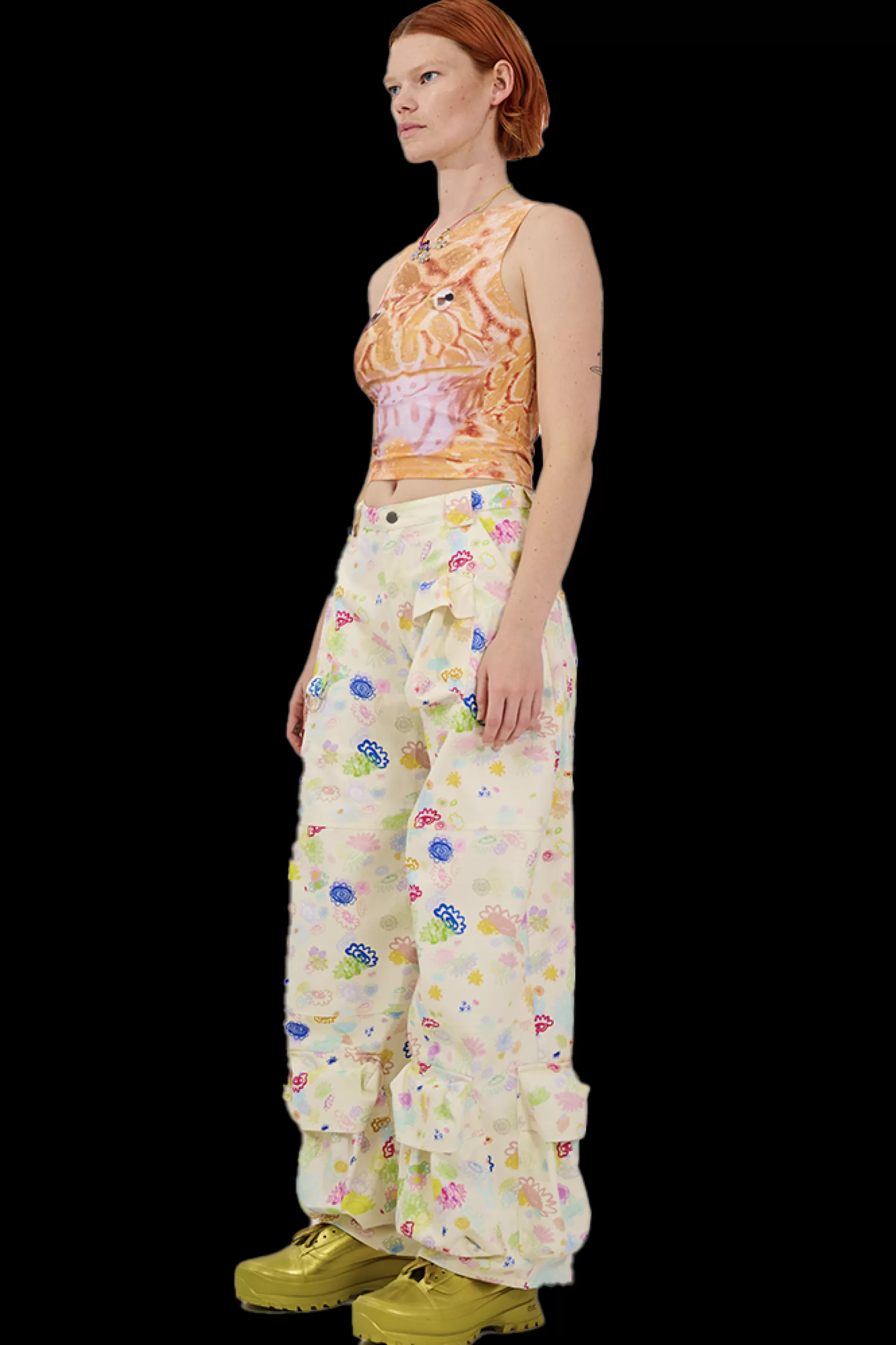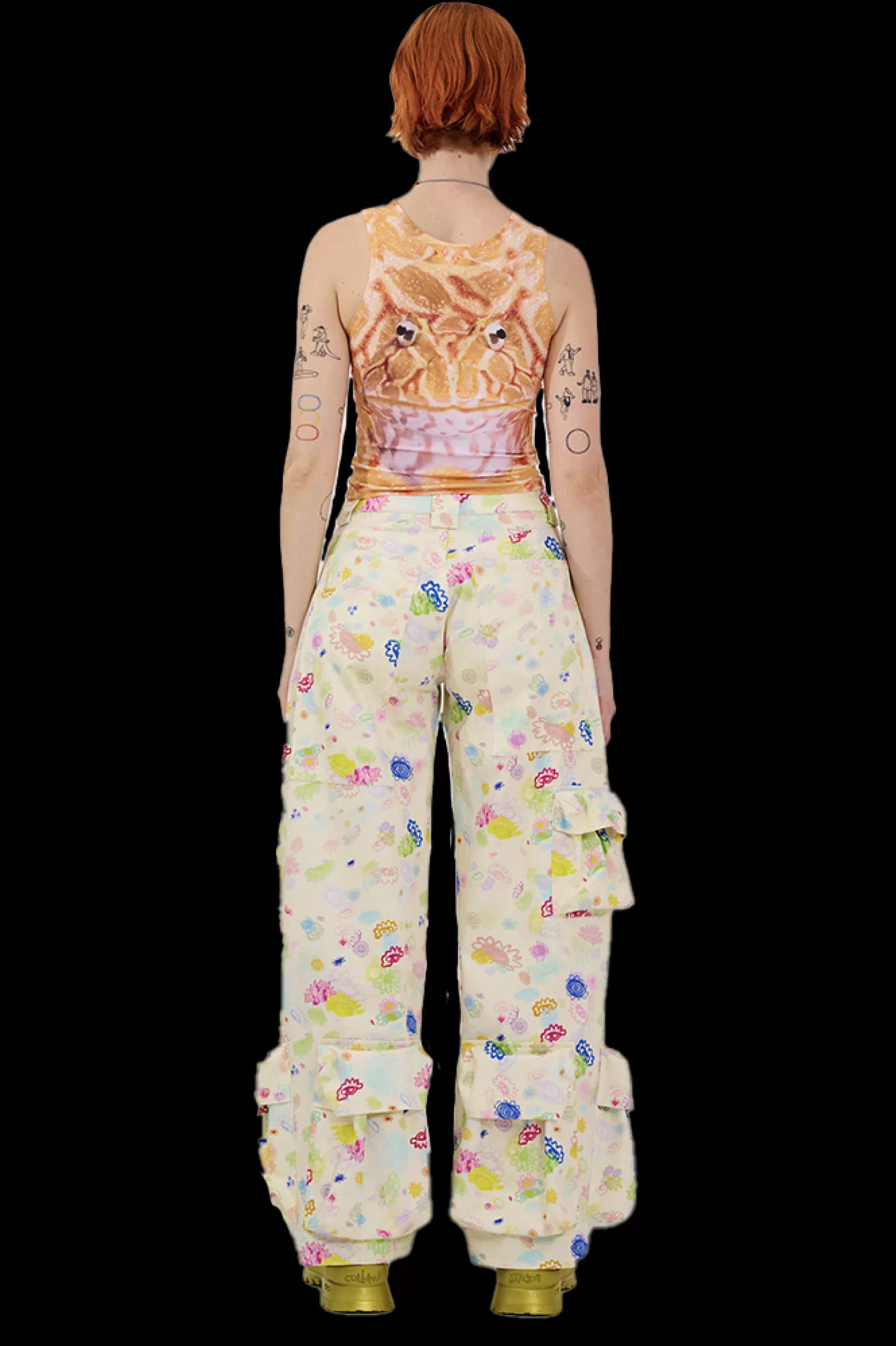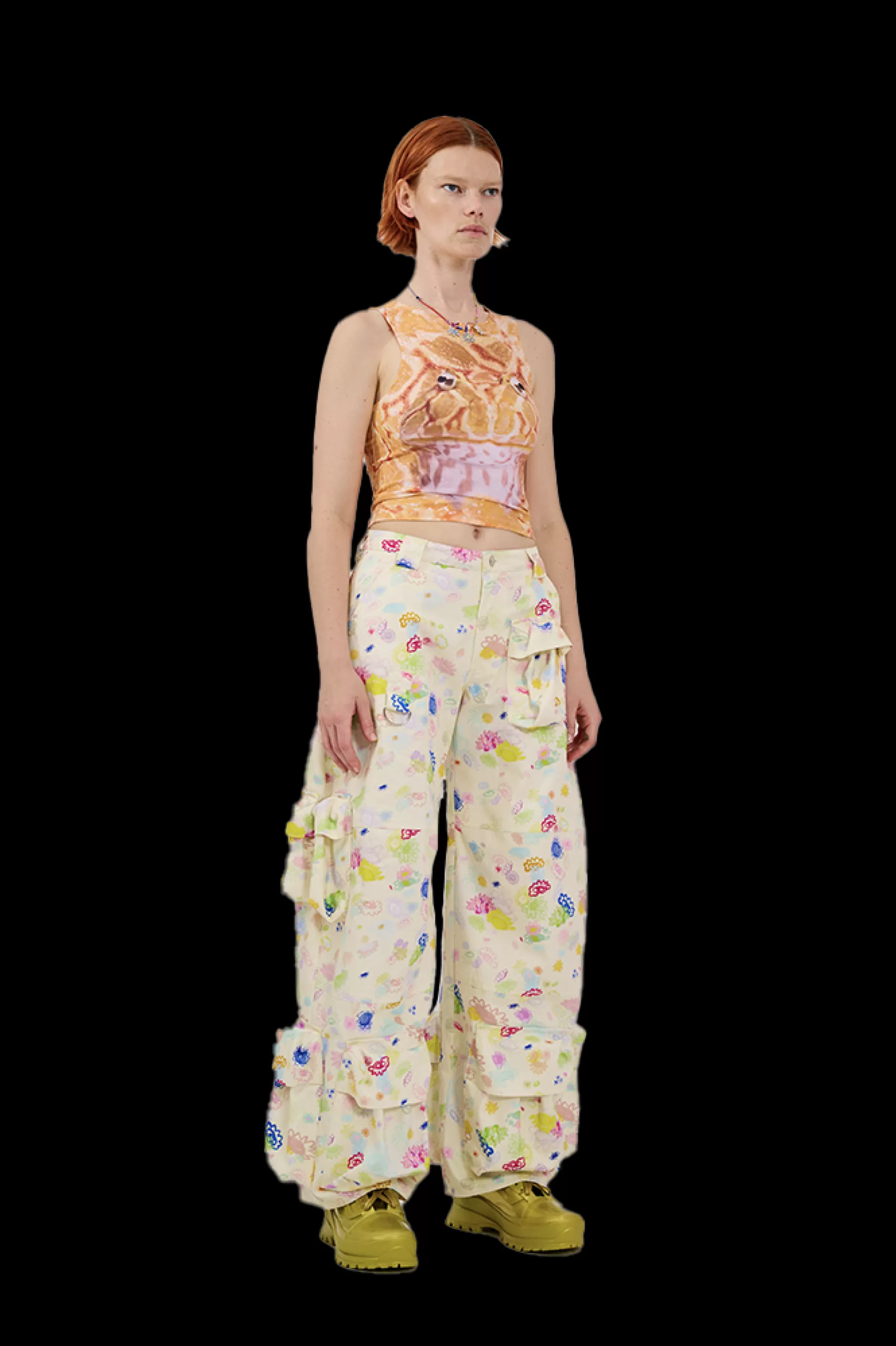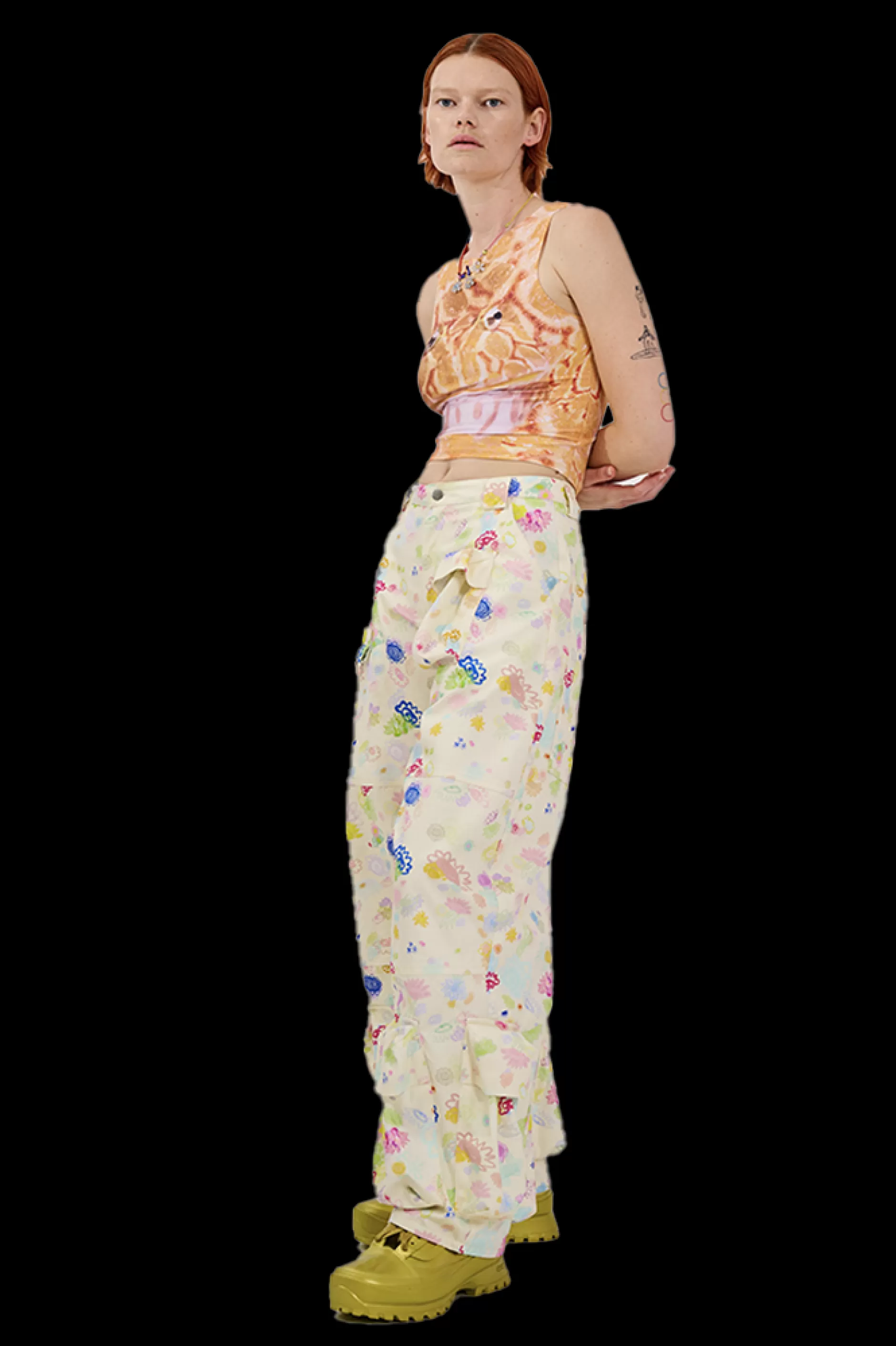 Relaxed fit with mid rise, wide leg cargo pant with large pockets all over so you can go out without a bag! Custom Collina Strada doodle print.