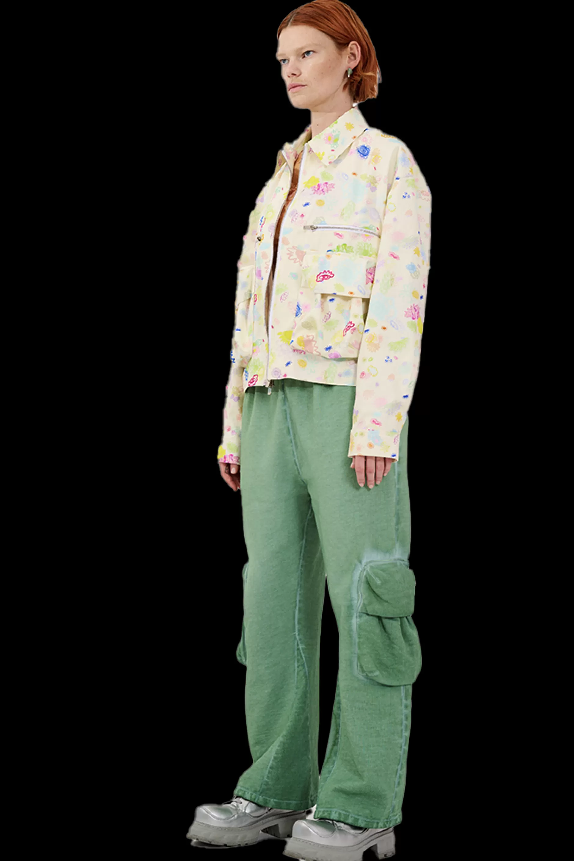 Printed cotton twill jacket with oversized cargo pockets on front and back. Two way zipper.