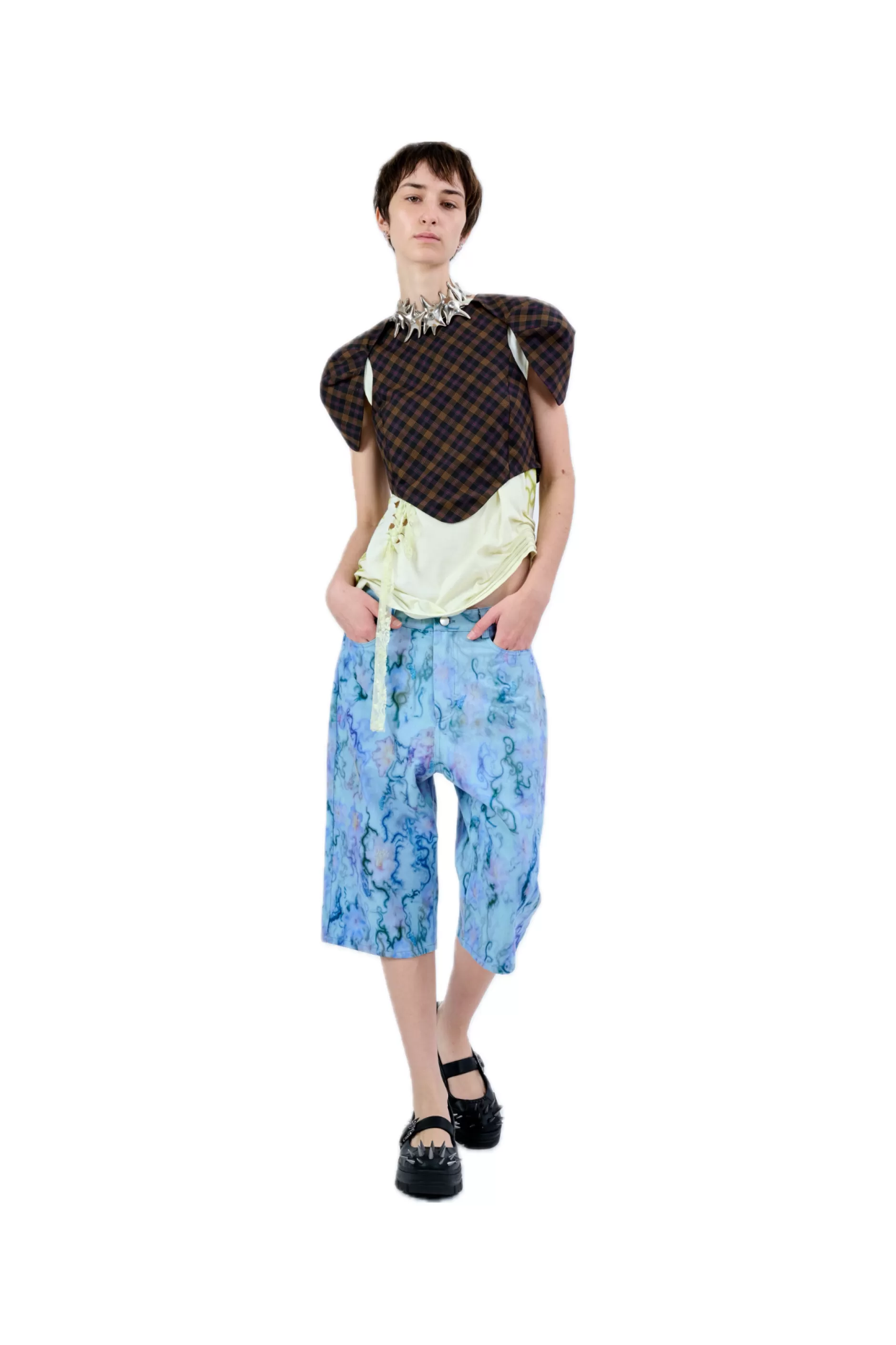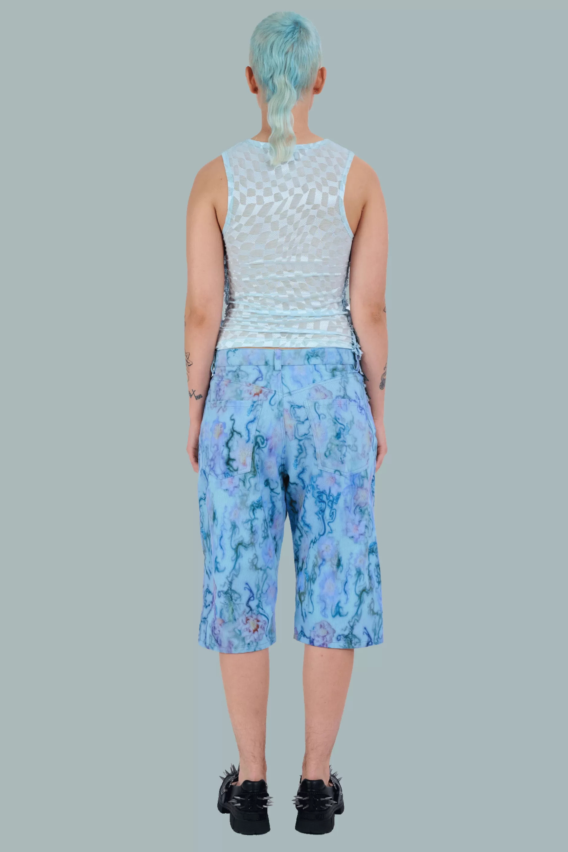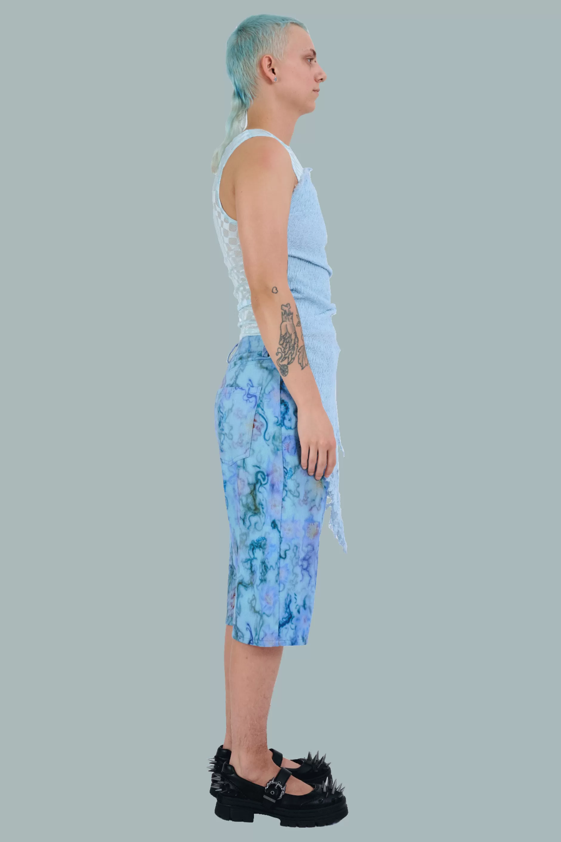 Mid-rise relaxed fit jorts with Collina Strada AI generated Blue Thorn print.