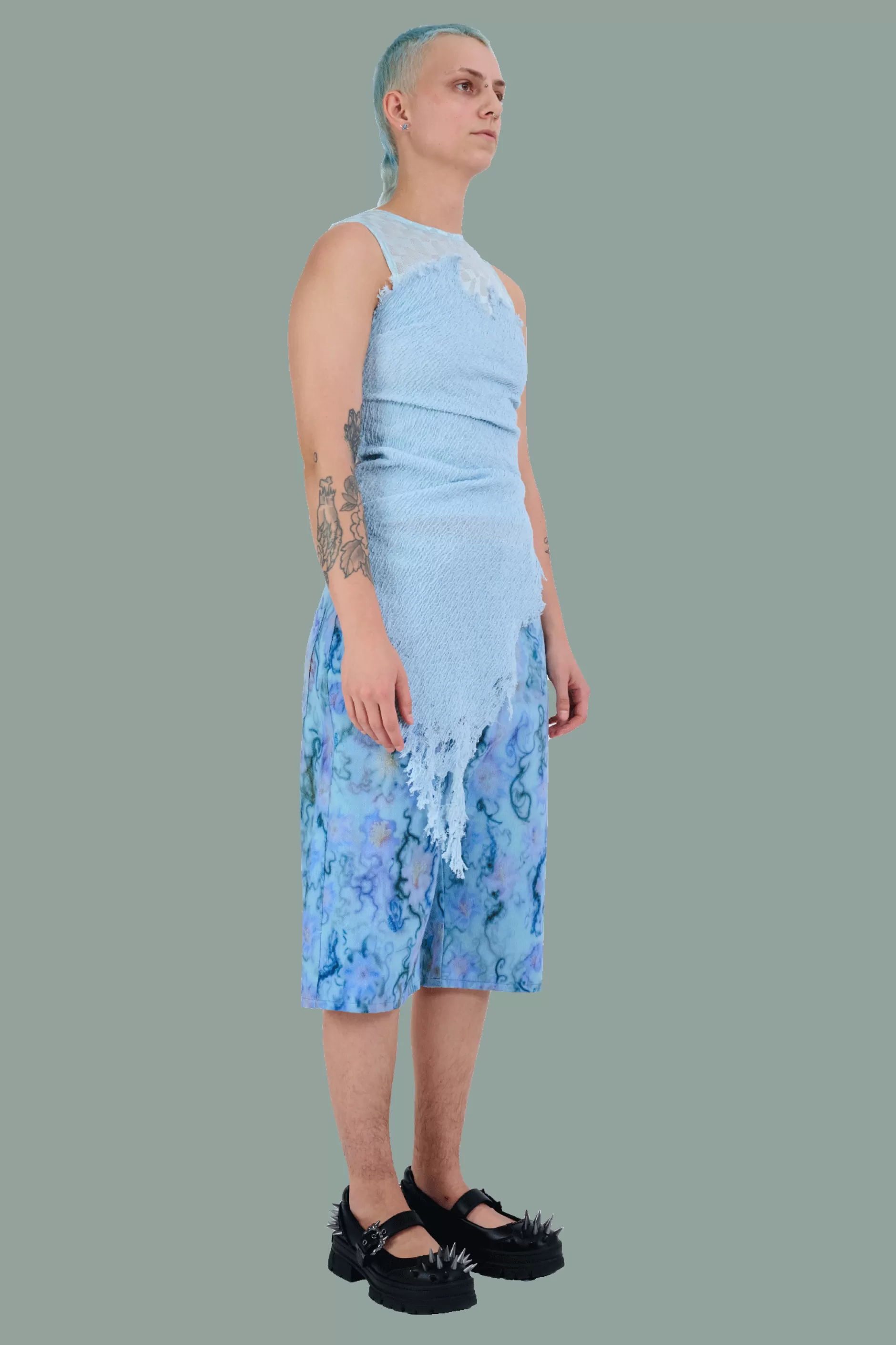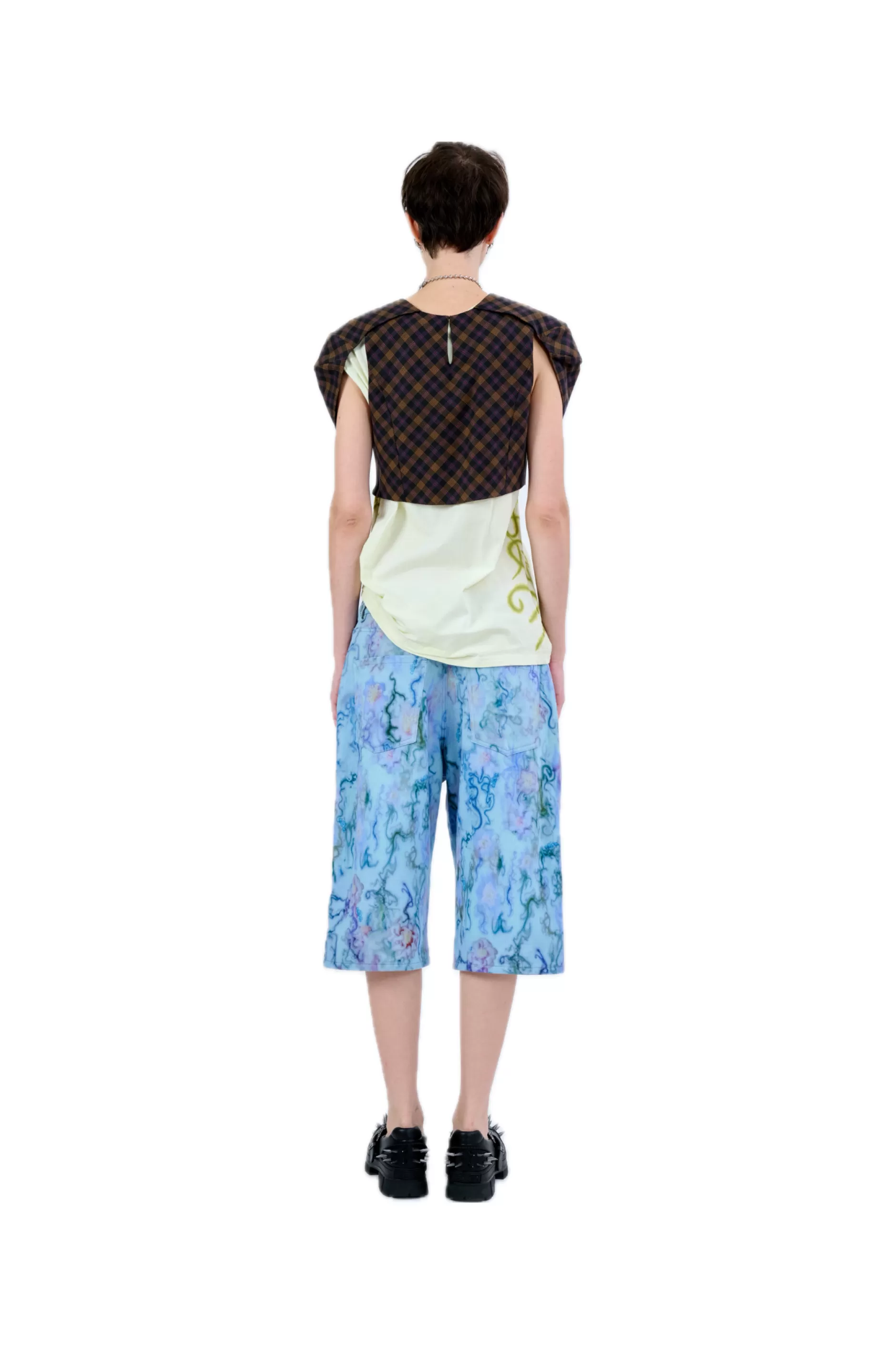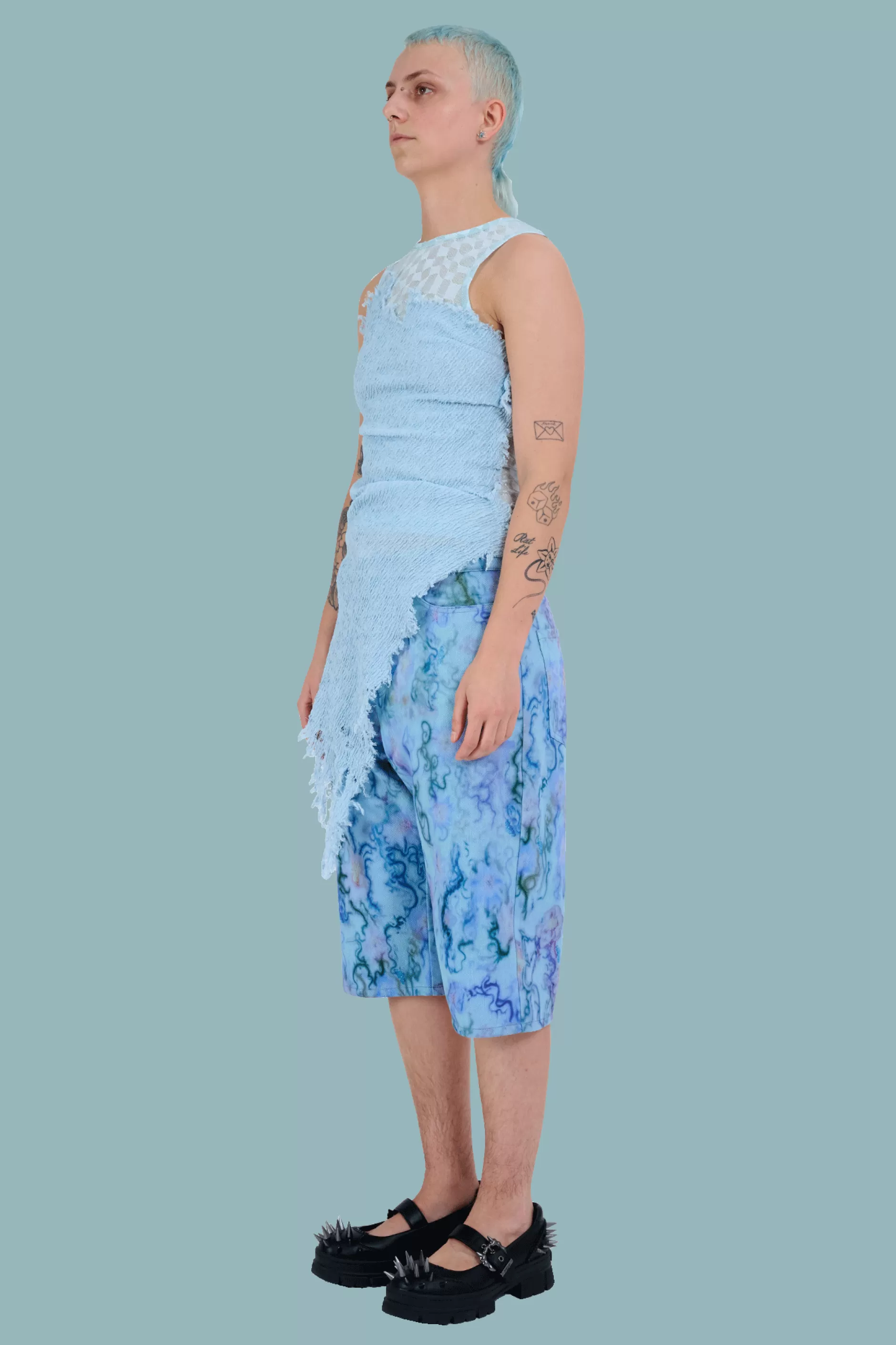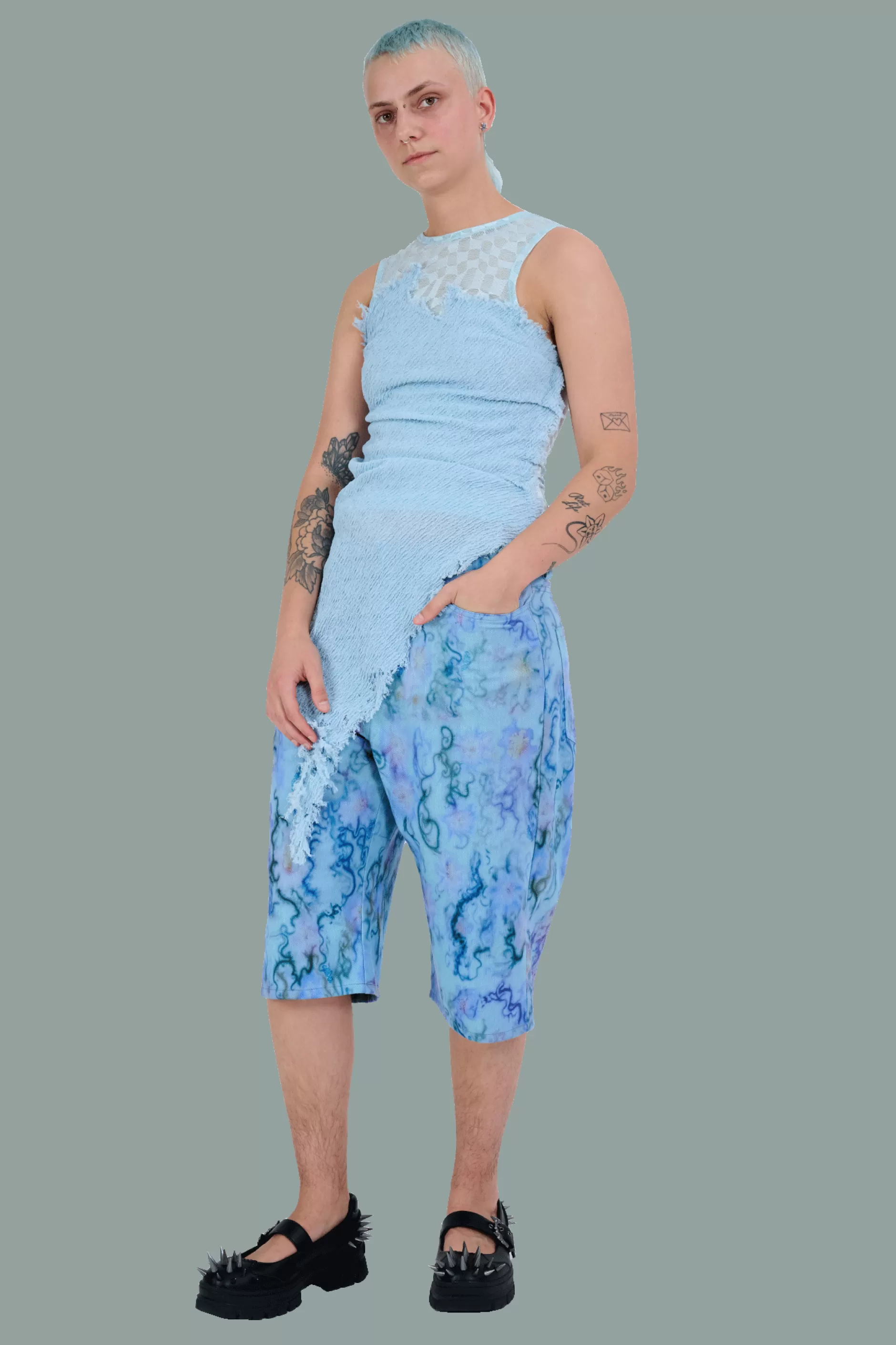 Mid-rise relaxed fit jorts with Collina Strada AI generated Blue Thorn print.