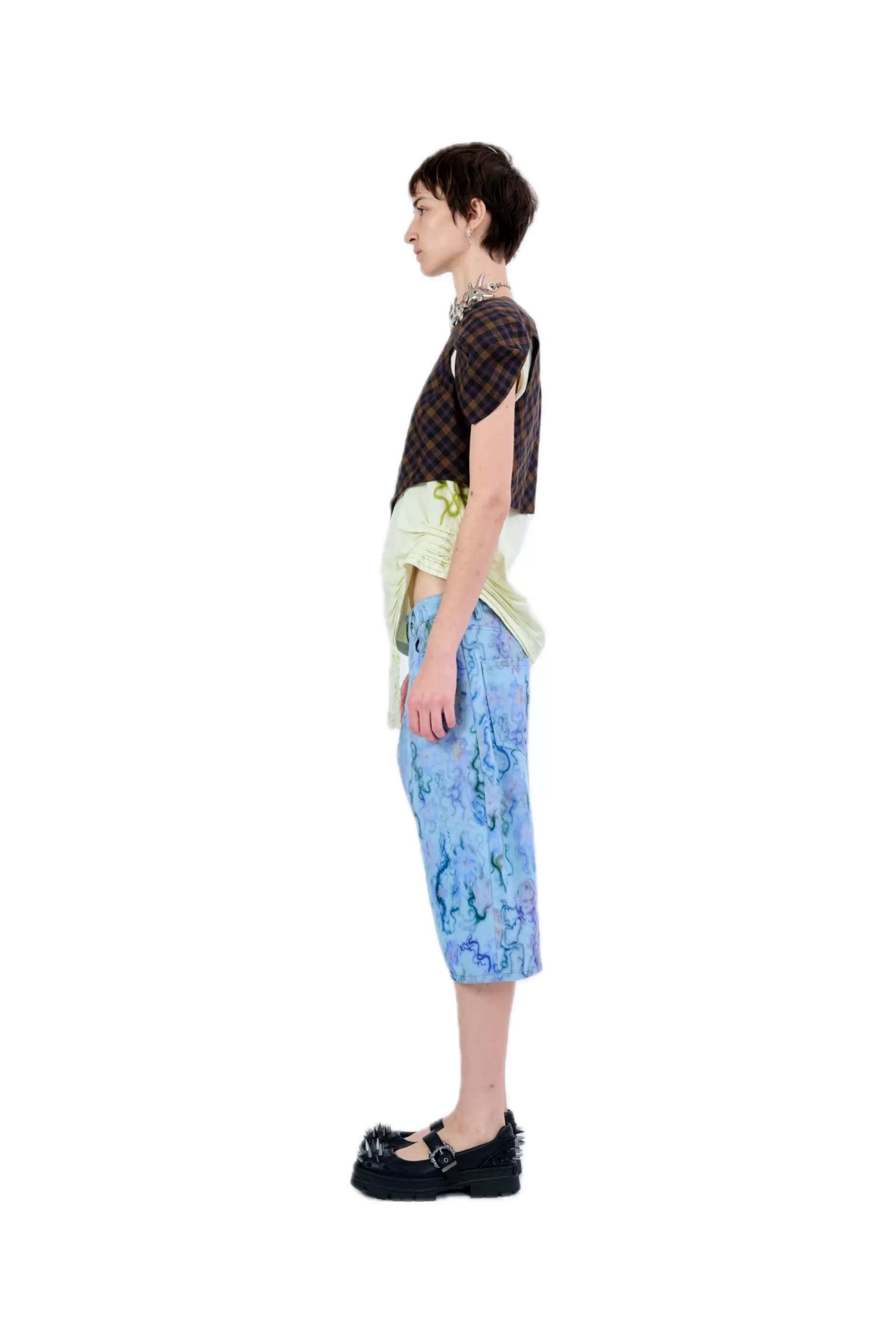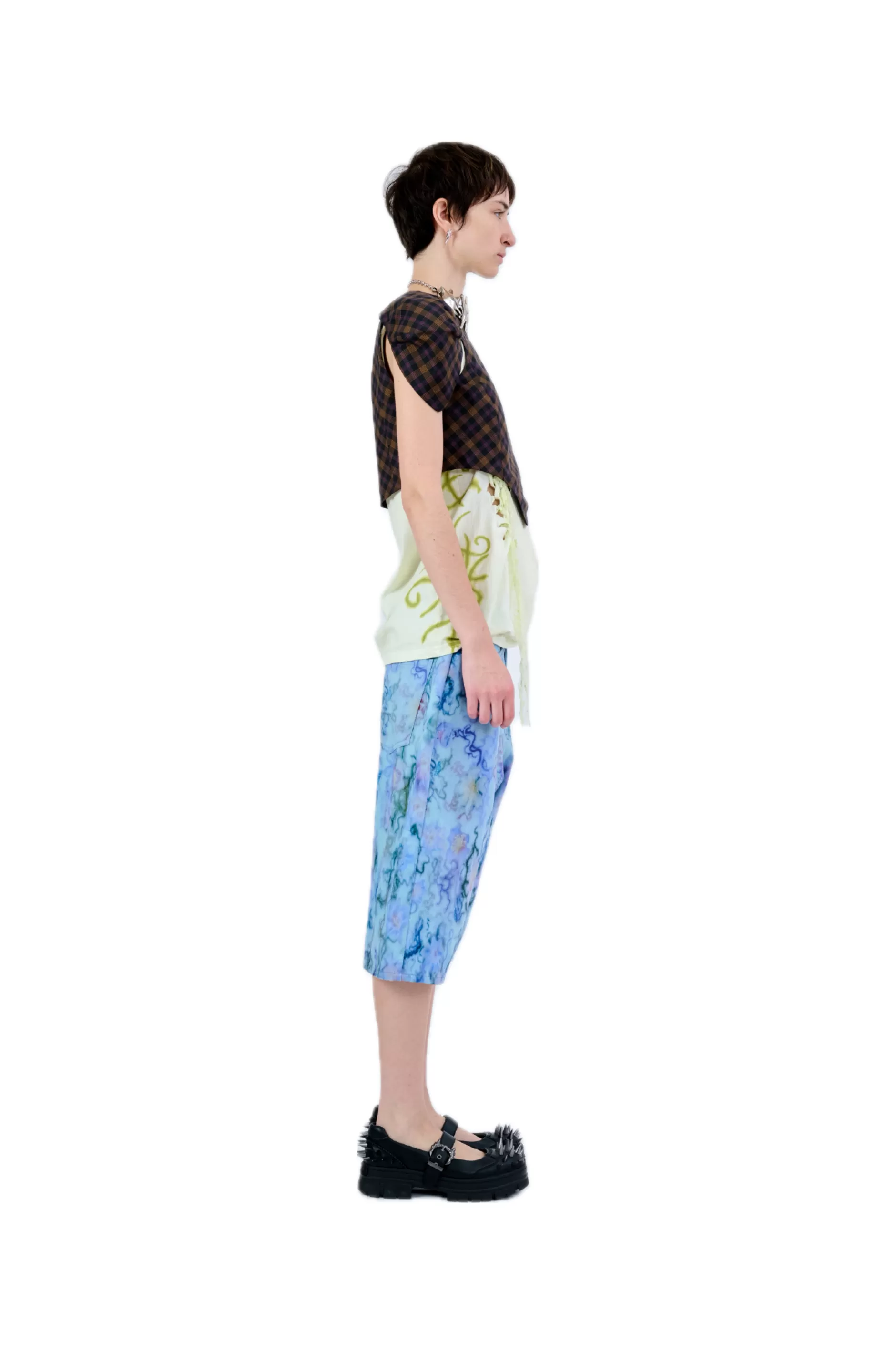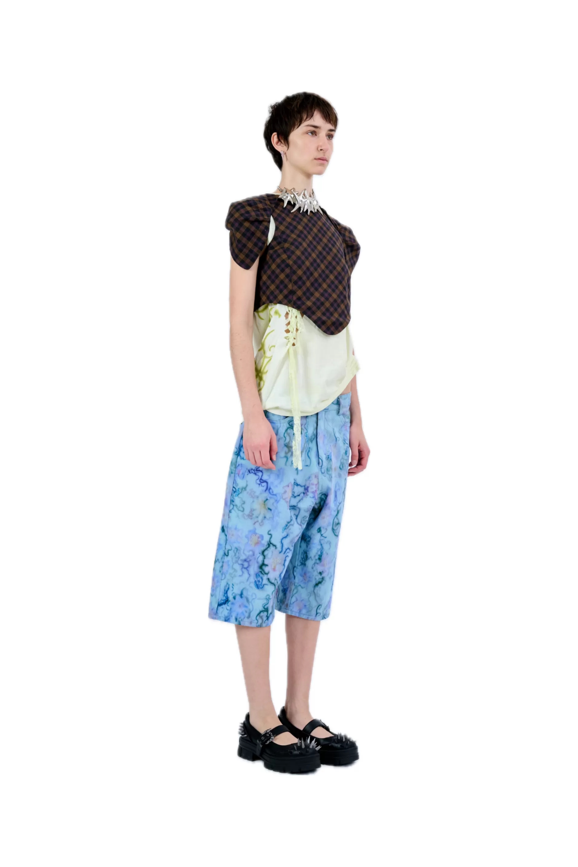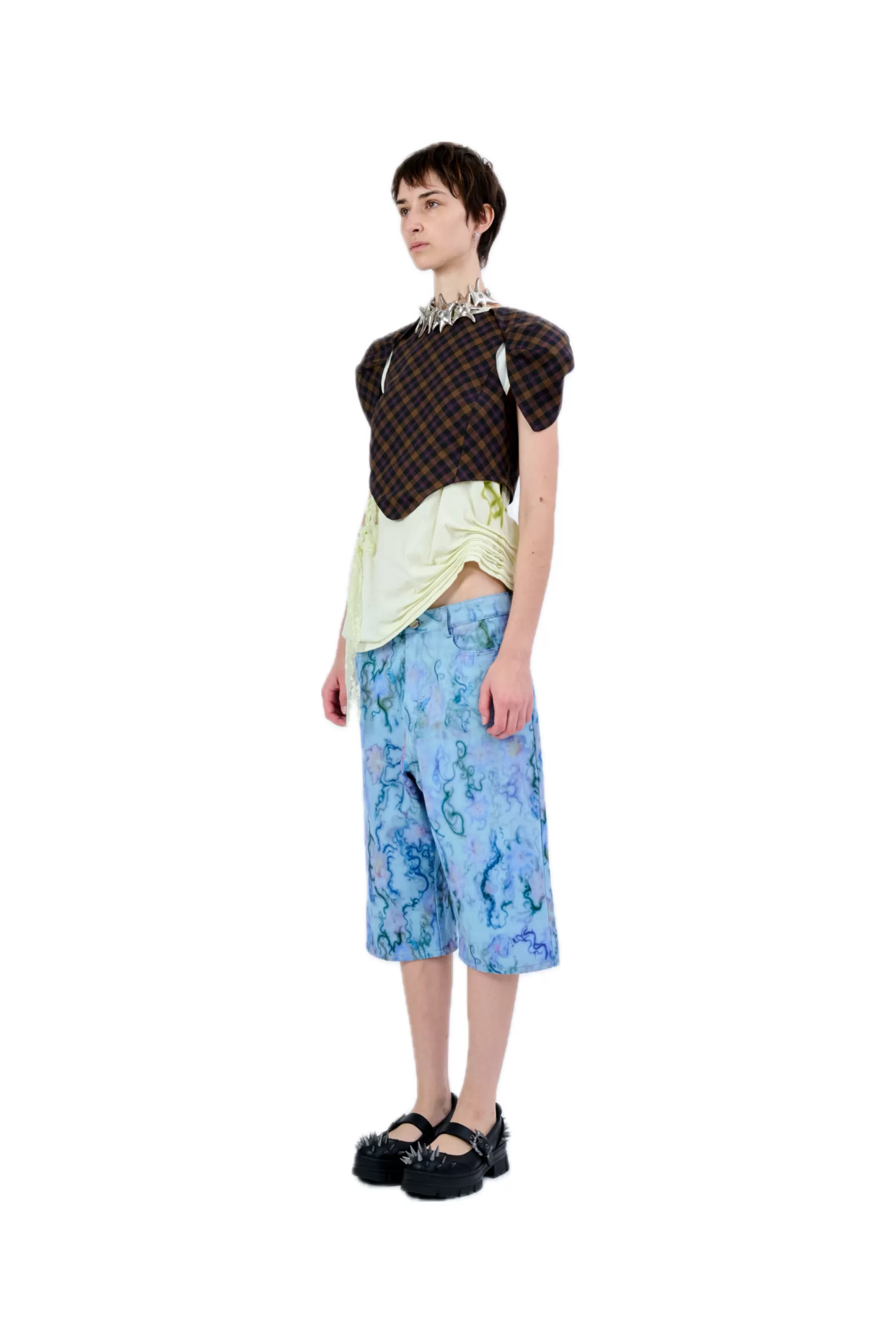 Mid-rise relaxed fit jorts with Collina Strada AI generated Blue Thorn print. 100% Cotton Made in New York Model wears a…