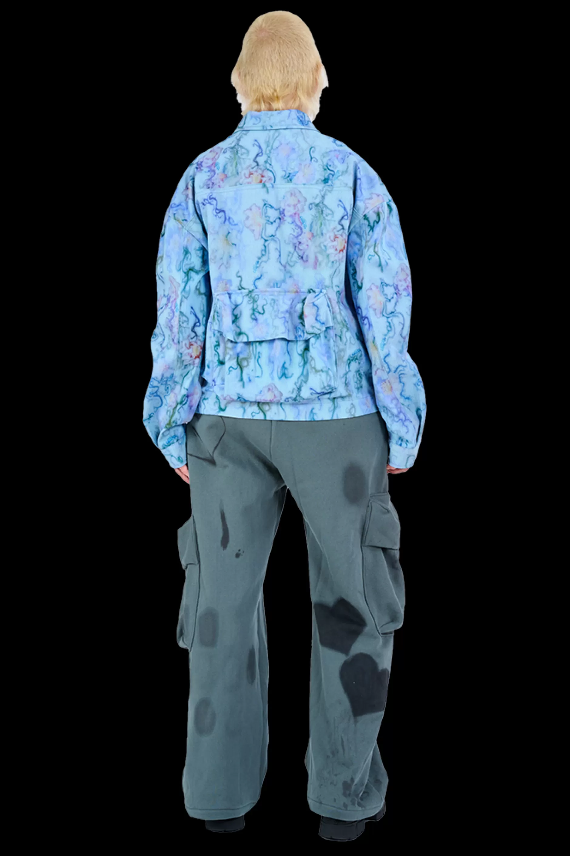 Printed cotton twill jacket with oversized cargo pockets on front and back. Two way zipper.Collina Strada’s AI-generated Blue Thorn print.