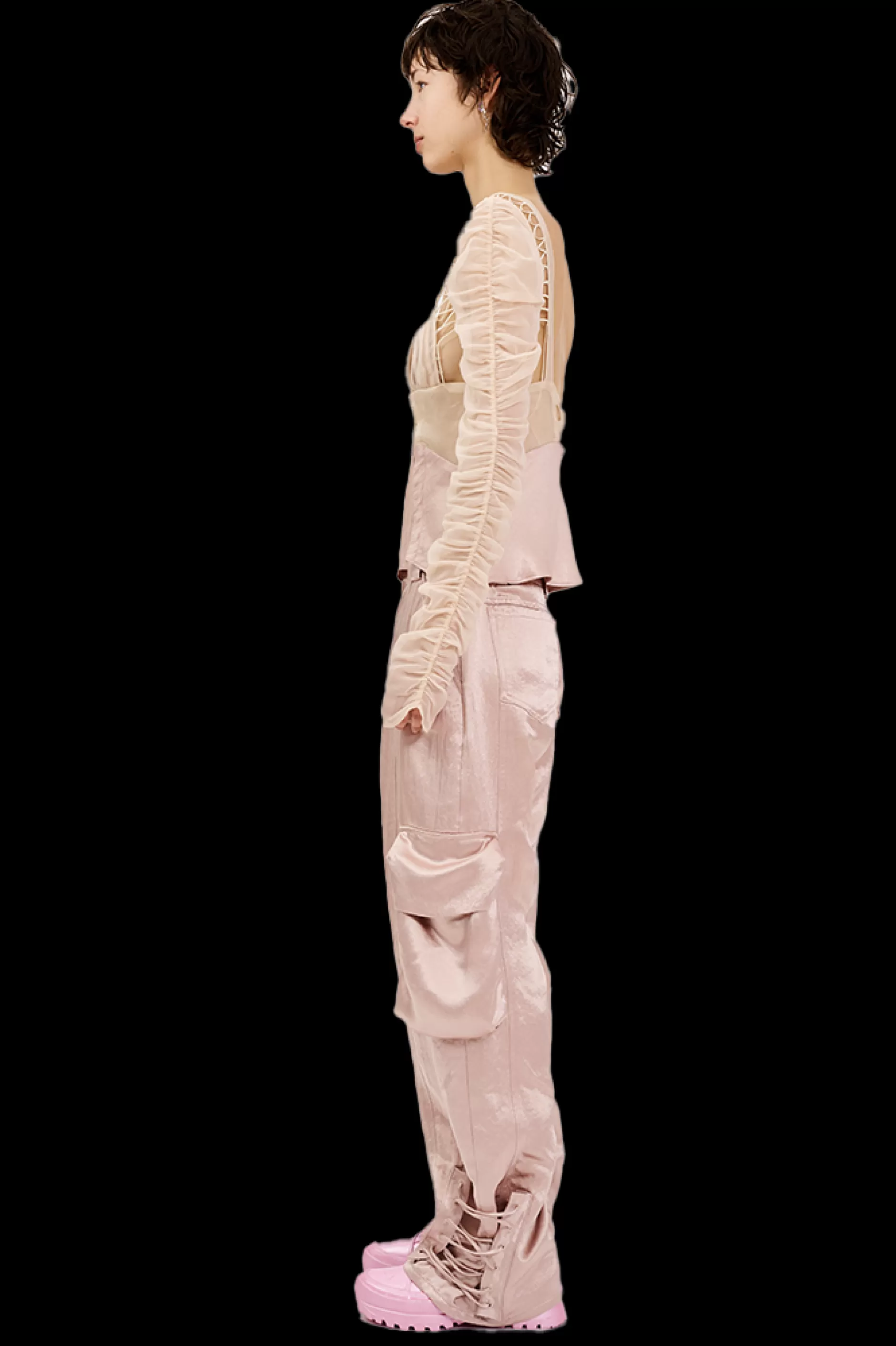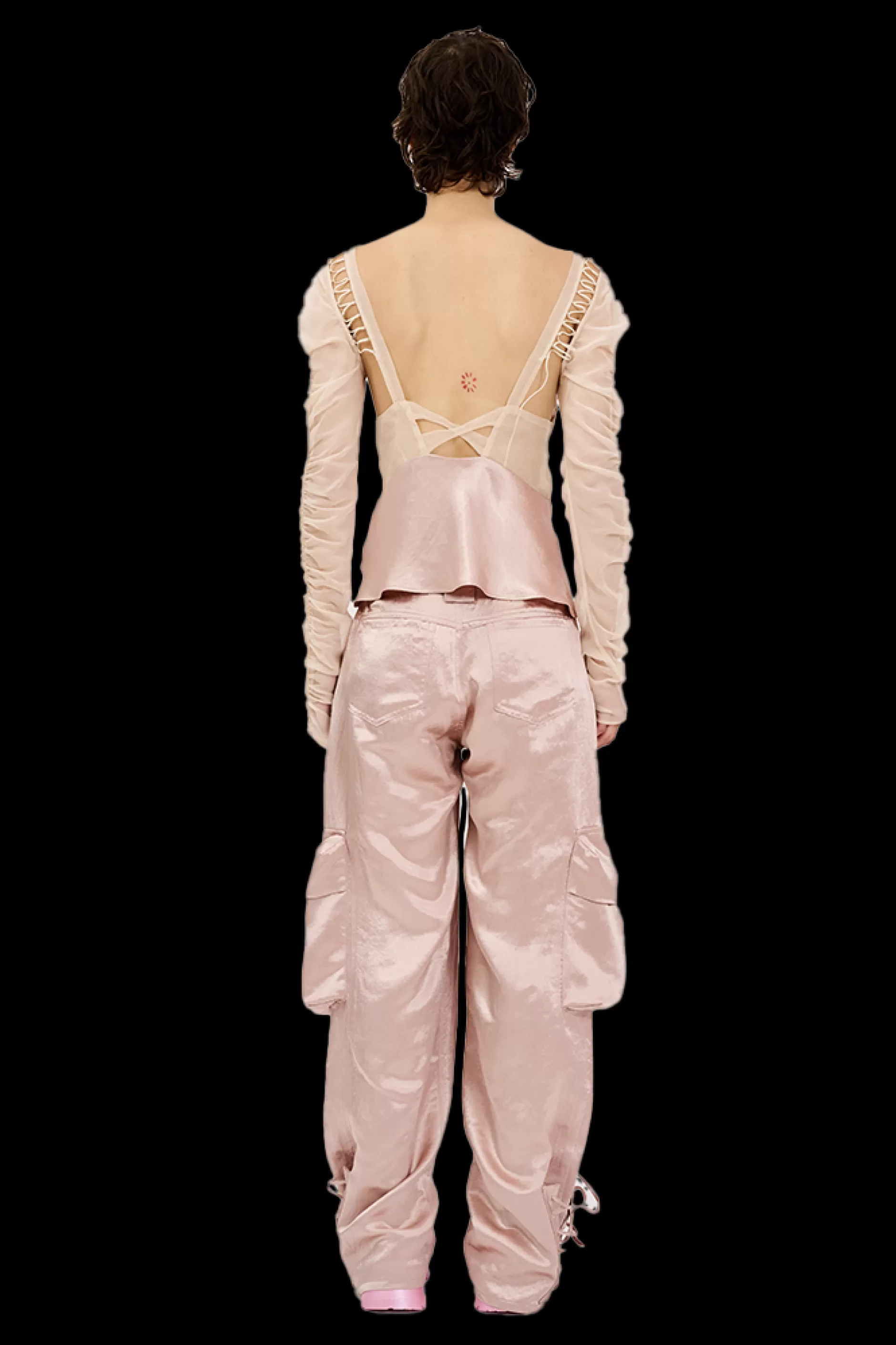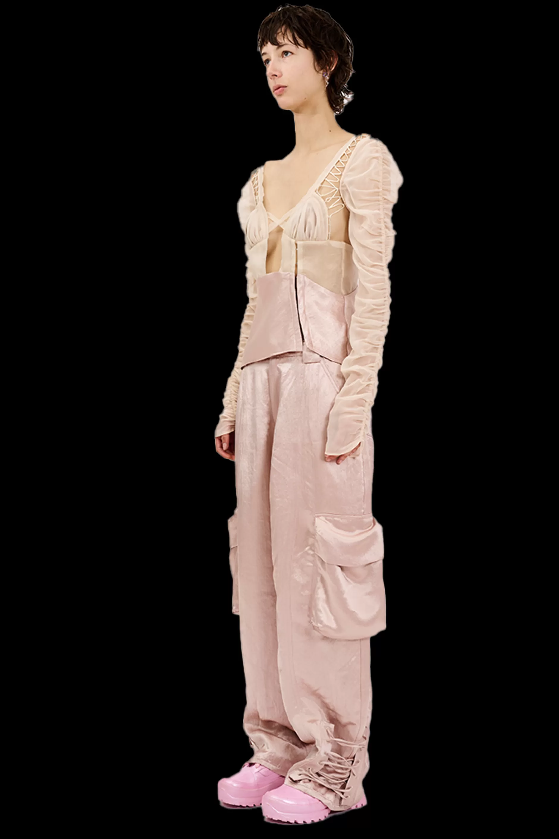 Long sleeve lace up top with chiffon sleeves. Satin and organza body. Hook and eyes up the front.