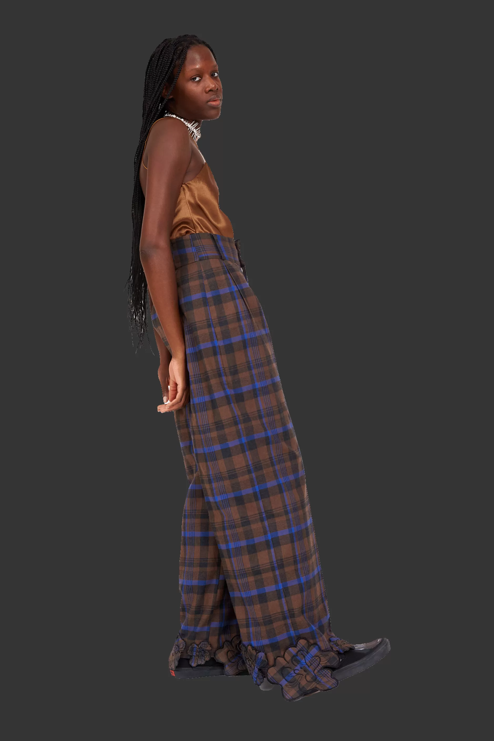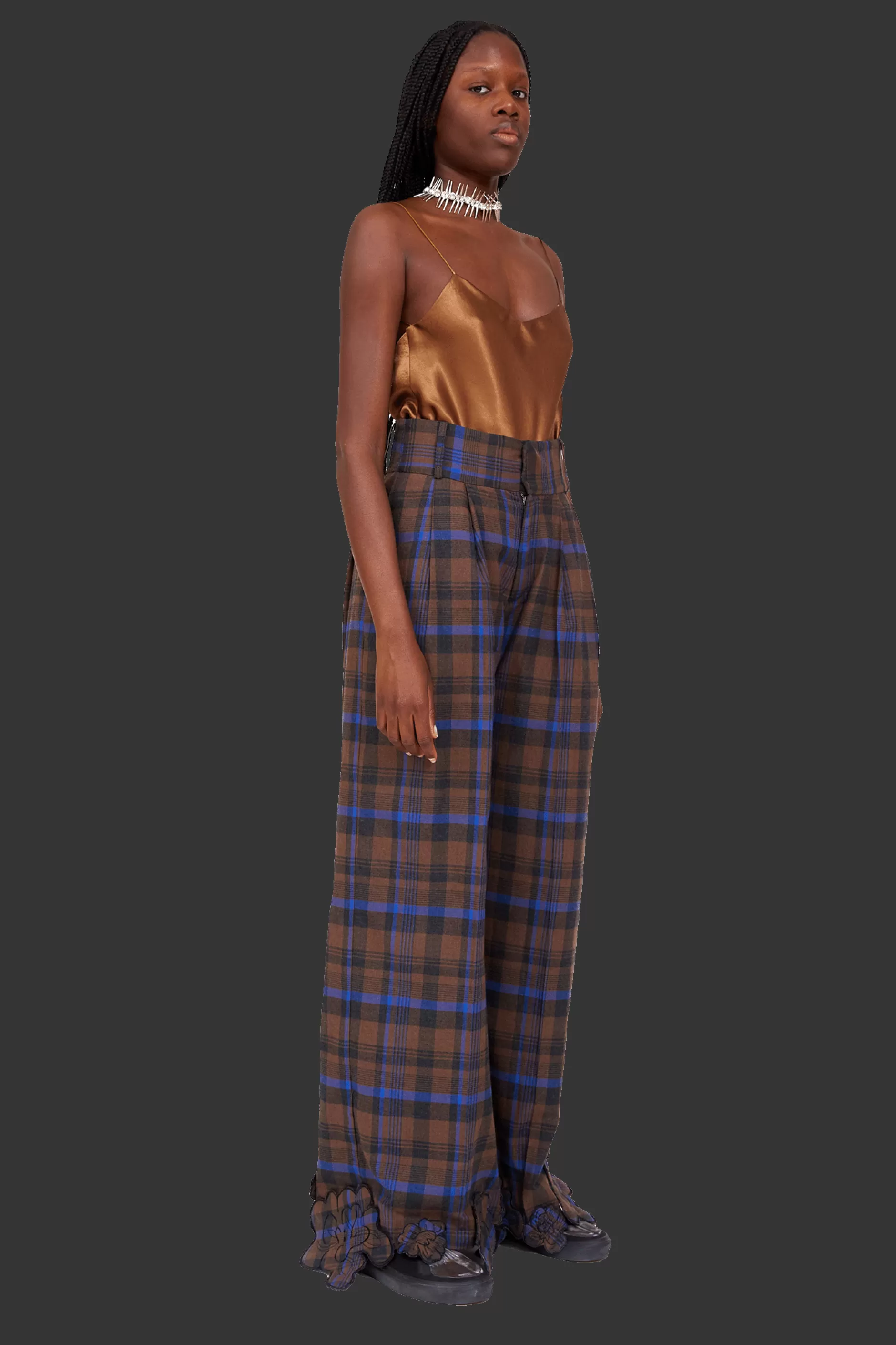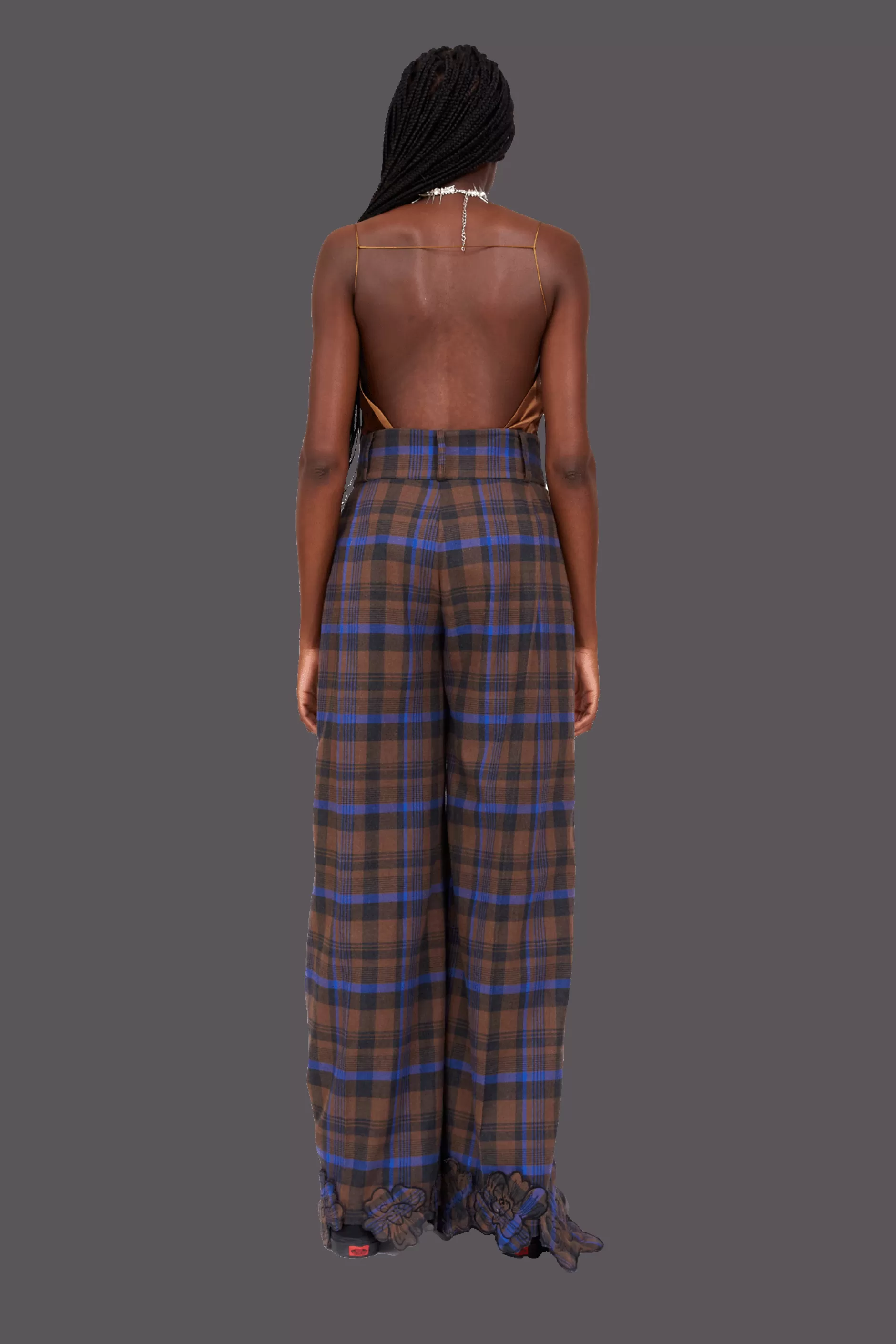 High waisted trouser with embroidered flowers at the hem. Pleat front, extra wide waistband, fully lined. Complete the suit with the Ribbit Blazer and Bunny Button Up.
