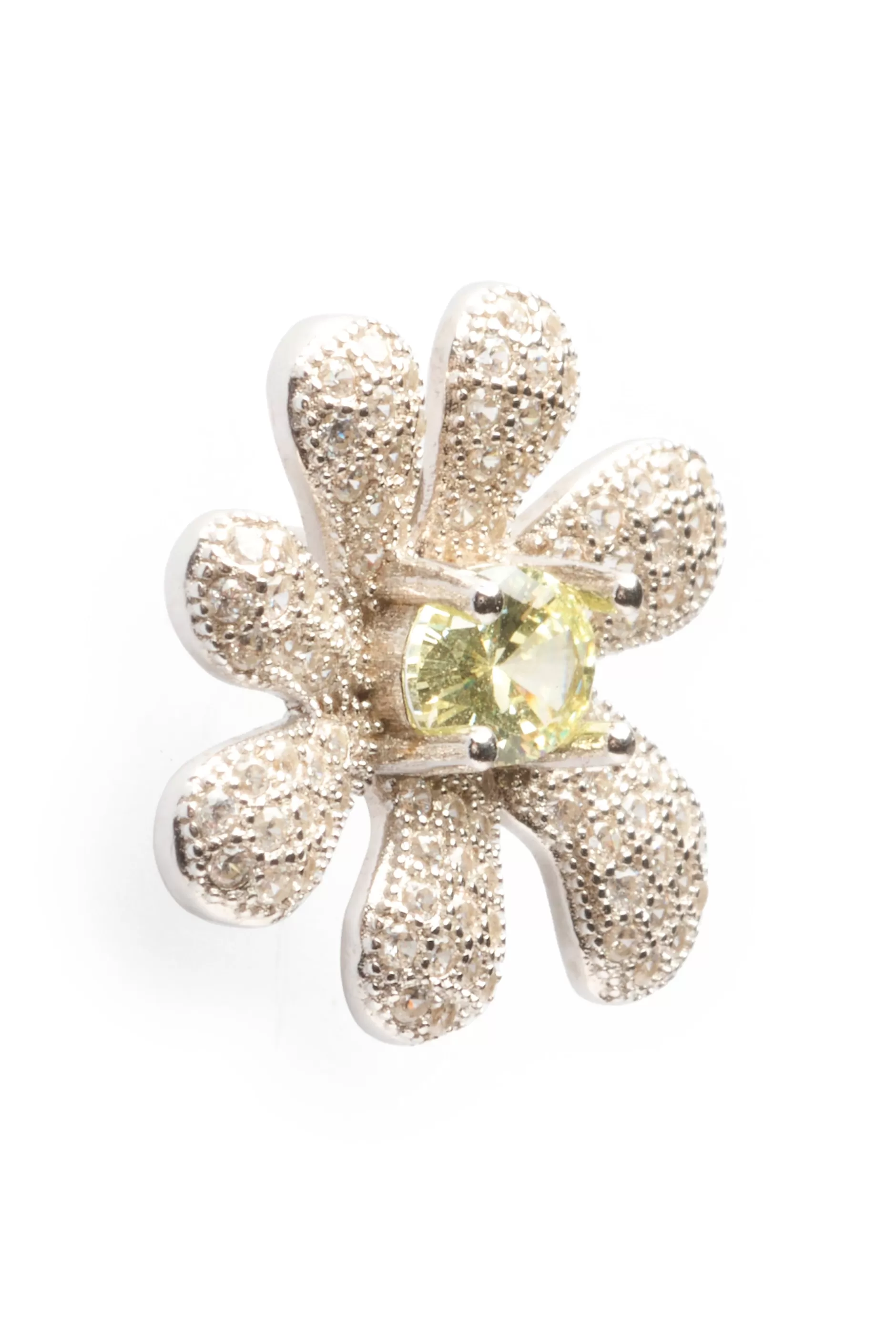 Sterling silver flower blossom earring encrusted in clear rhinestones with a canary gemstone in the center. Stud back. 100% sterling silver