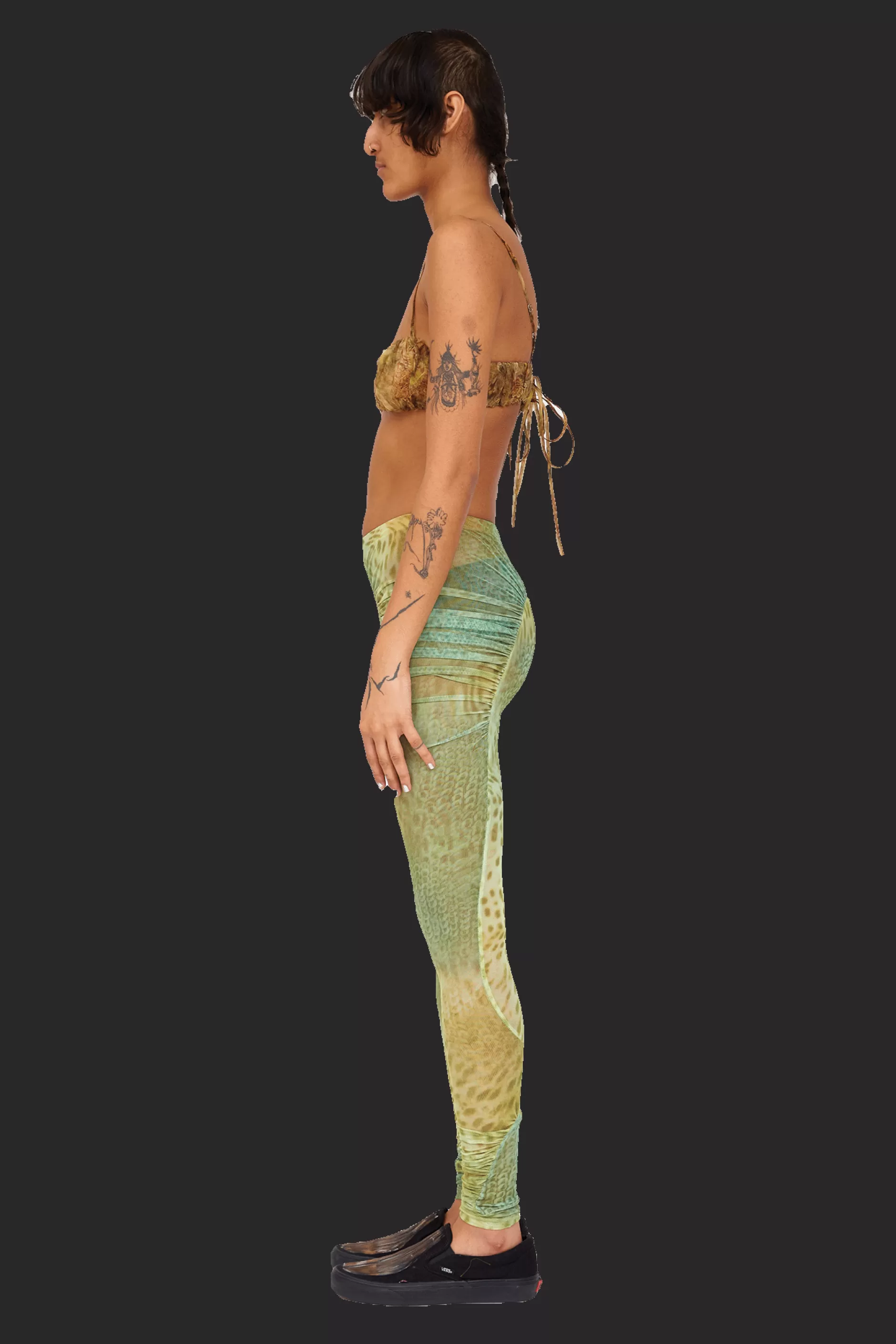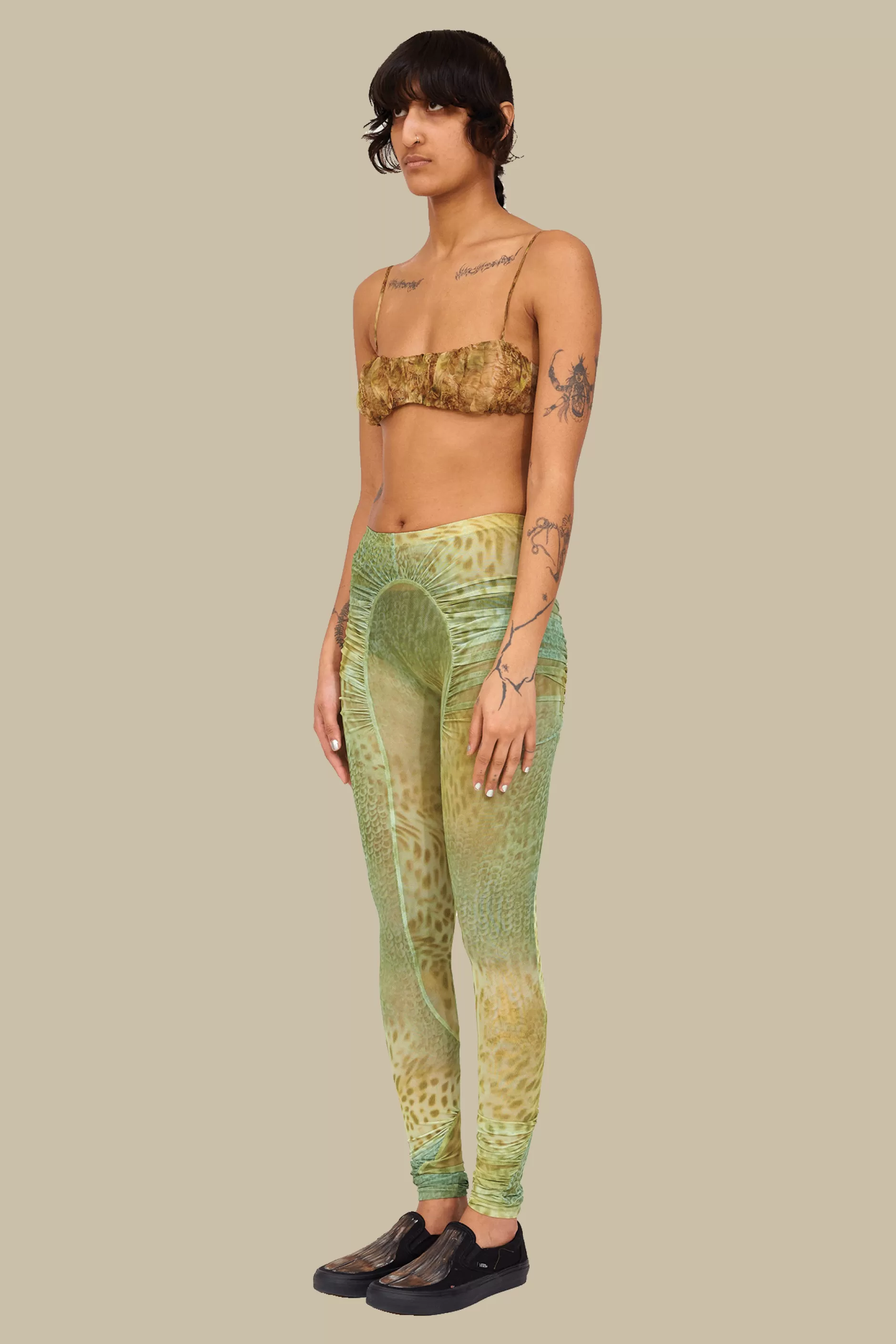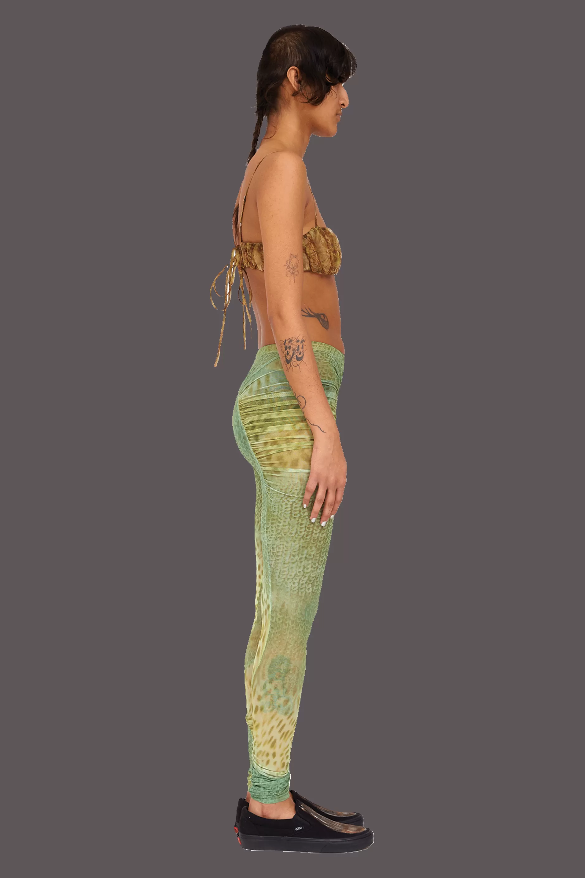 Mesh legging with ruched arc details in our Green Gecko print. Elastic waist.