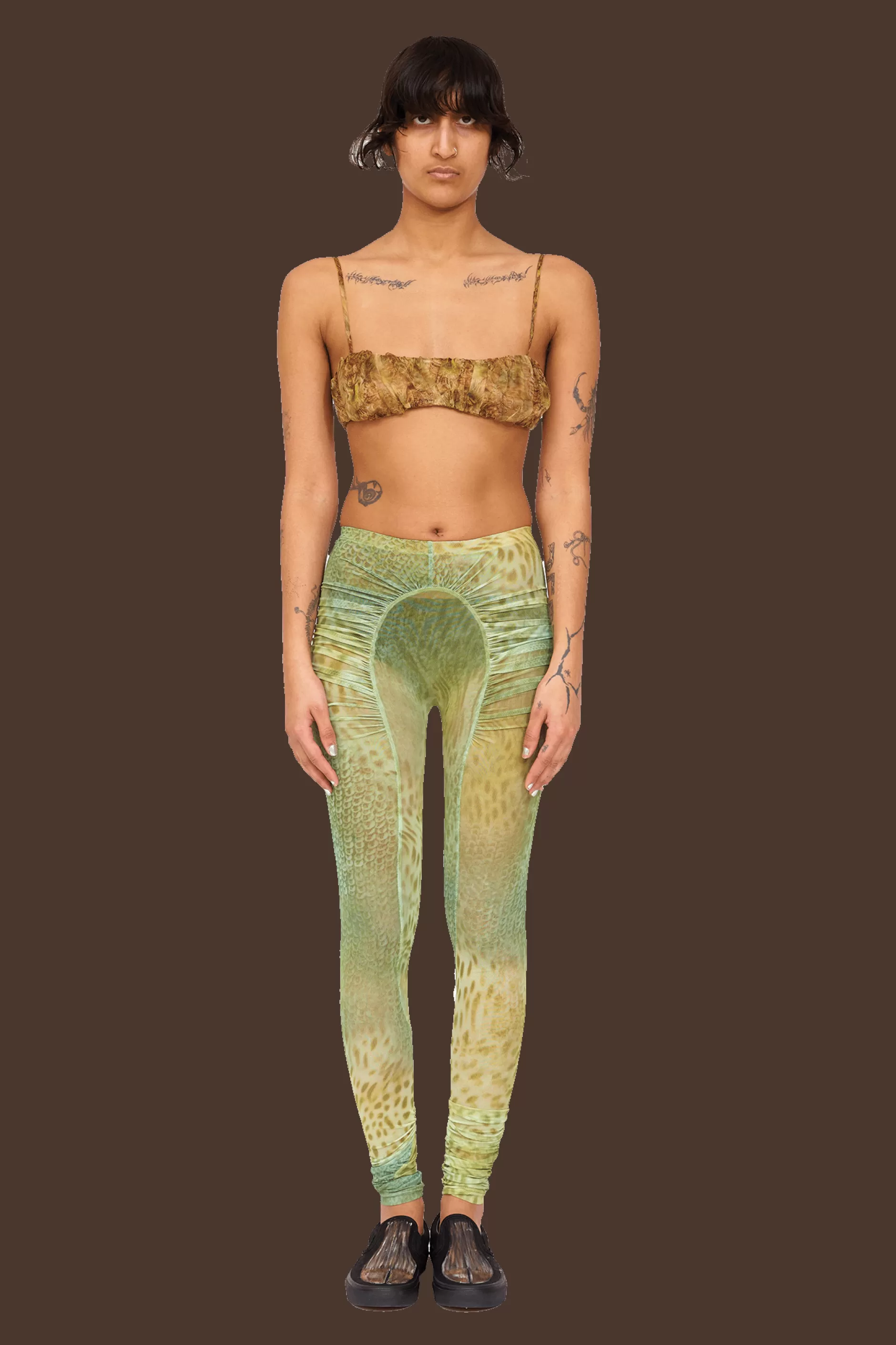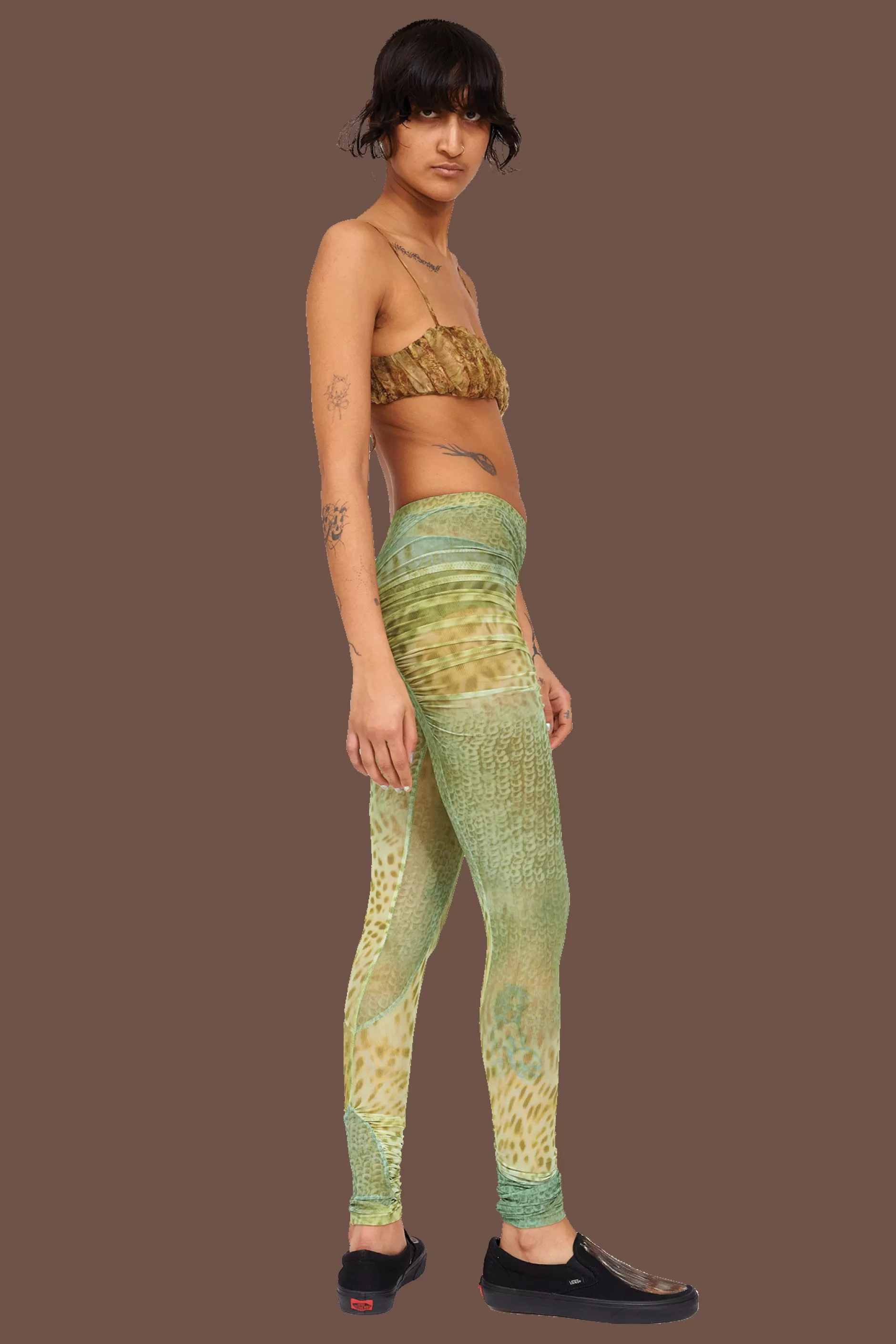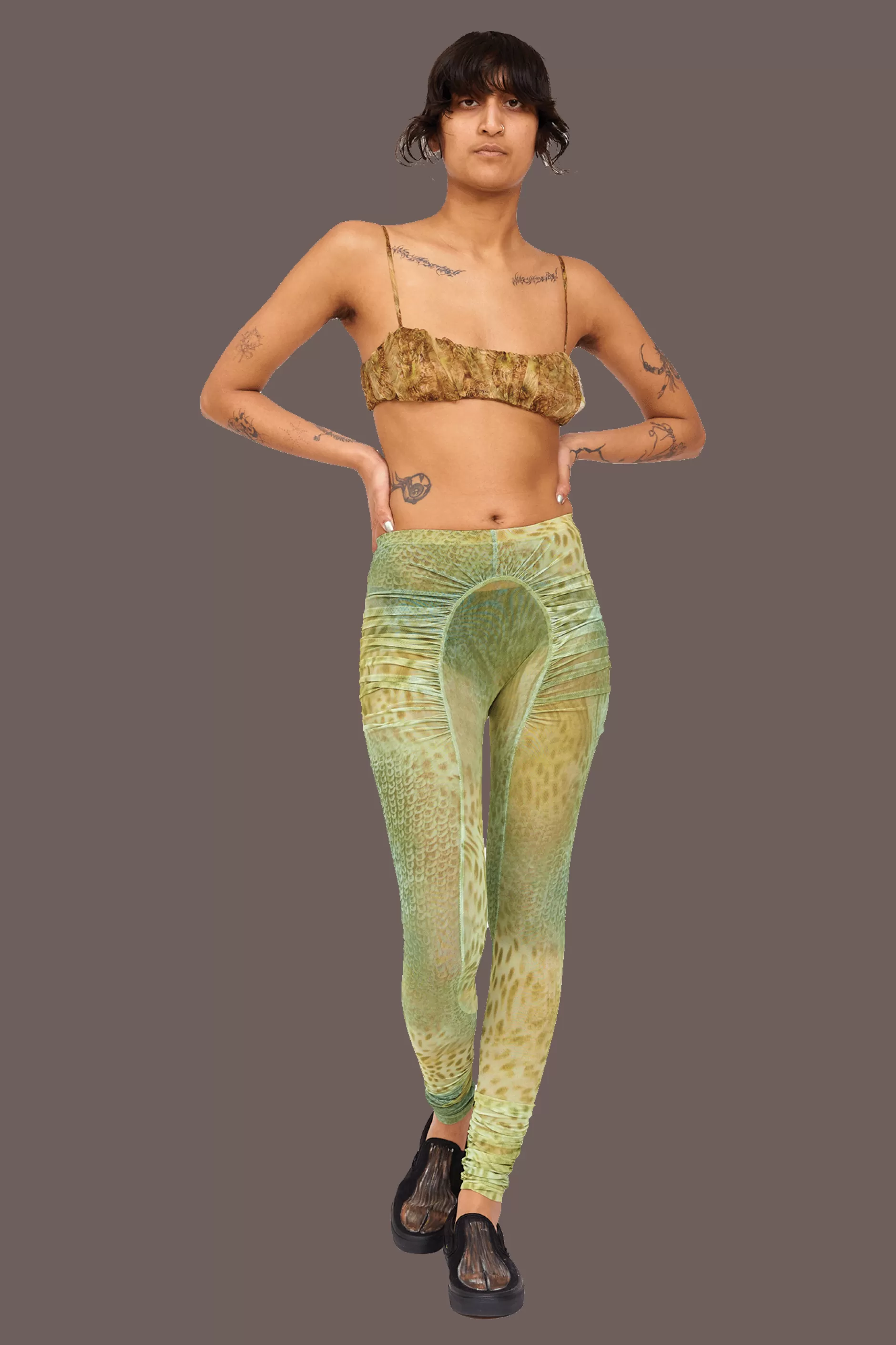 Mesh legging with ruched arc details in our Green Gecko print. Elastic waist.