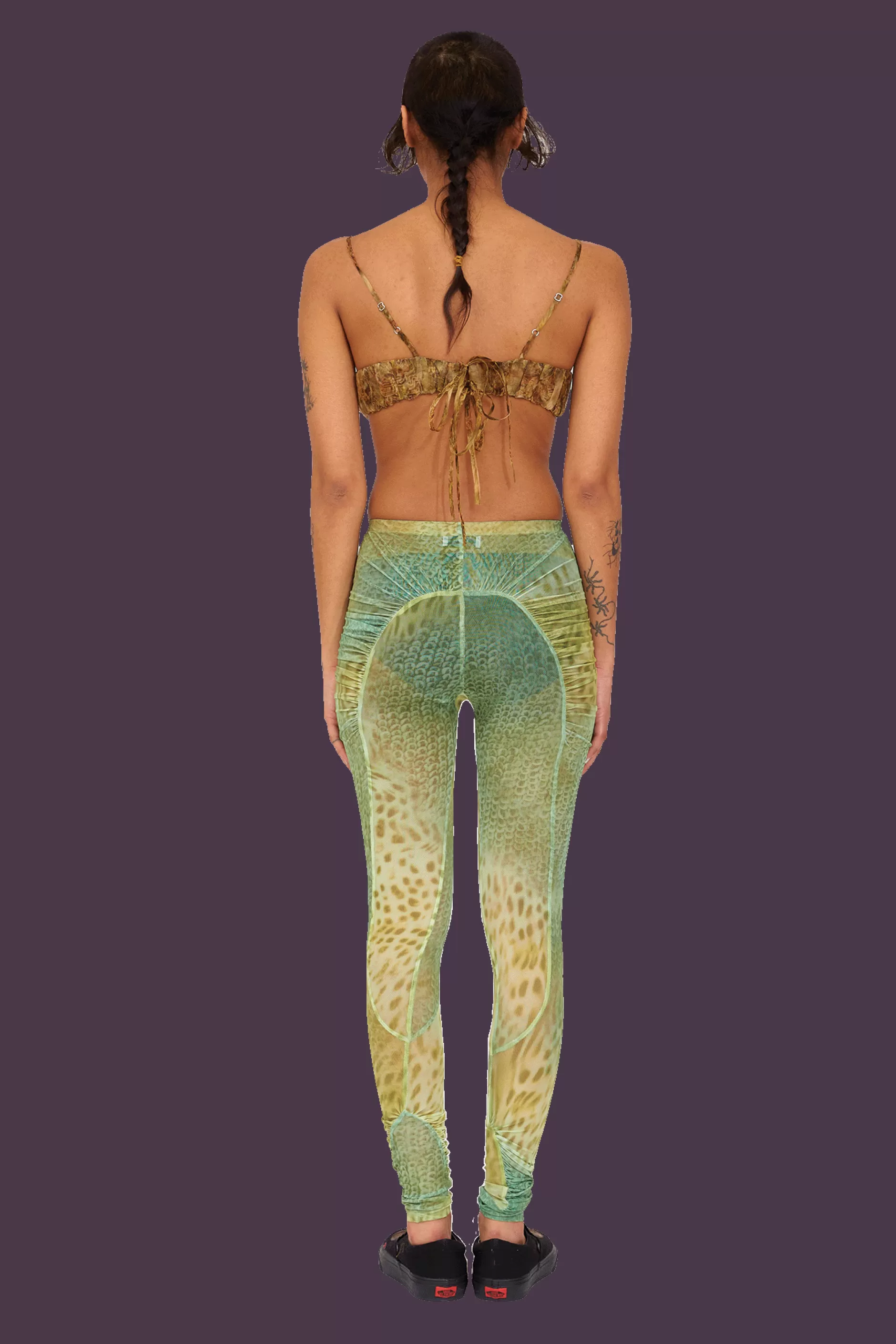 Mesh legging with ruched arc details in our Green Gecko print. Elastic waist.Made in New York95% Polyester 5% SpandexMod…