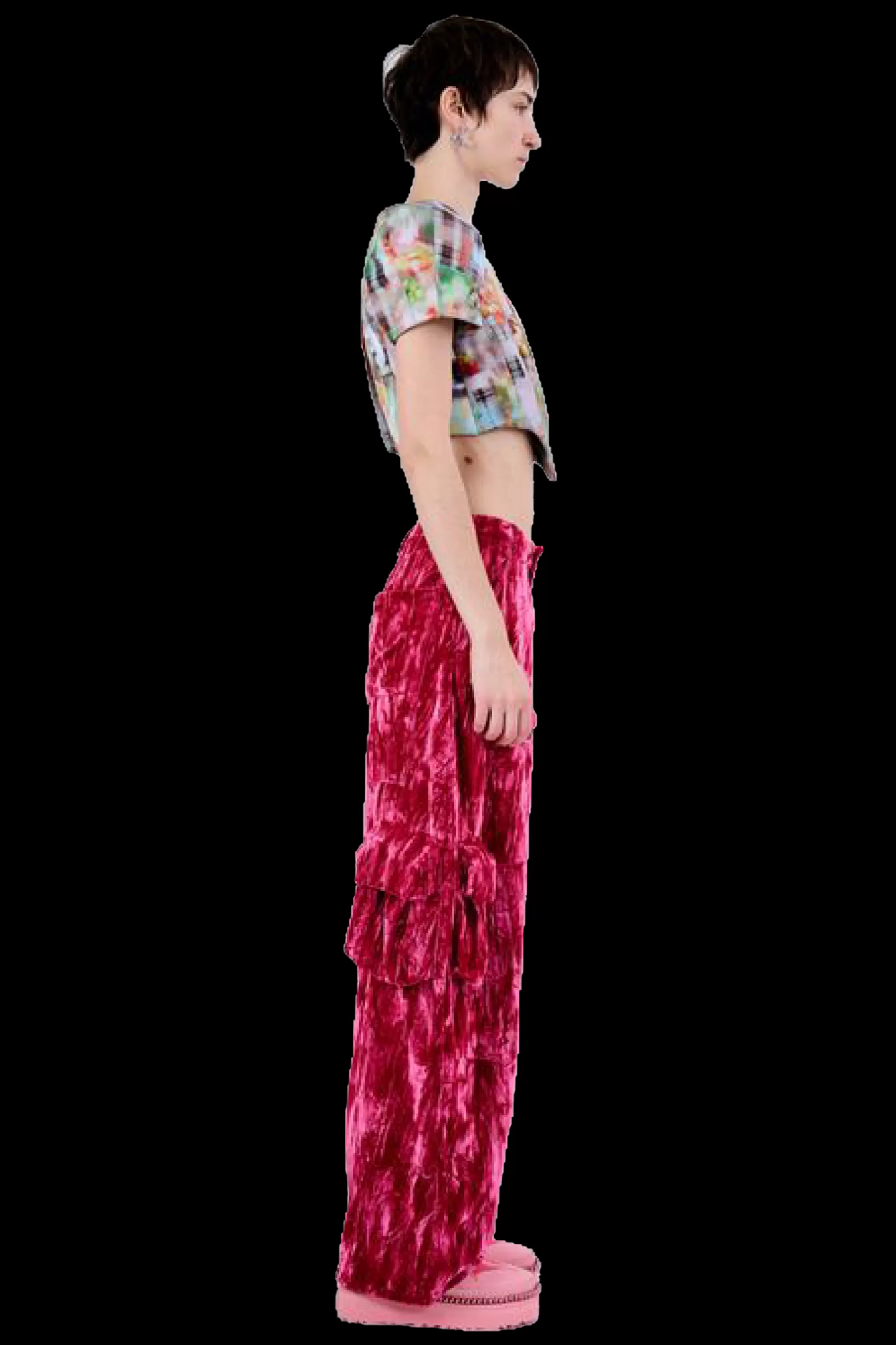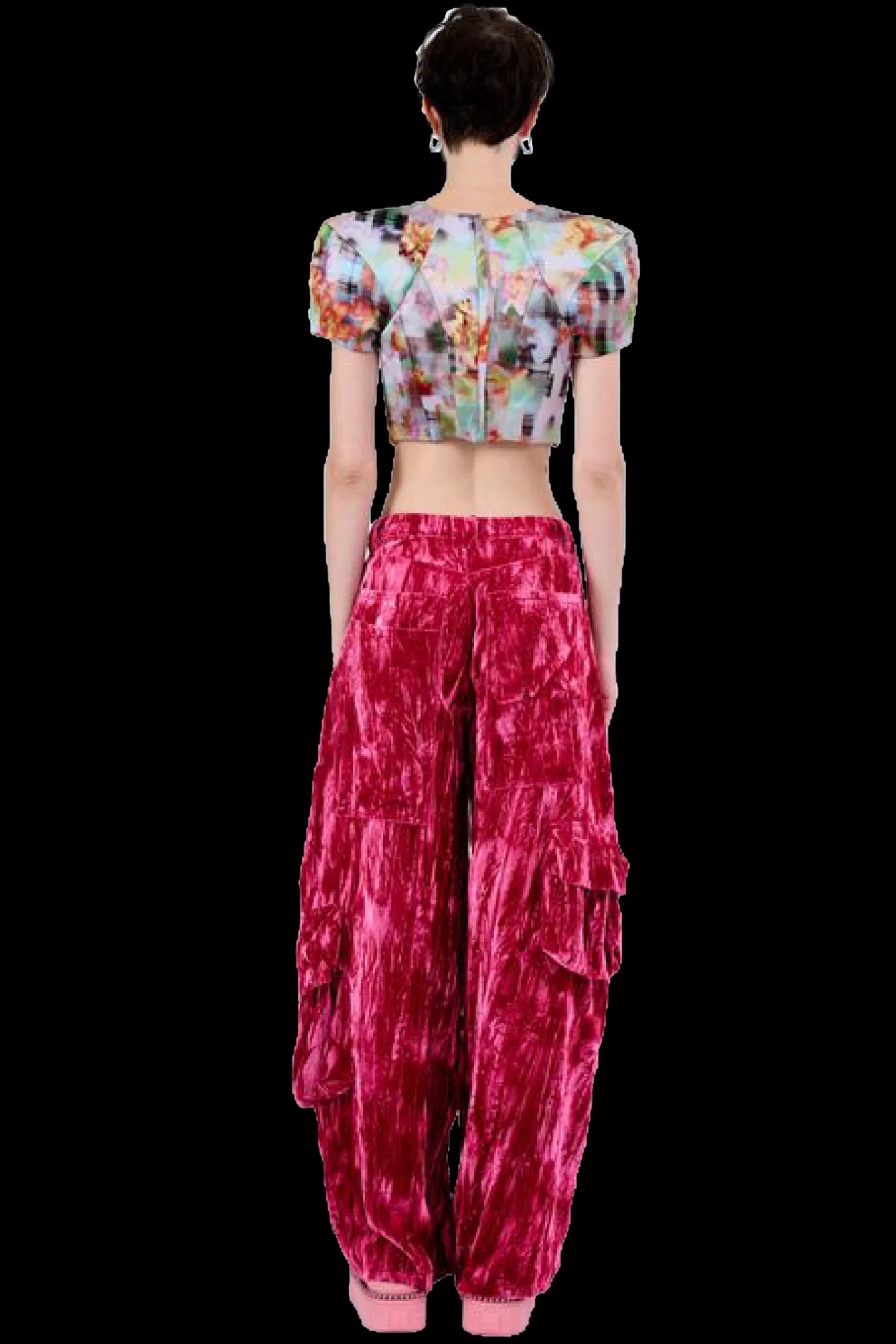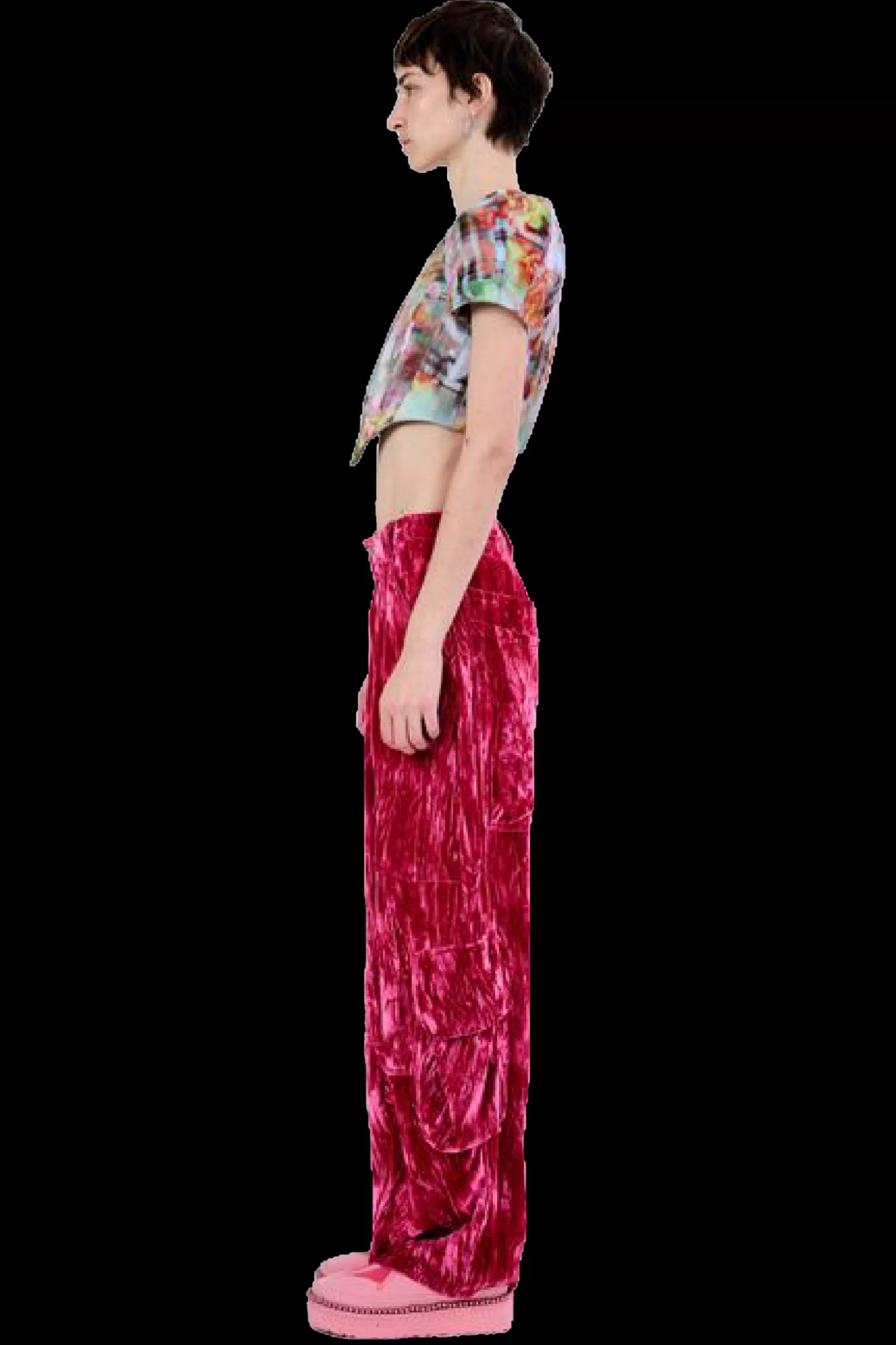 Relaxed fit with mid rise, wide leg cargo pant with large pockets all over so you can go out without a bag! Crushed velvet.