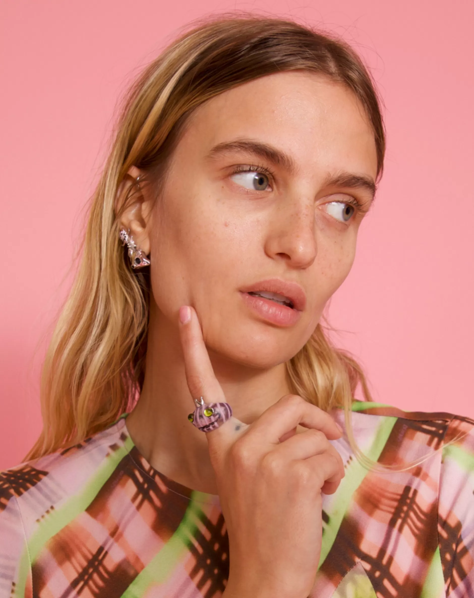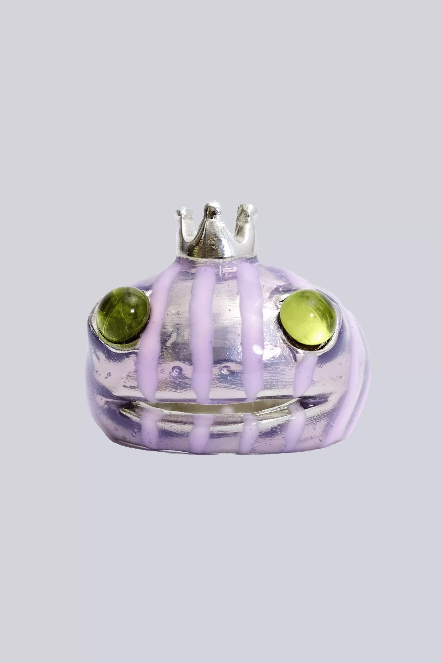 Lilac stripe frog ring with green eyes. Hand enameled.