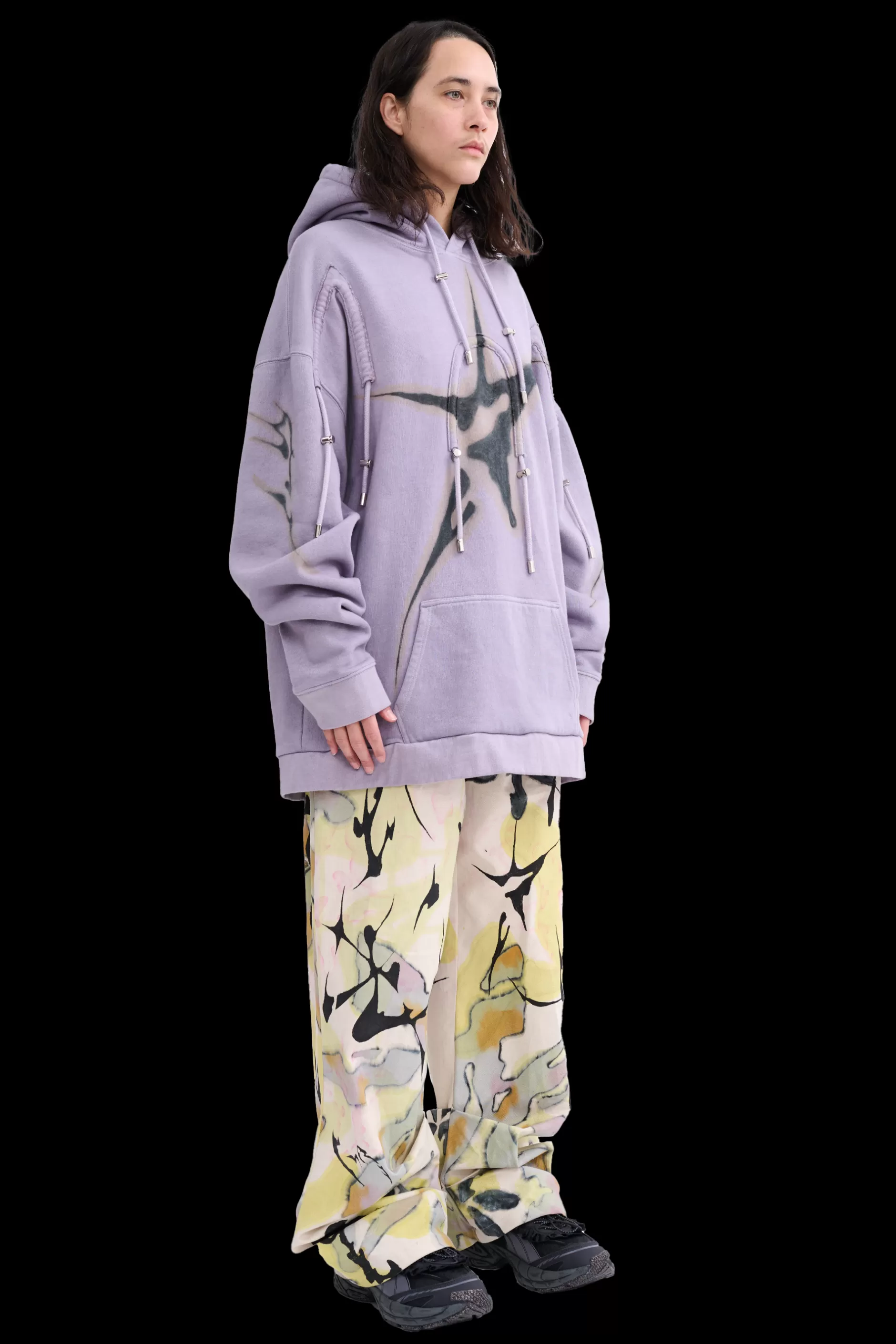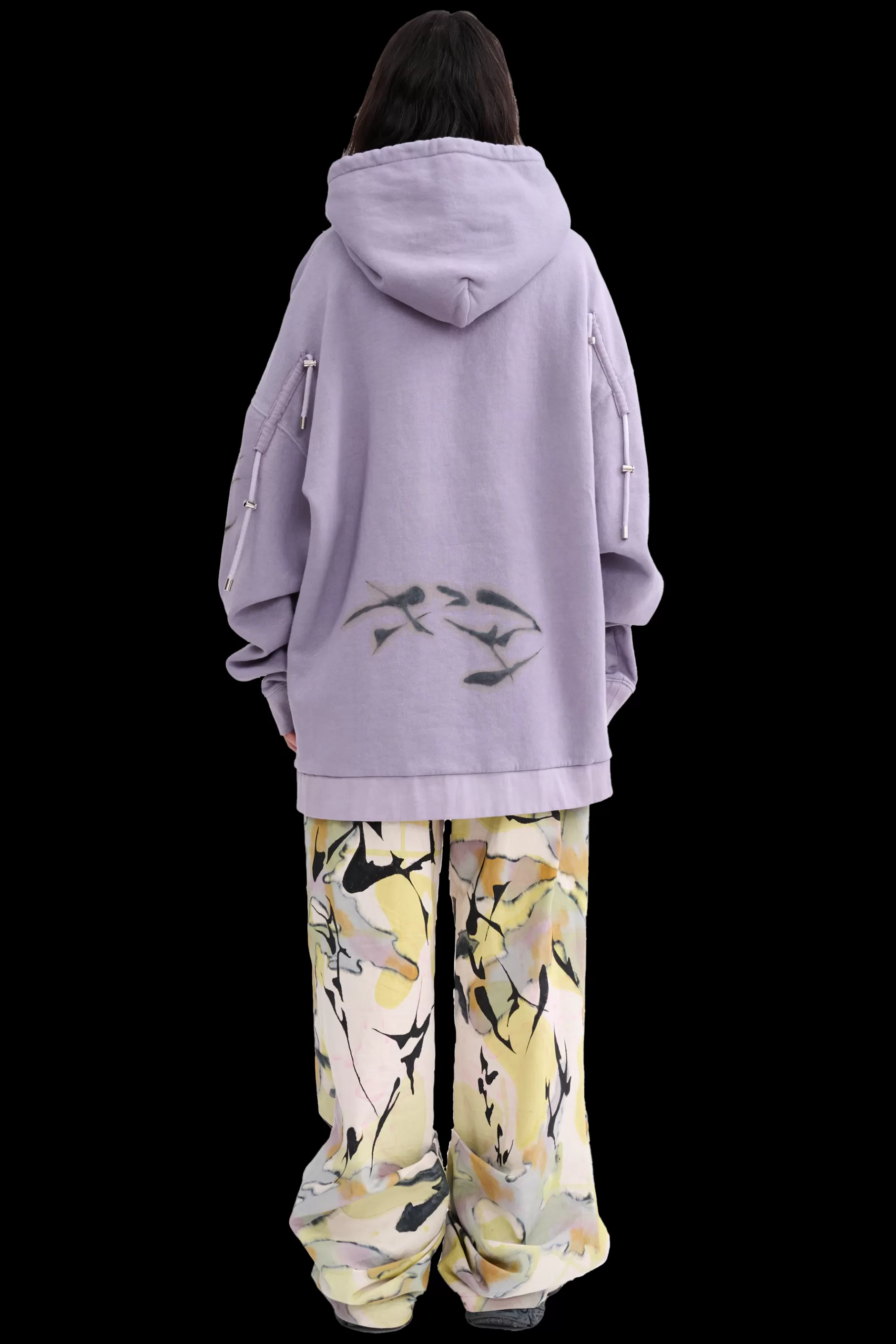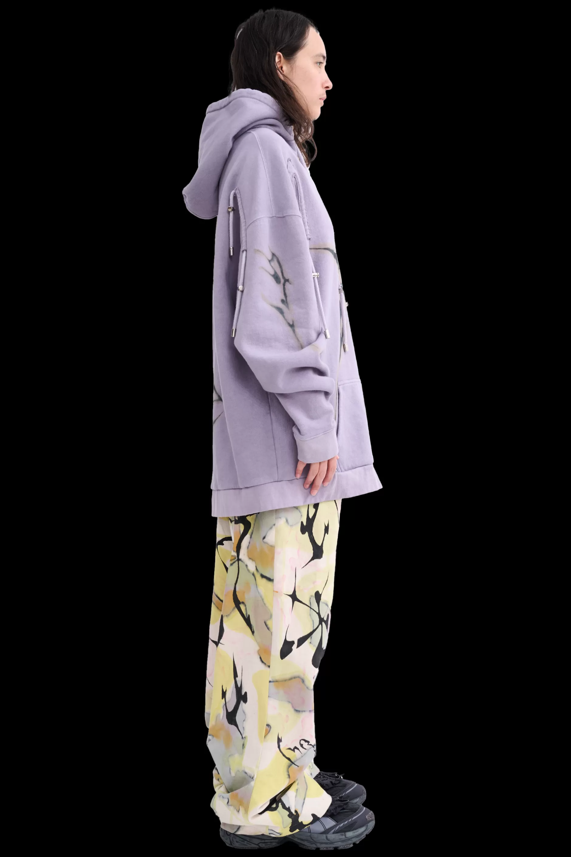 Hoodie with arc drawstrings on center front and sleeves. Hand painted design front and back. Can we worn loose or scrunched.