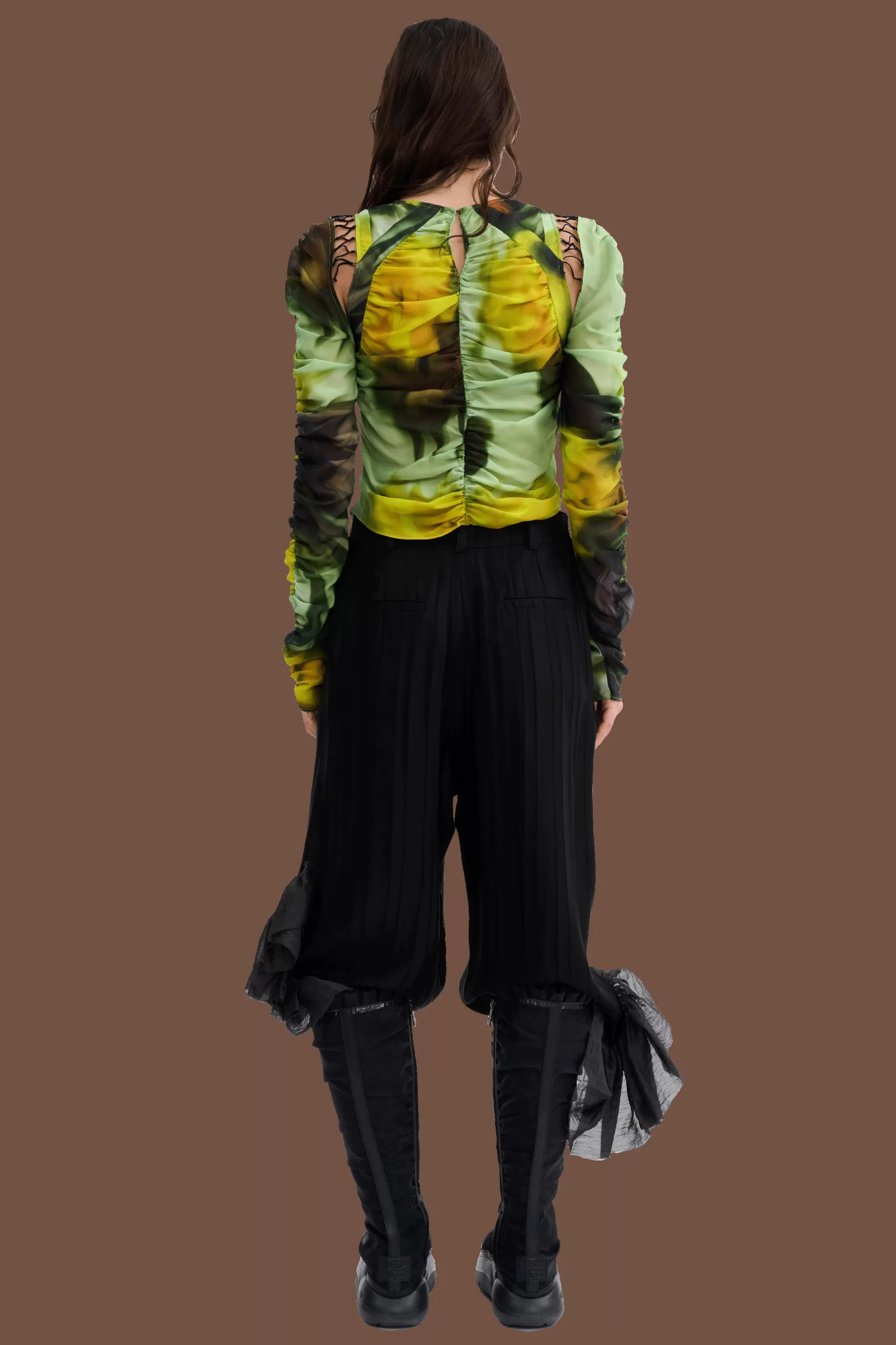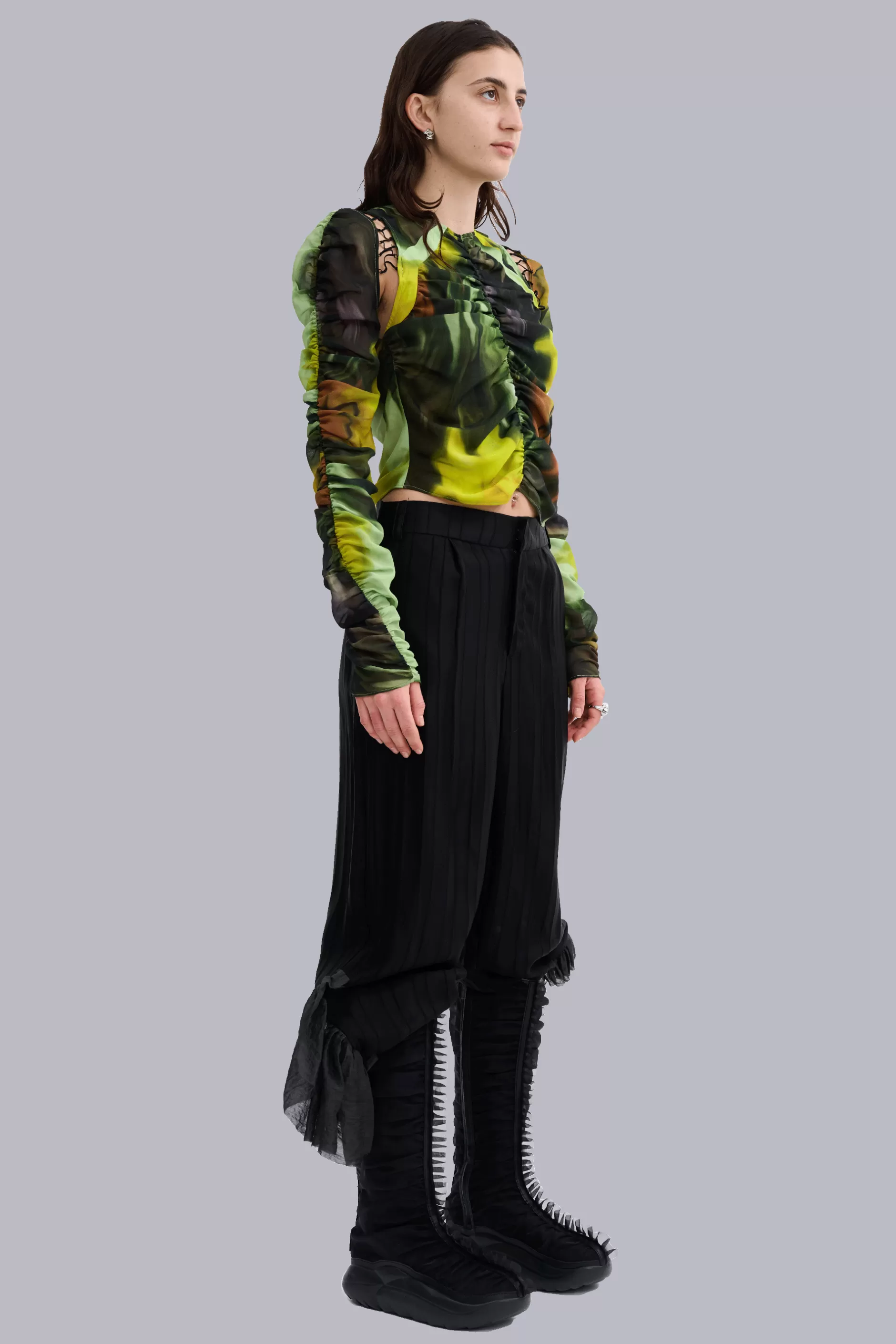 Long sleeve ruched top. Chiffon bodice and sleeves with lacing detail at shoulder. Melting Bloom print.