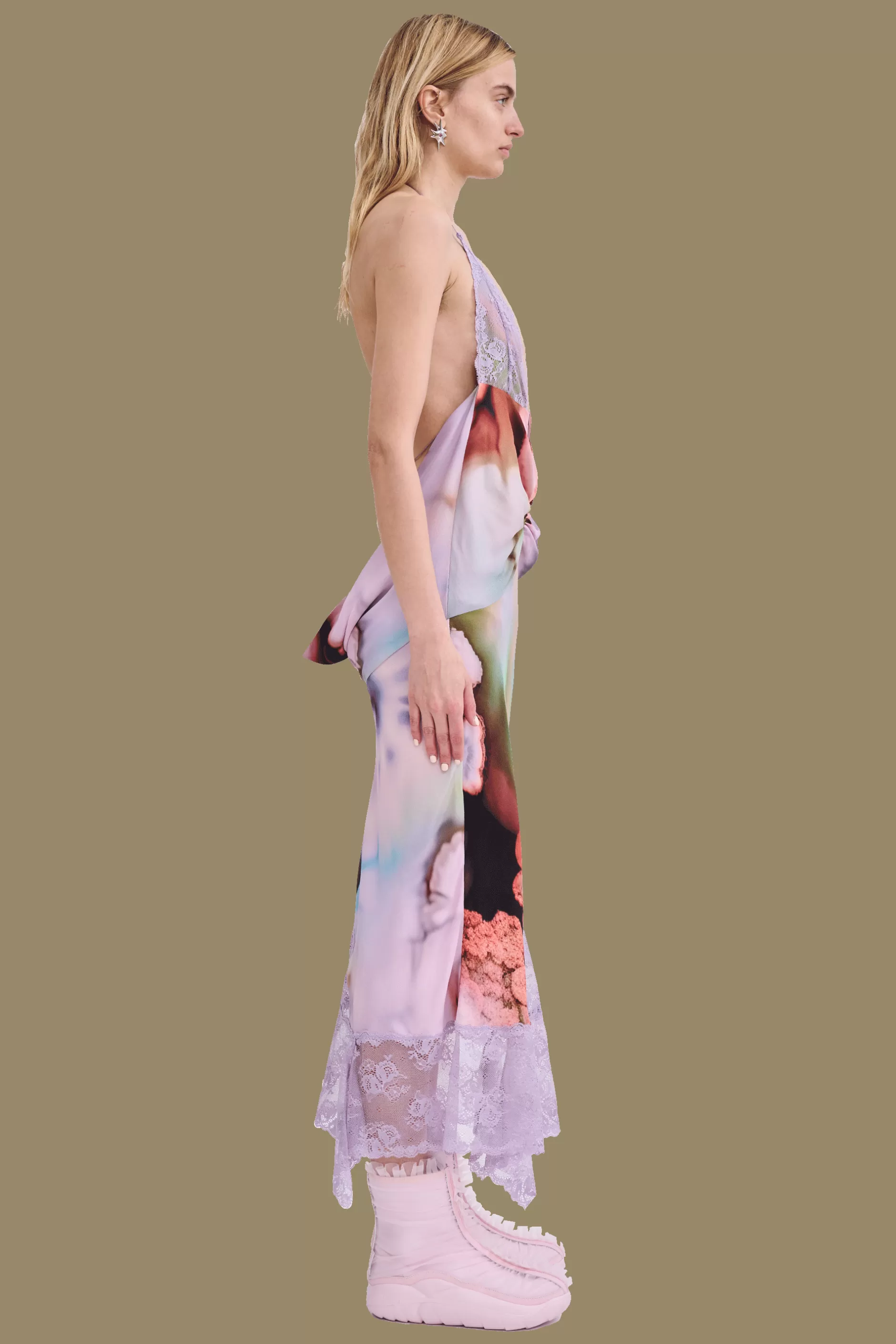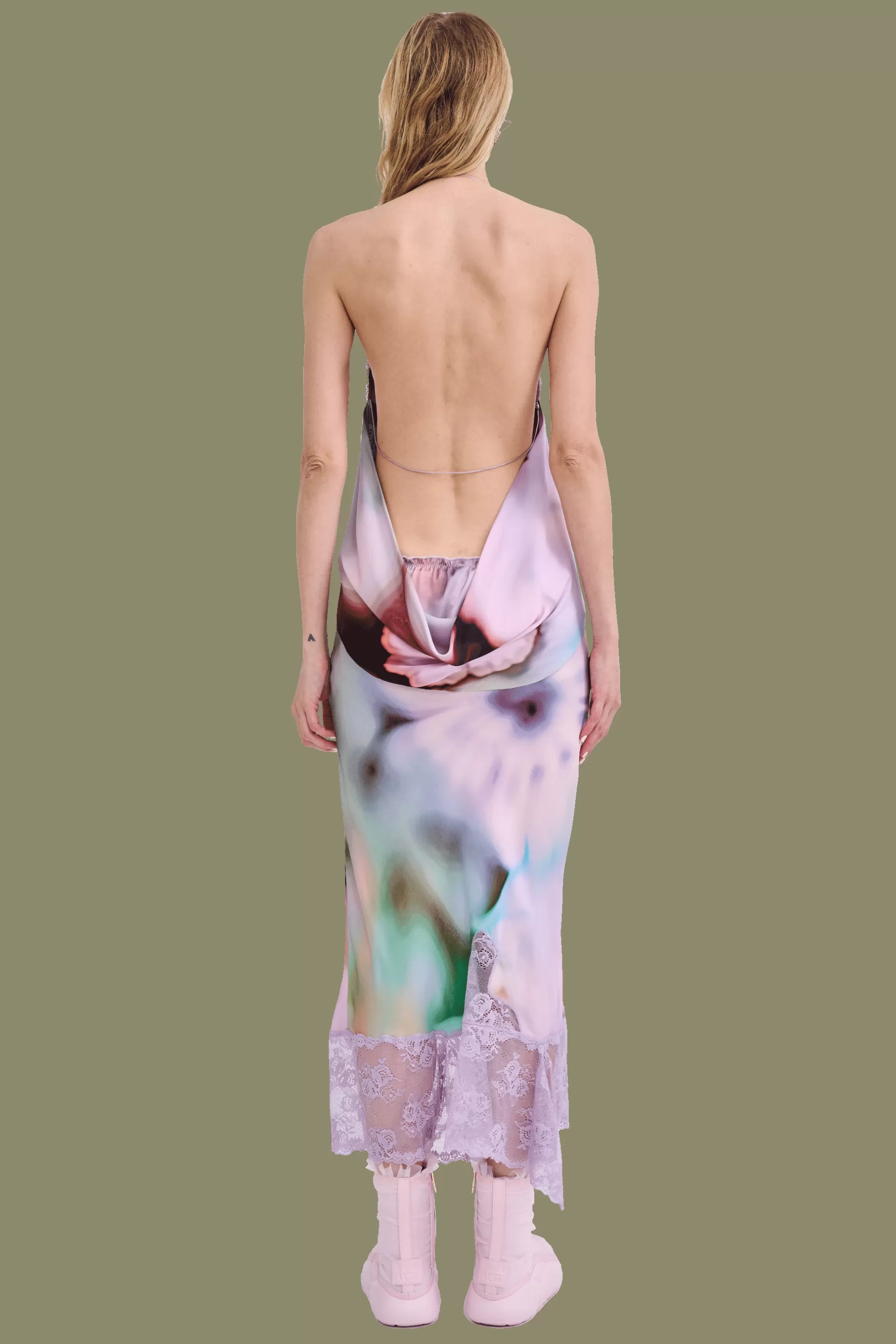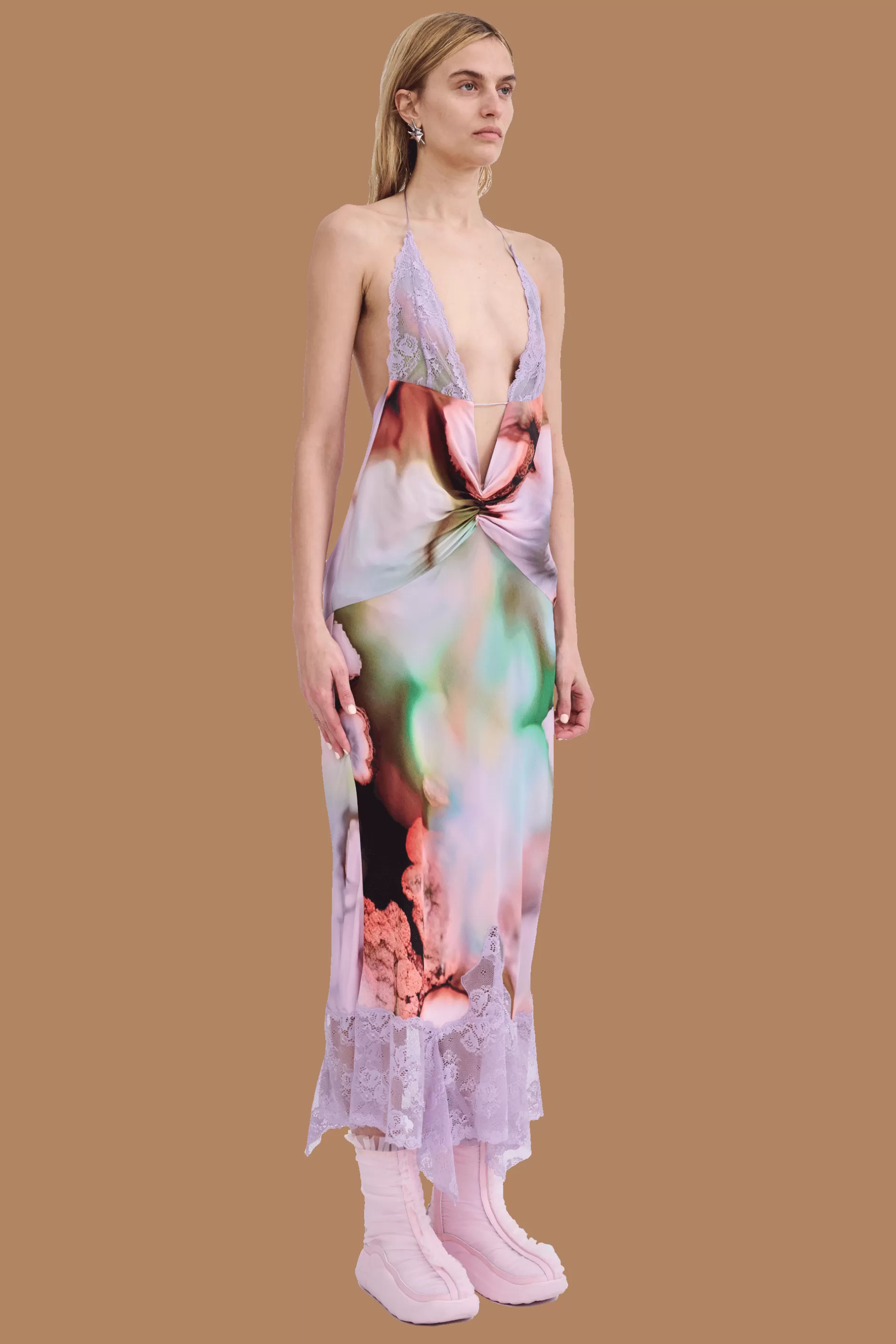 Backless, sleeveless midi slip dress. The front has a deep plunging neckline with twist knot detail at the waist, creating a gathered effect in the center. The dress combines a bold, revealing design with delicate lace details. Collina Strada’s Mold print.