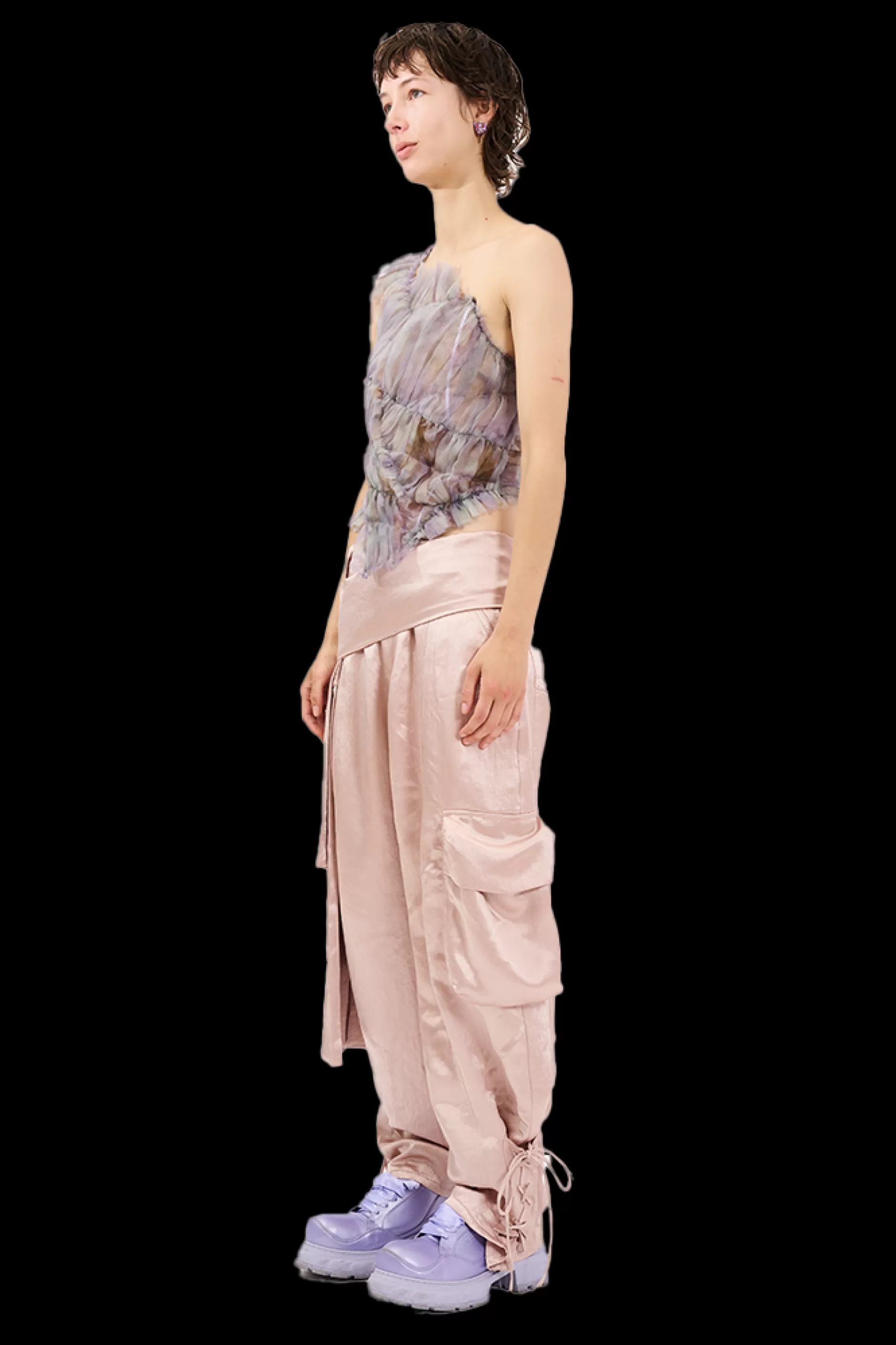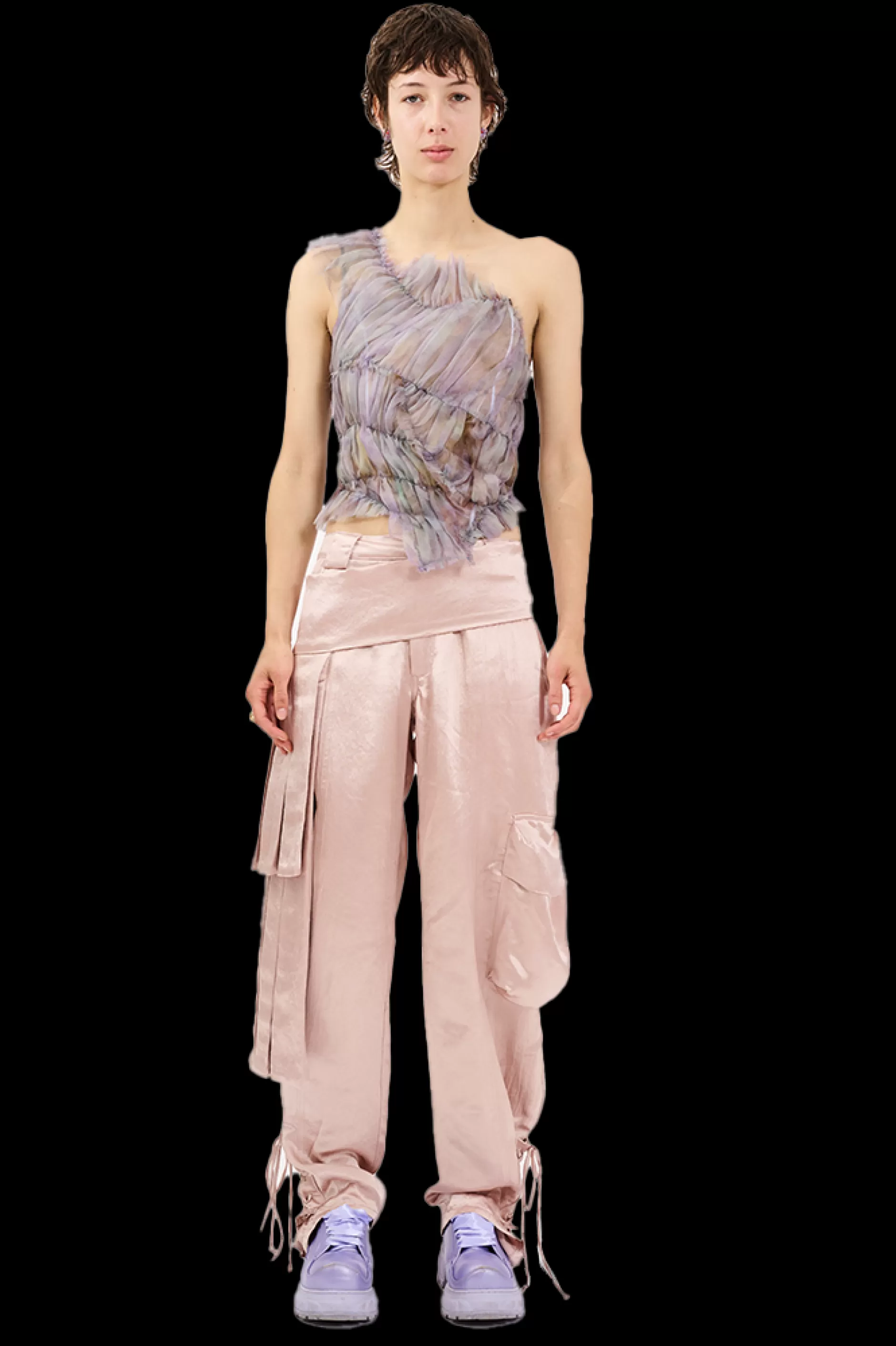 Asymmetrical ruched organza top. One shoulder, side seam zipper, boning for structure. Semi-sheer.