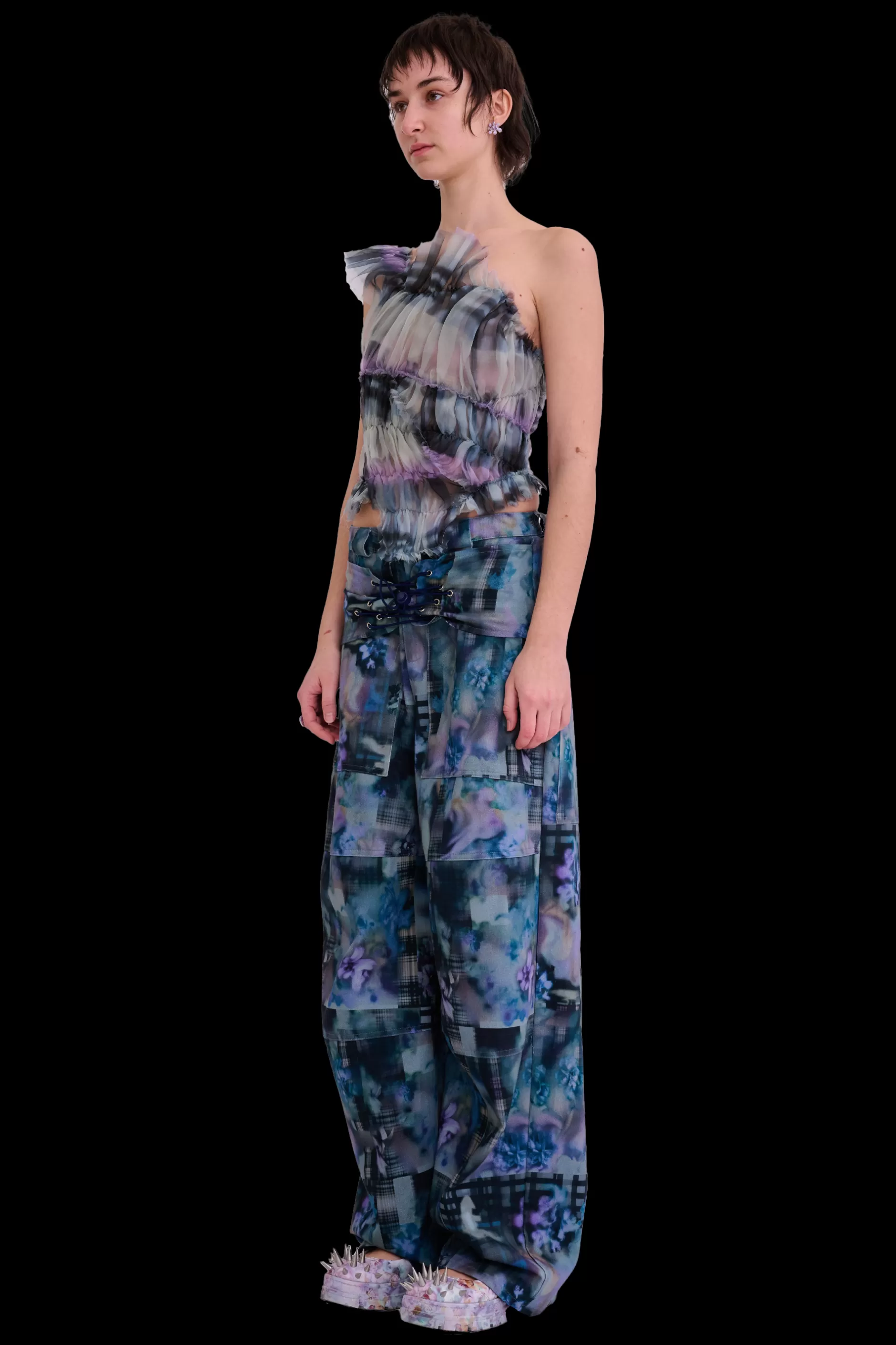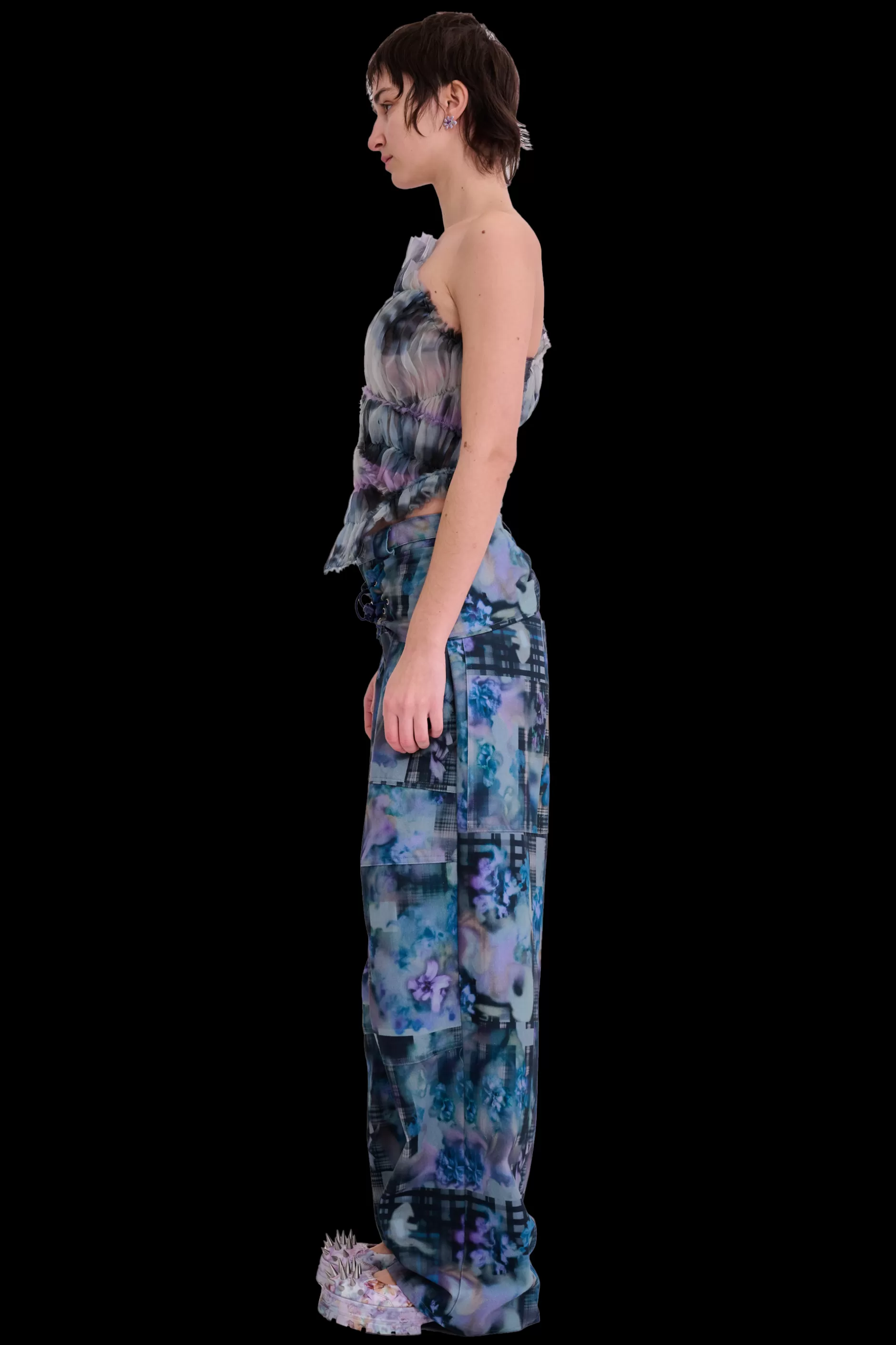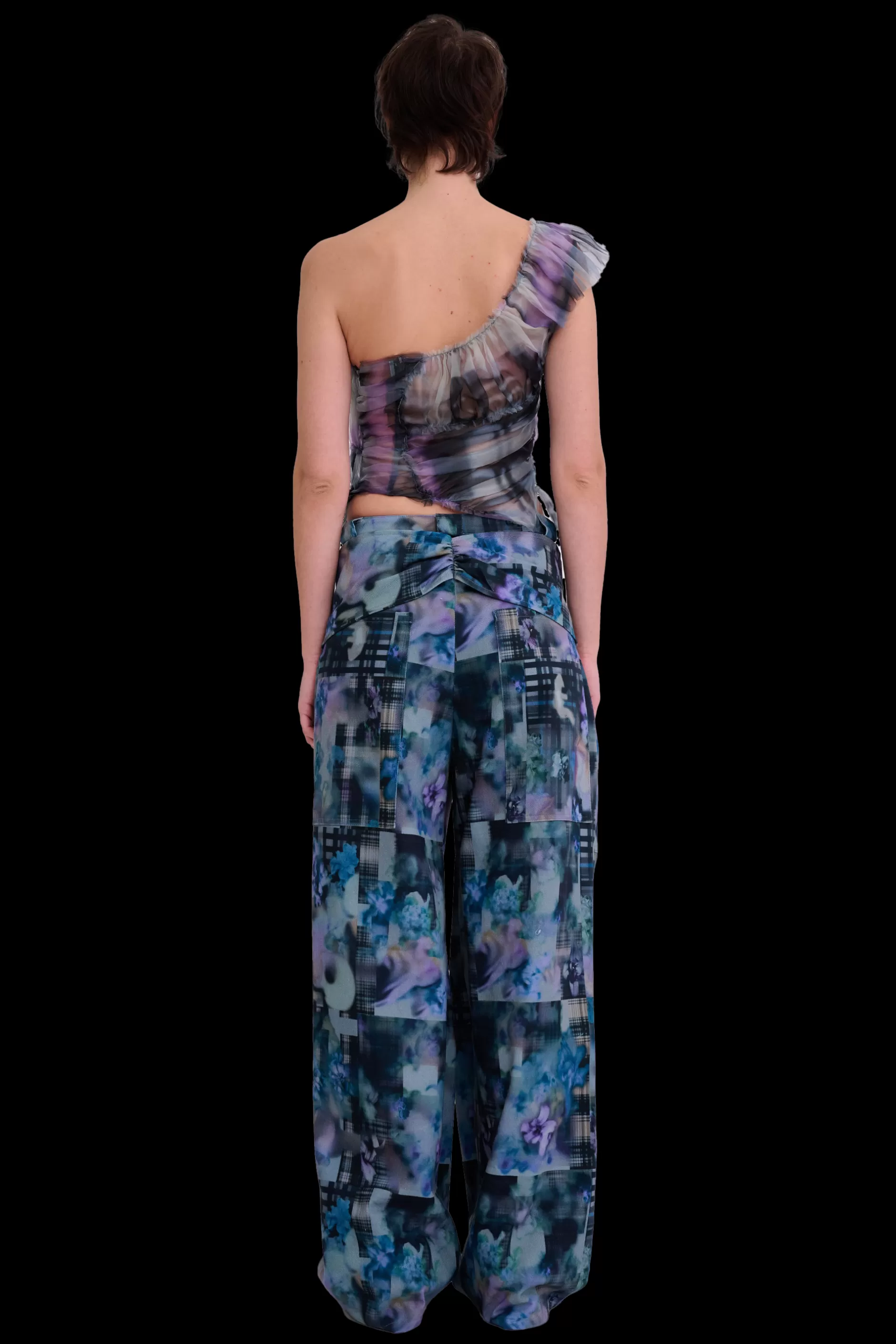 Relaxed fit with mid rise, wide leg pant. Bungee belt closure with hidden side zipper. Collina Strada’s Navy Garden Blur printed denim.
