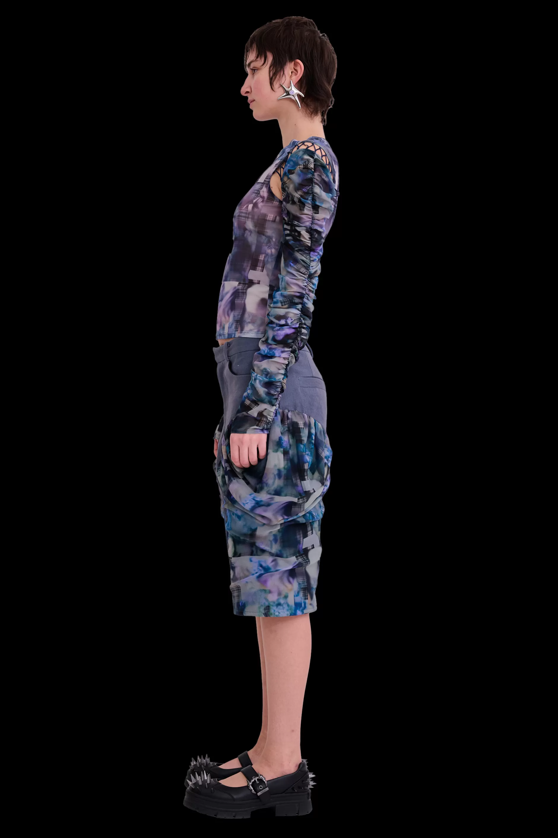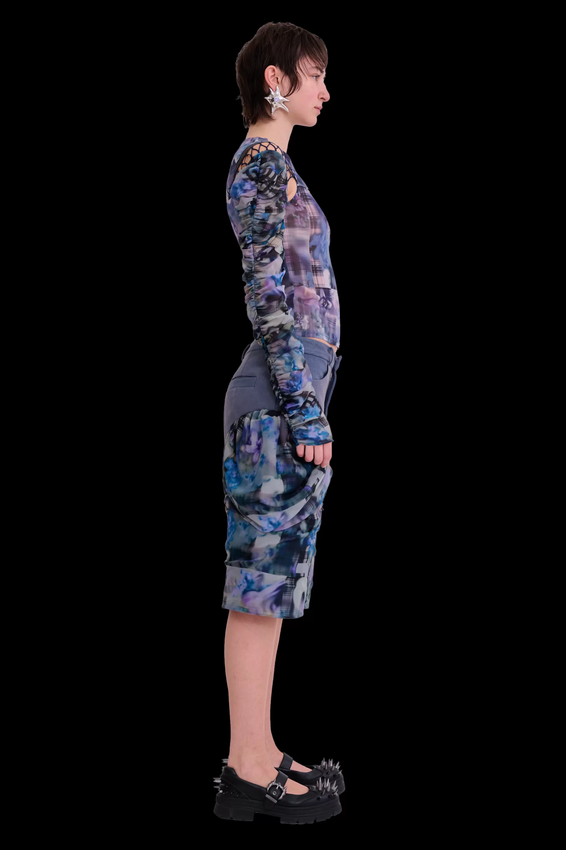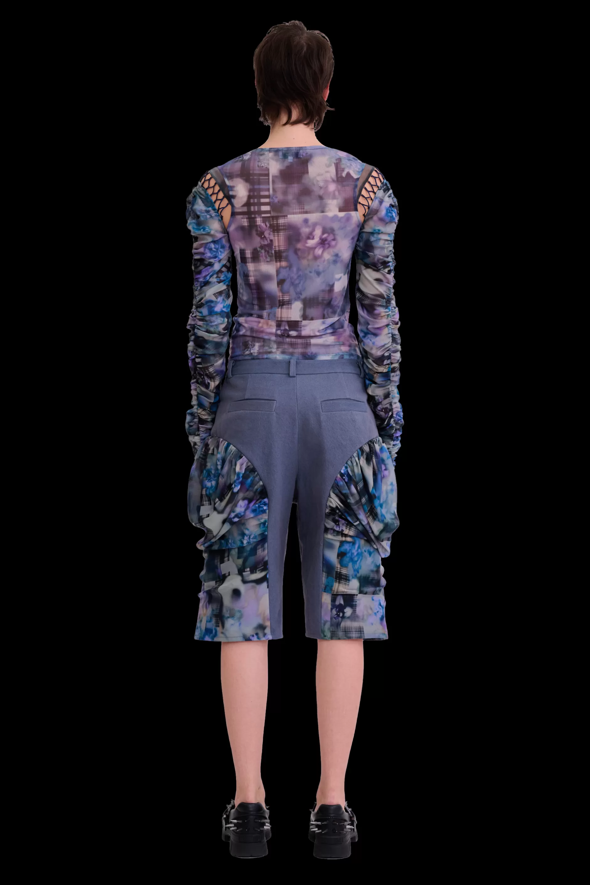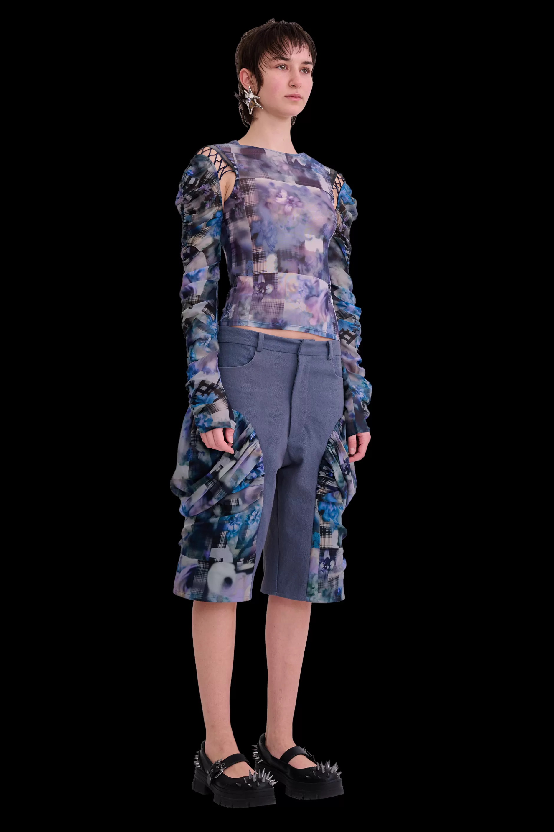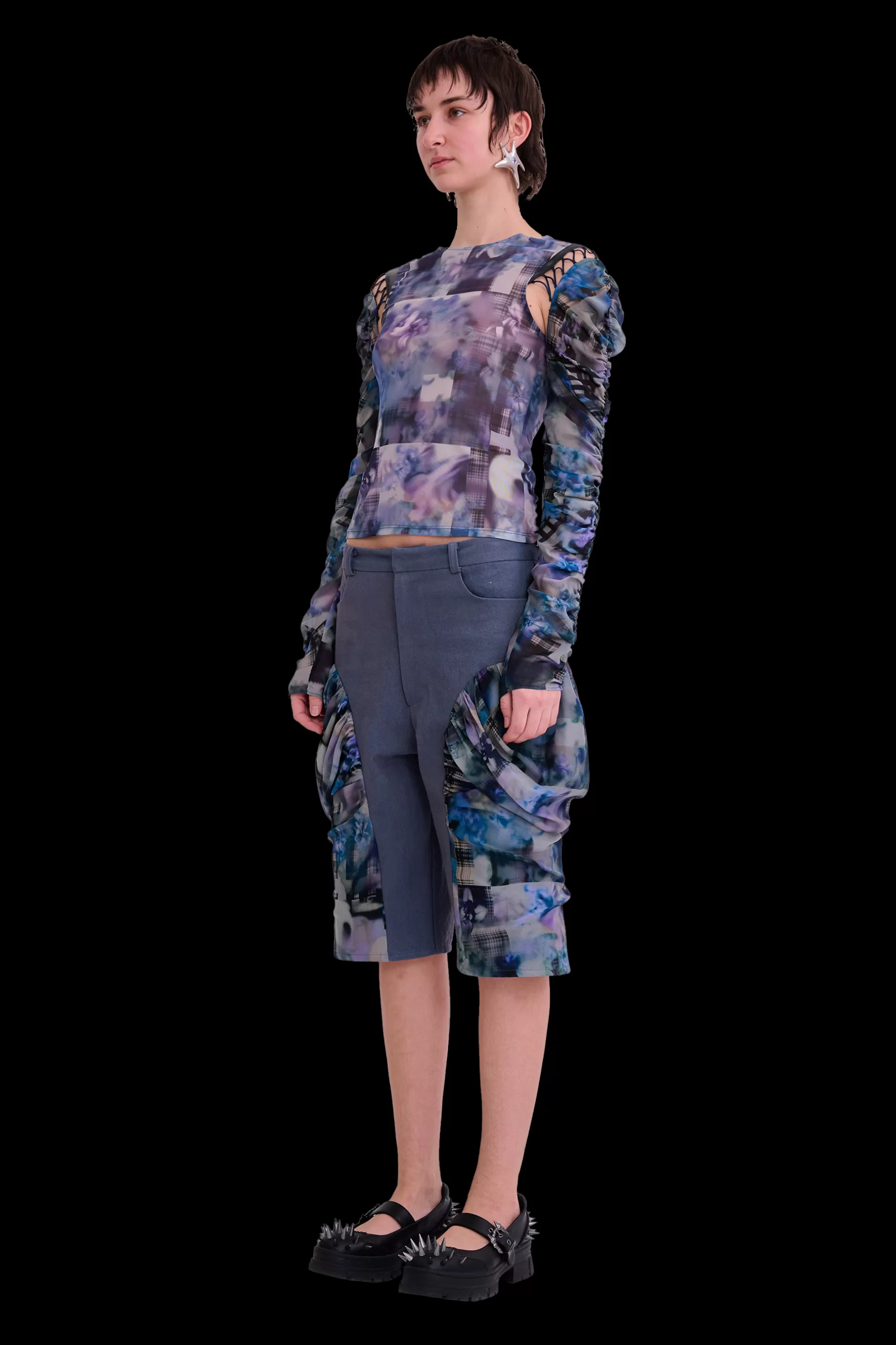 Straight denim shorts with draped chiffon side detail. Trouser front with welt back pockets. Collina Strada’s AI-generated Navy Garden Blur print.