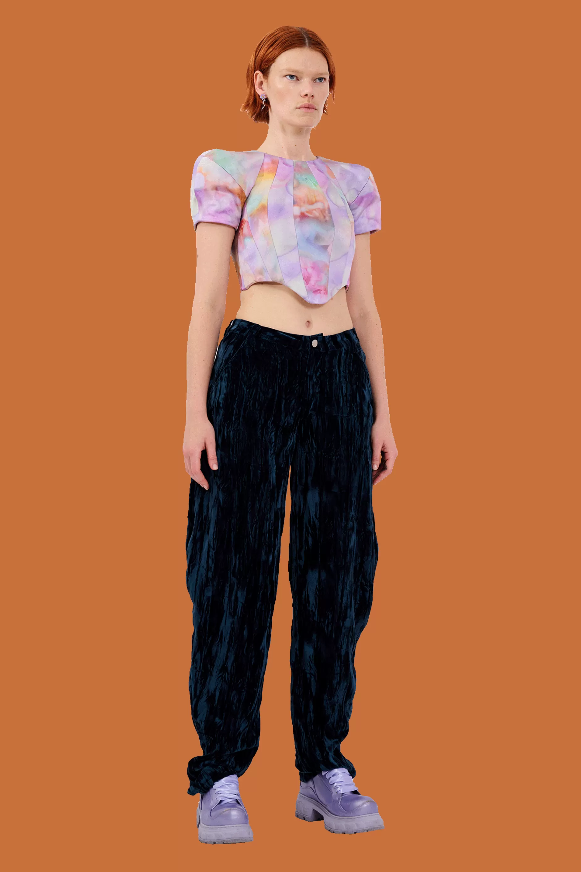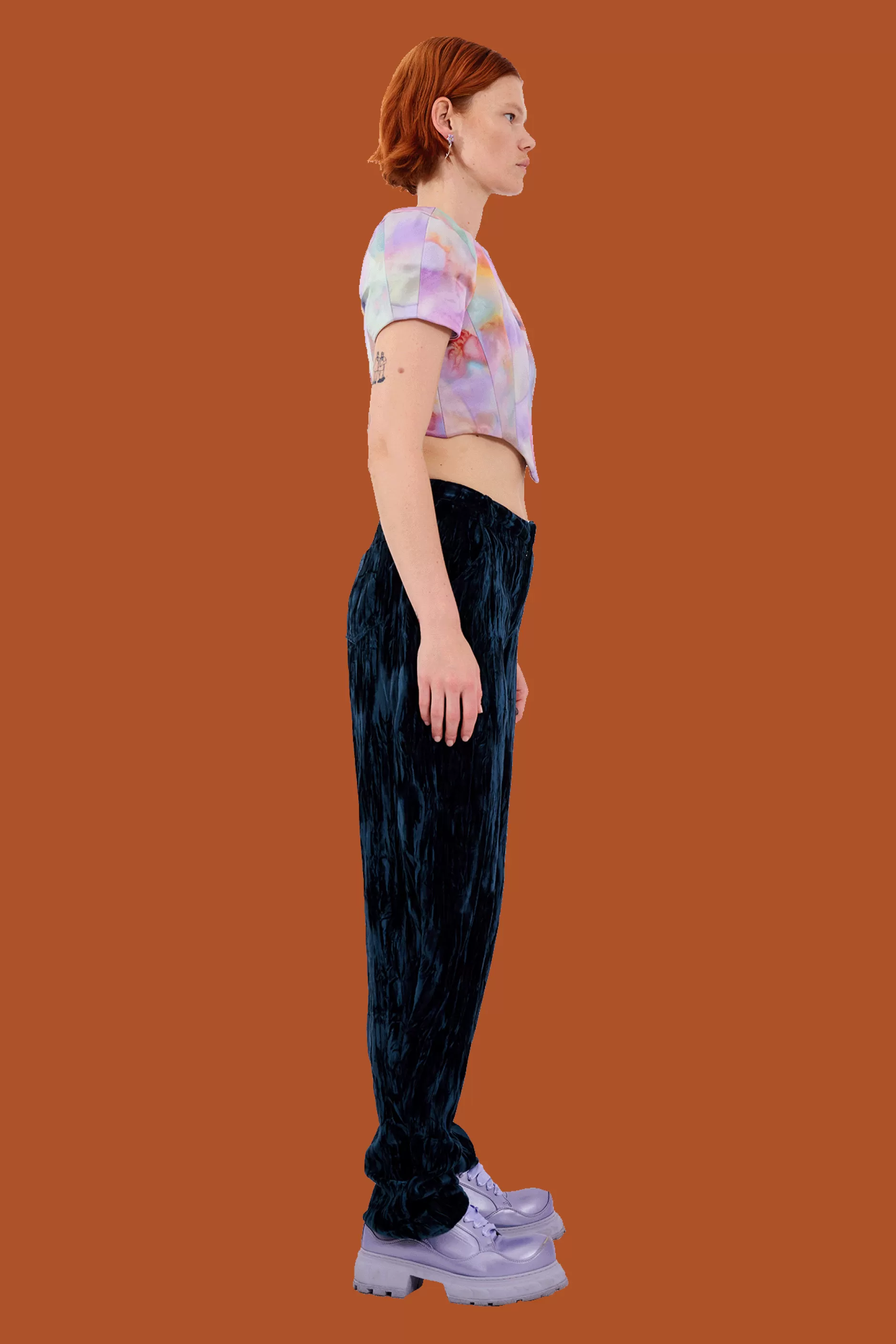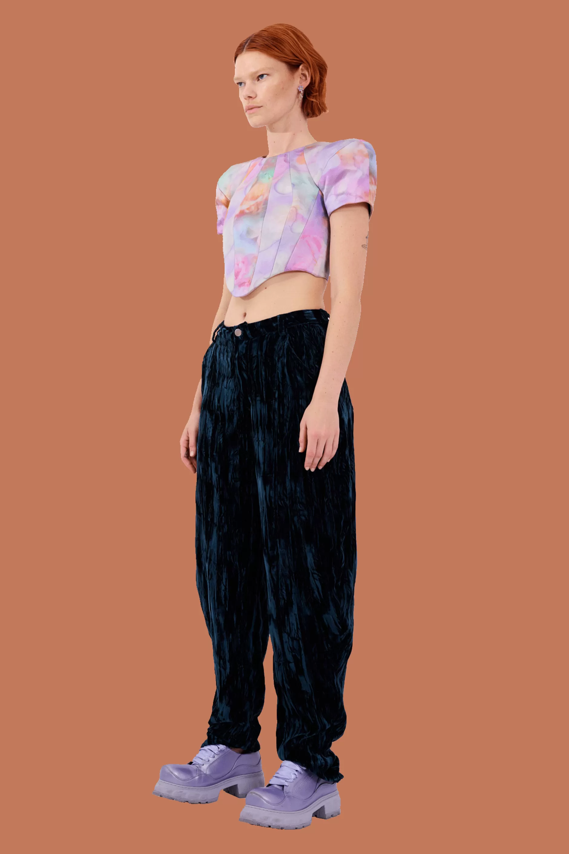 Mid-rise pant with exaggerated balloon leg in crushed velvet.