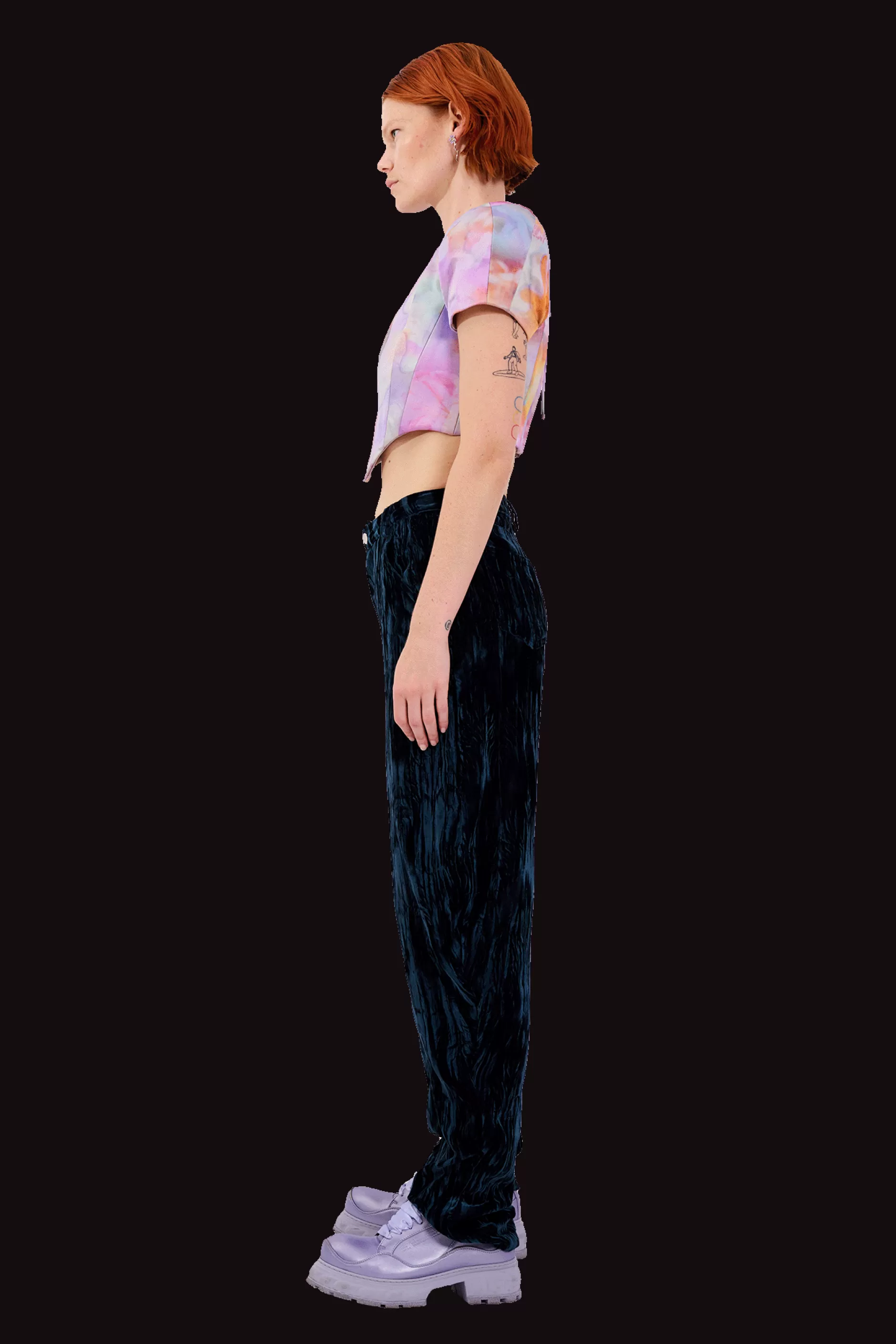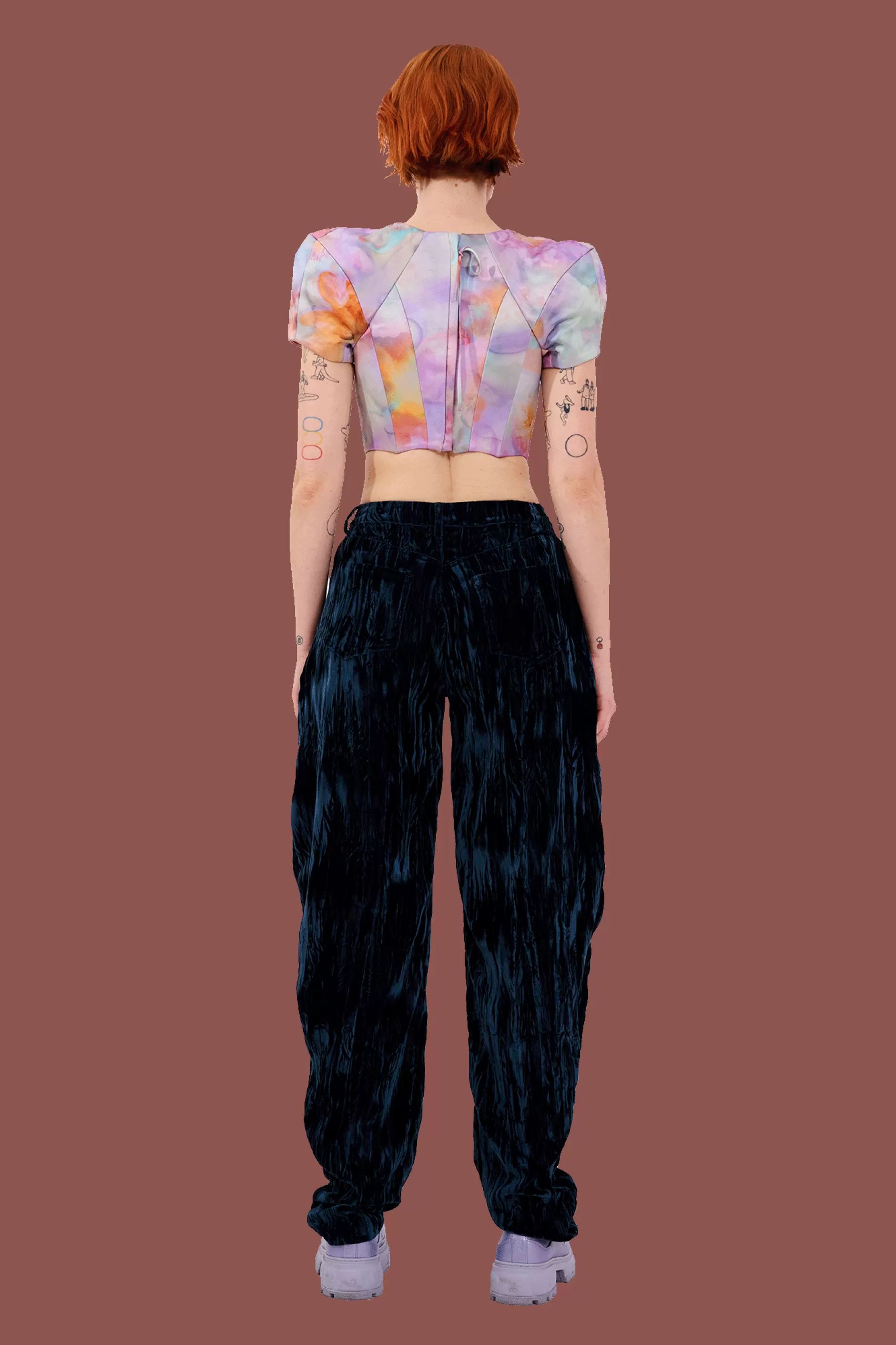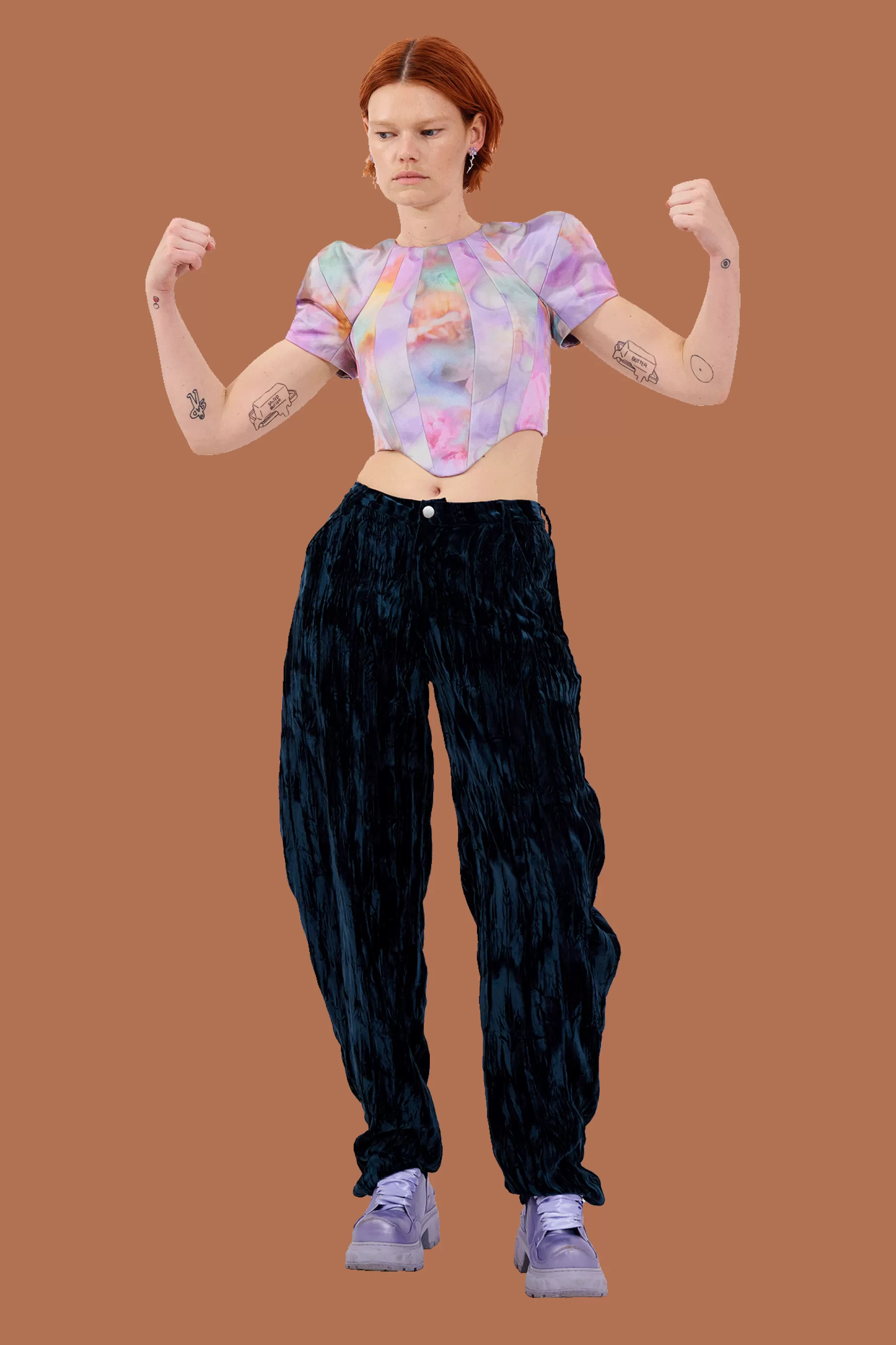 Mid-rise pant with exaggerated balloon leg in crushed velvet.