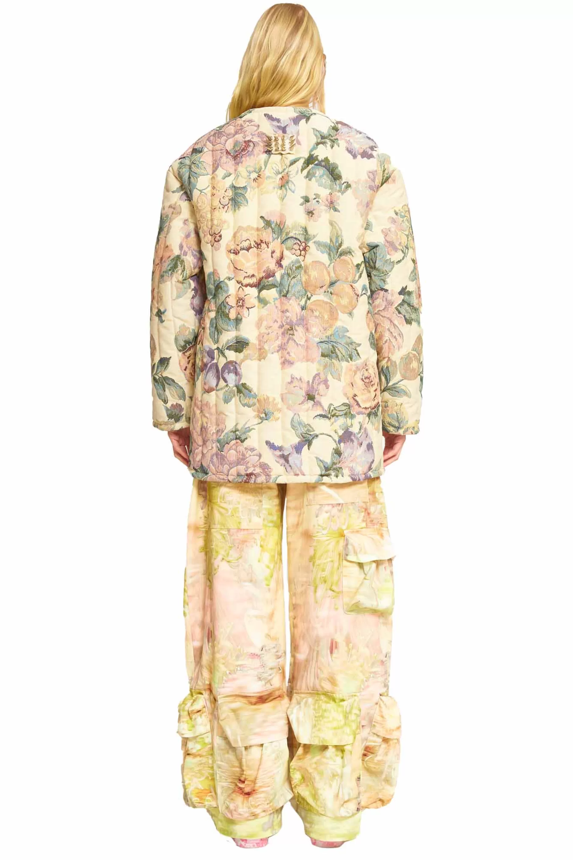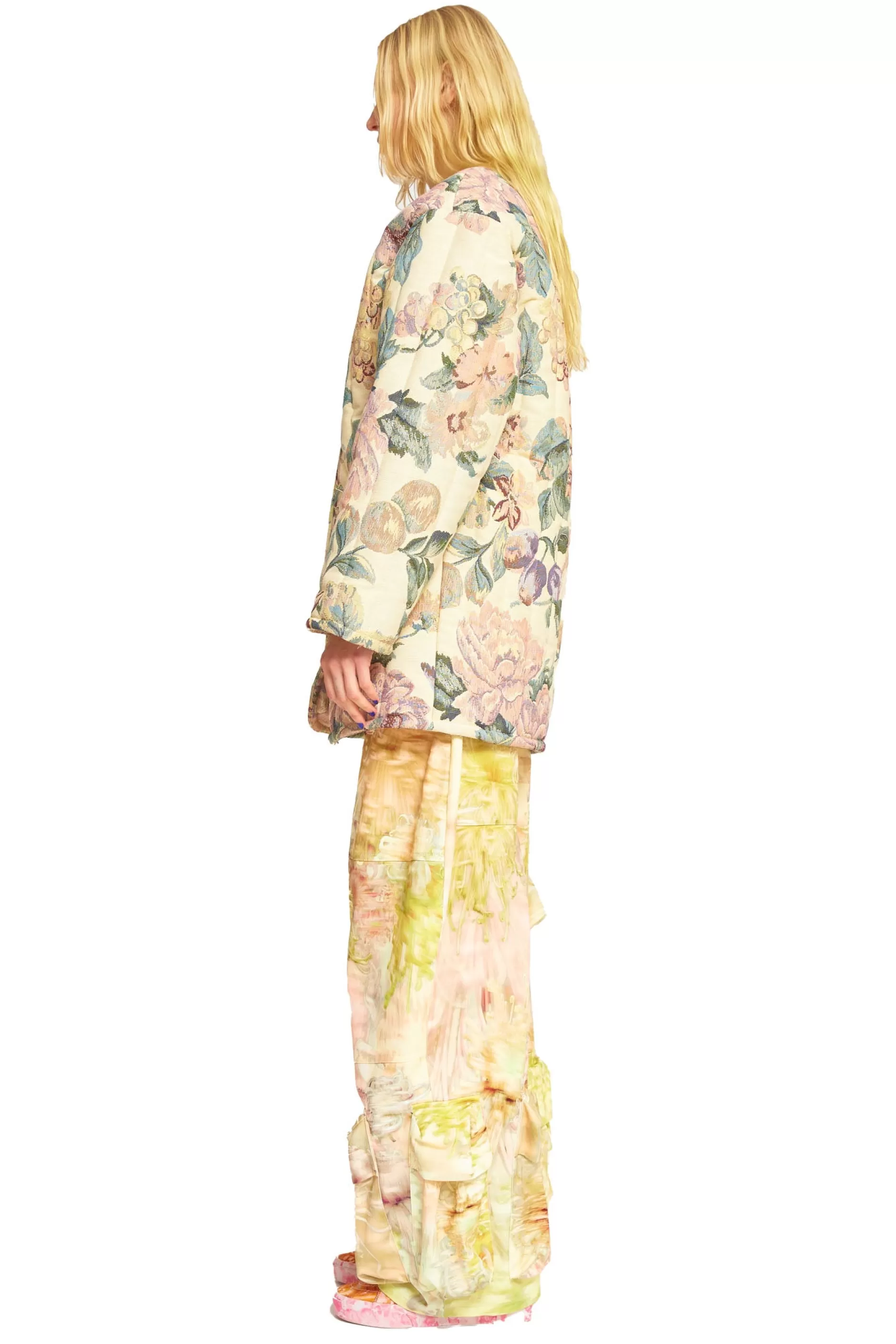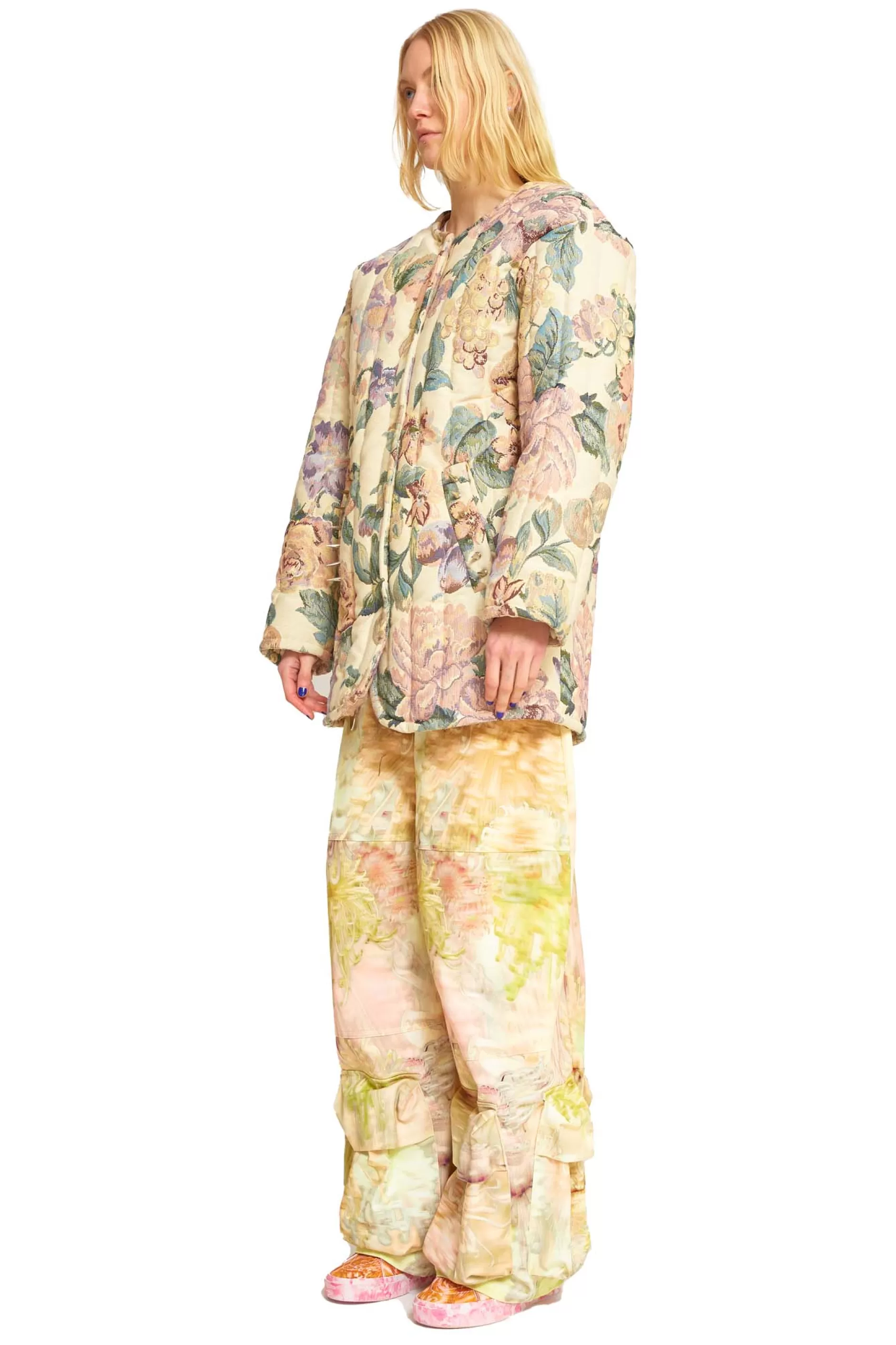 Our classic Shelter Jacket silhouette in deadstock tapestry fabric. Round neck, snap front. XL spikes on front pockets and back hanging loop.