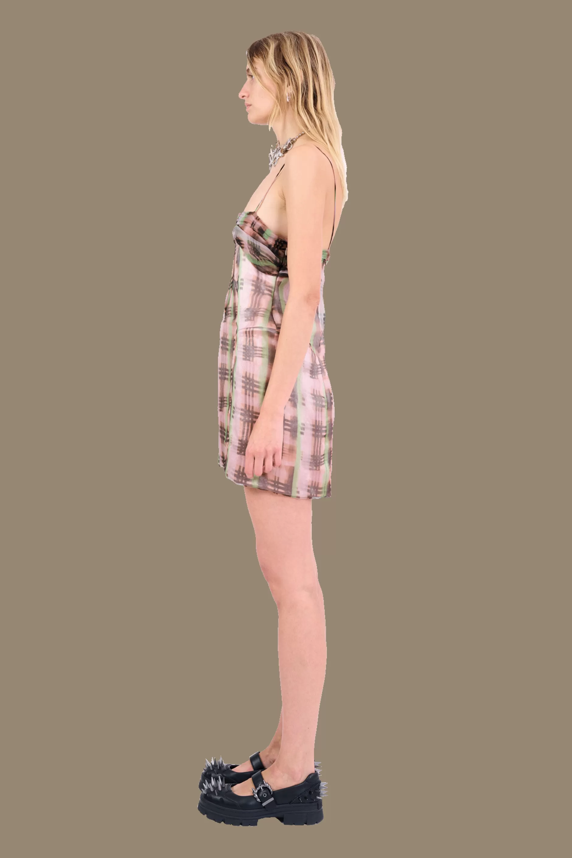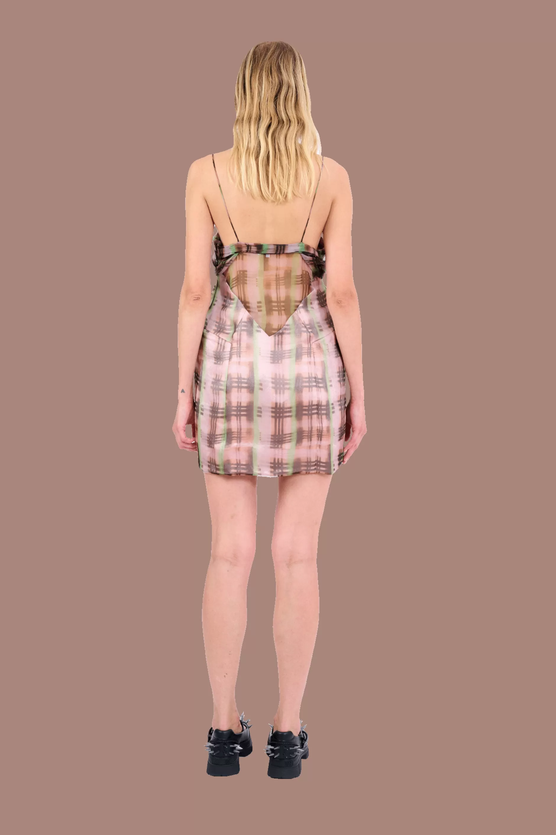 Structured mini dress with organza layered over shiny satin. Spaghetti straps.100% Silk and 100% Eco Acetate Made in Ne…