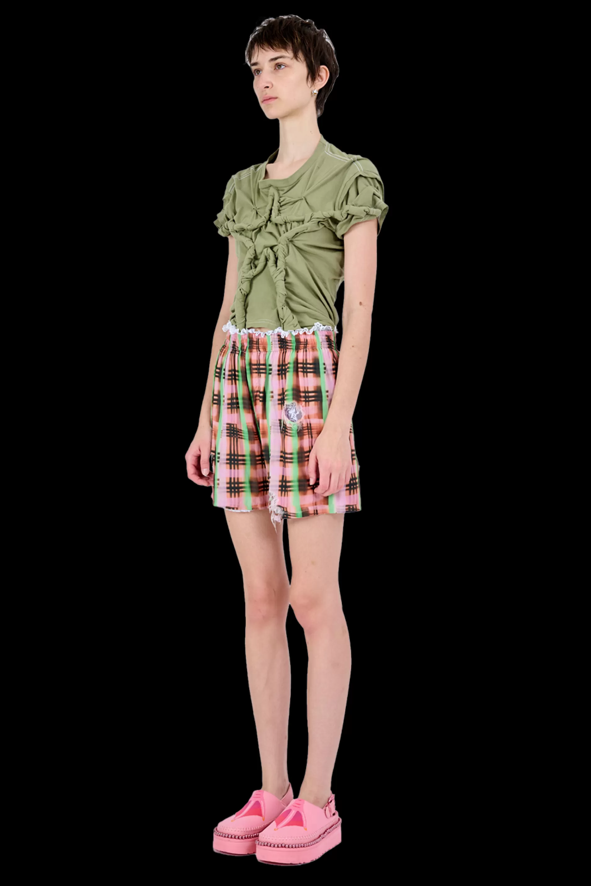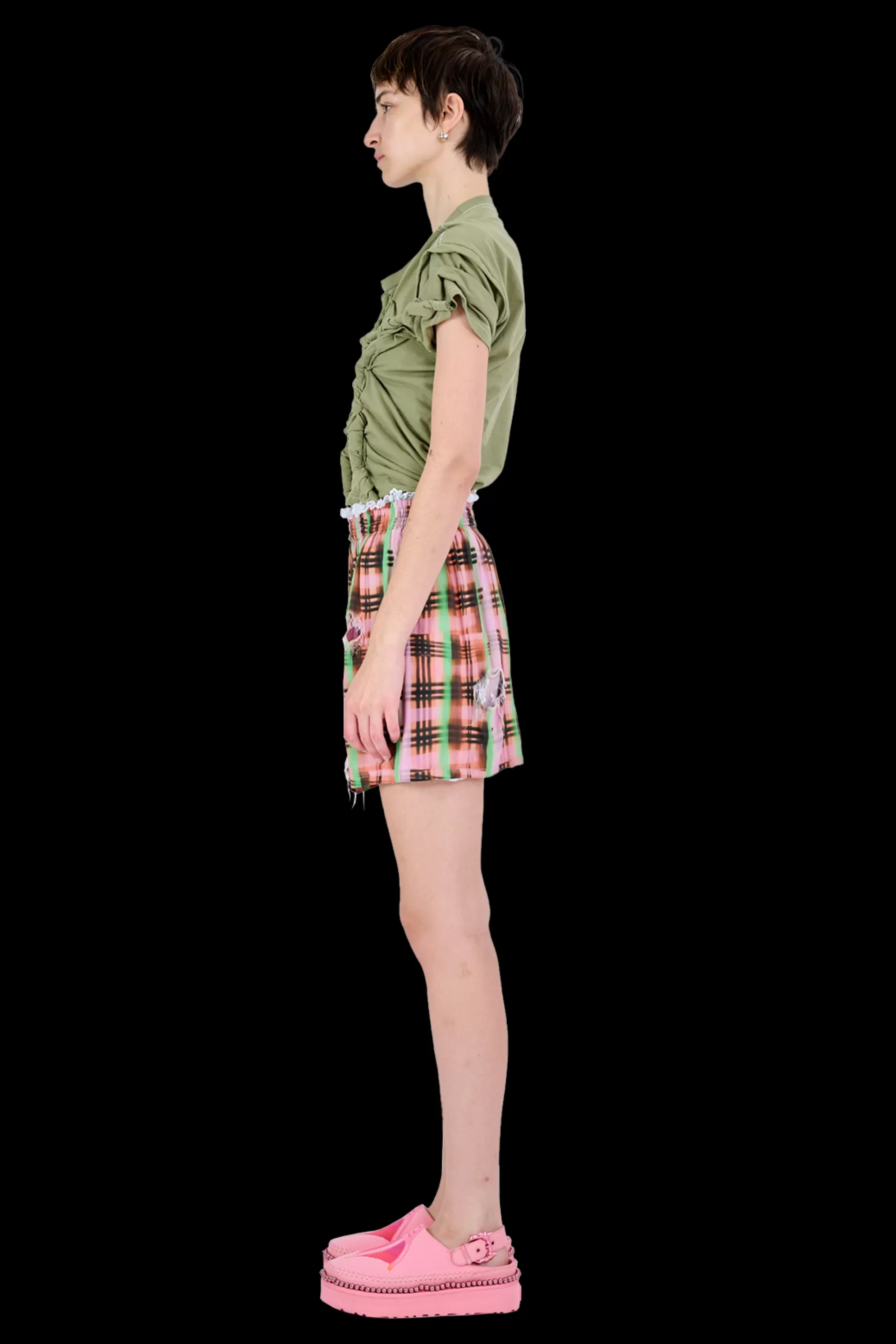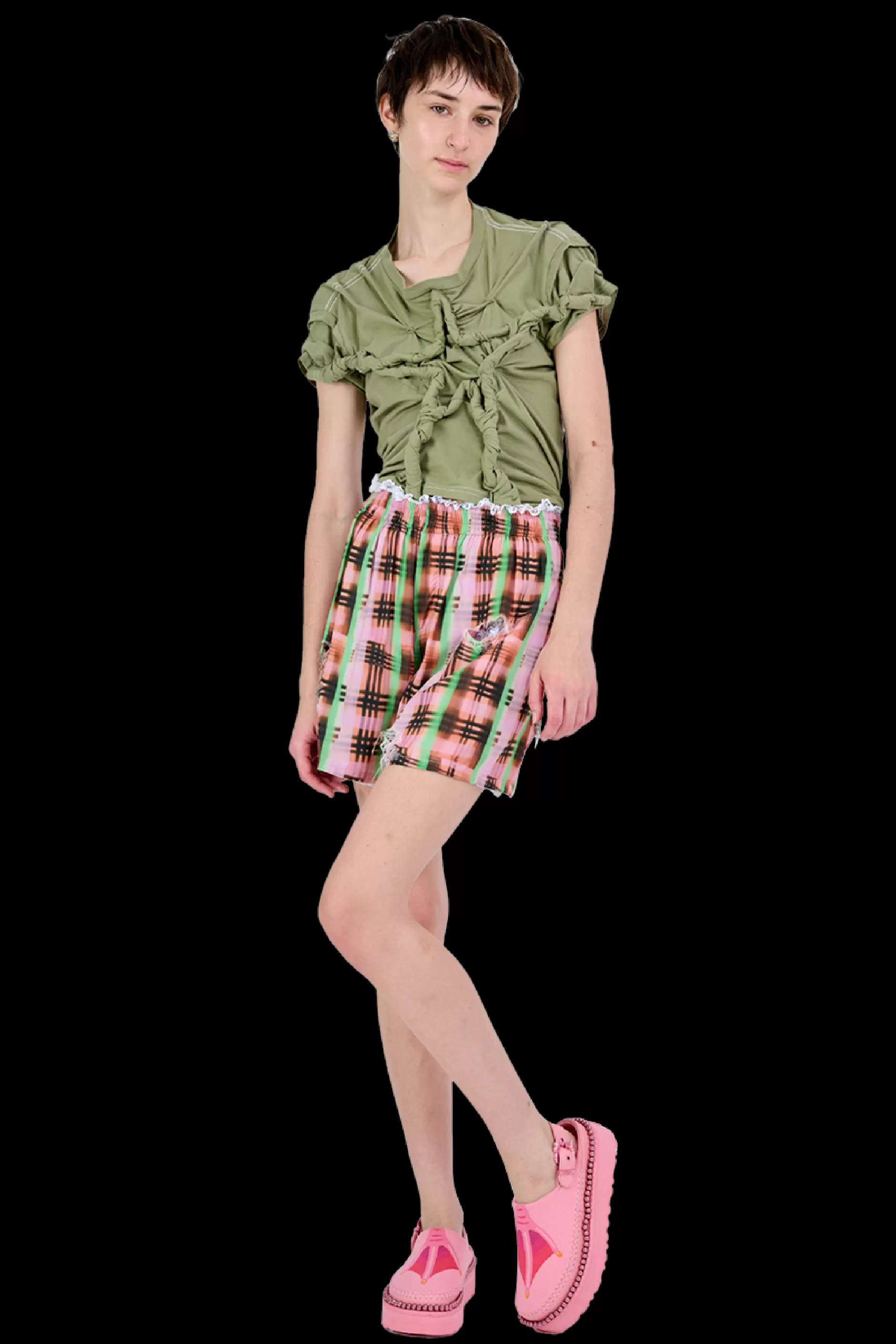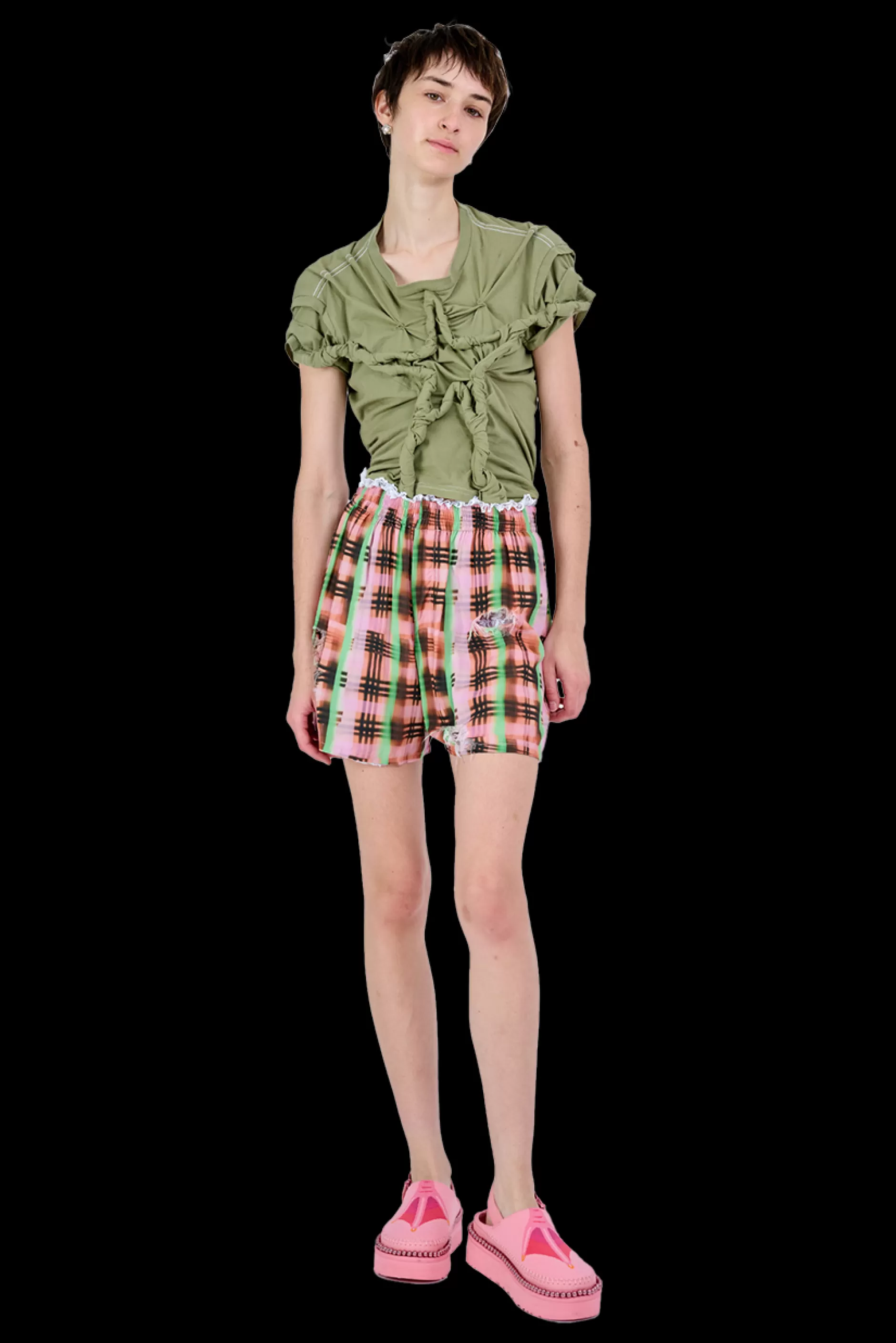 Distressed boxers with lace layer peeking through. Elastic waist.Collina Strada’s AI-generated Regenerative plaid print….
