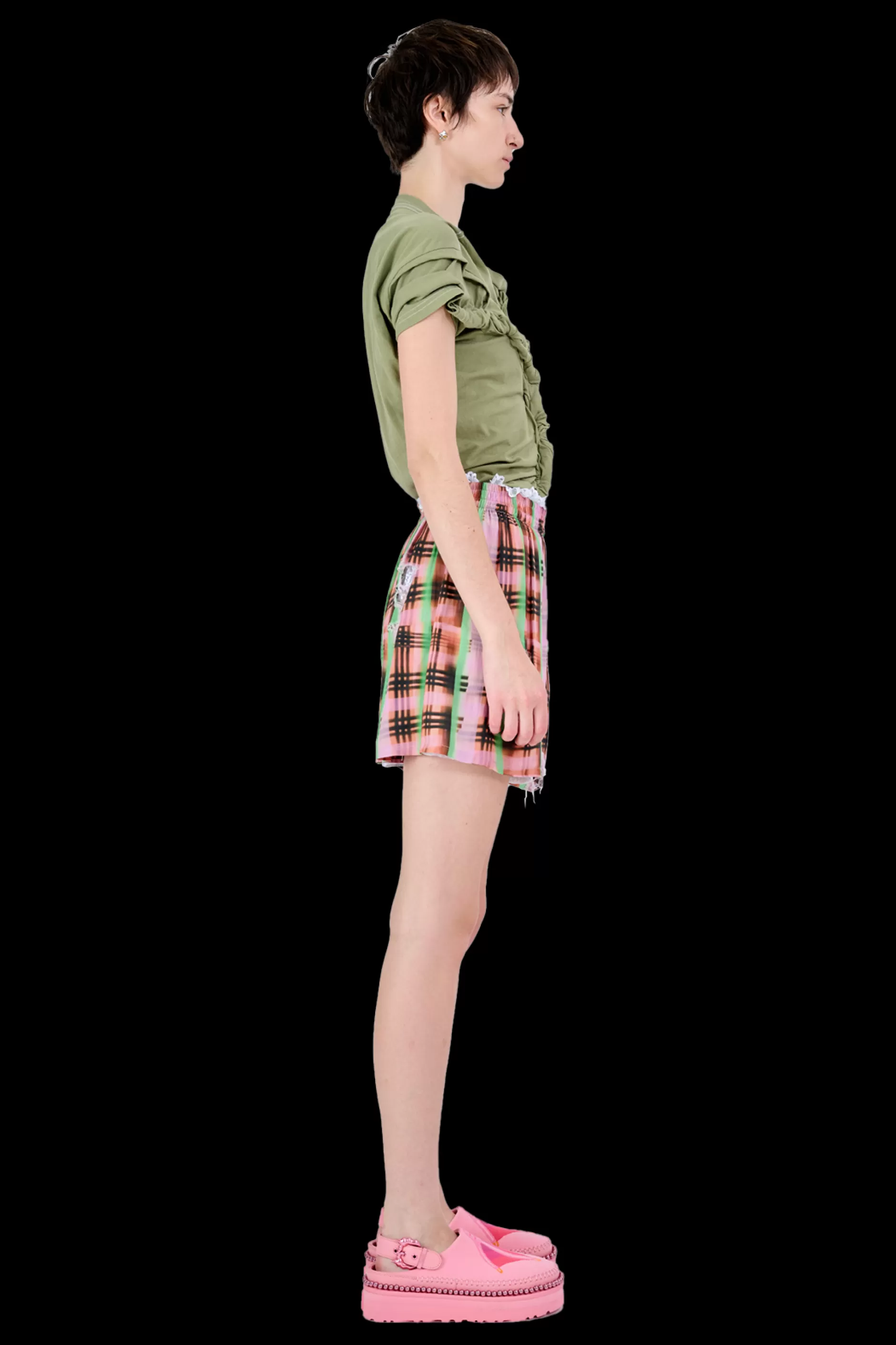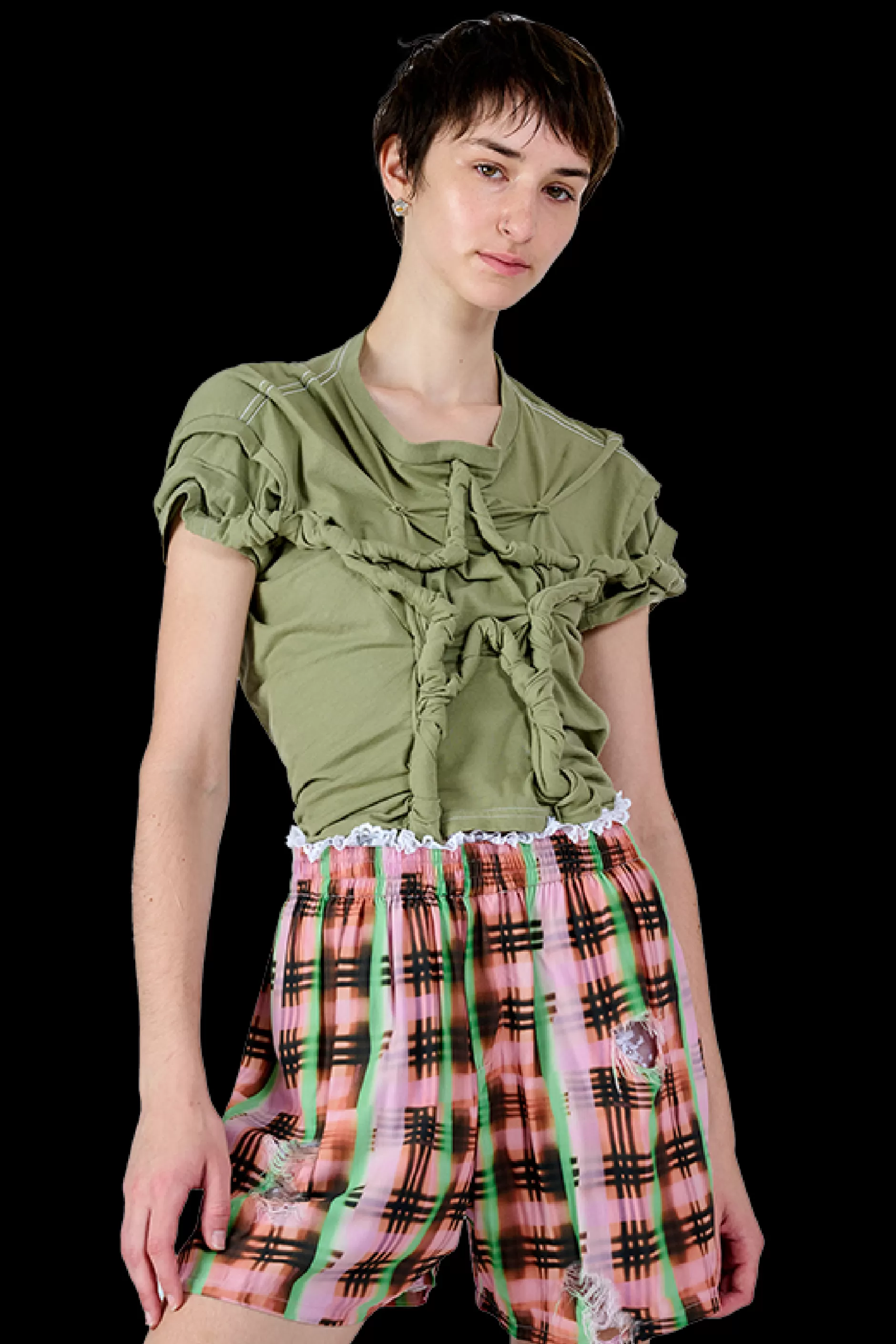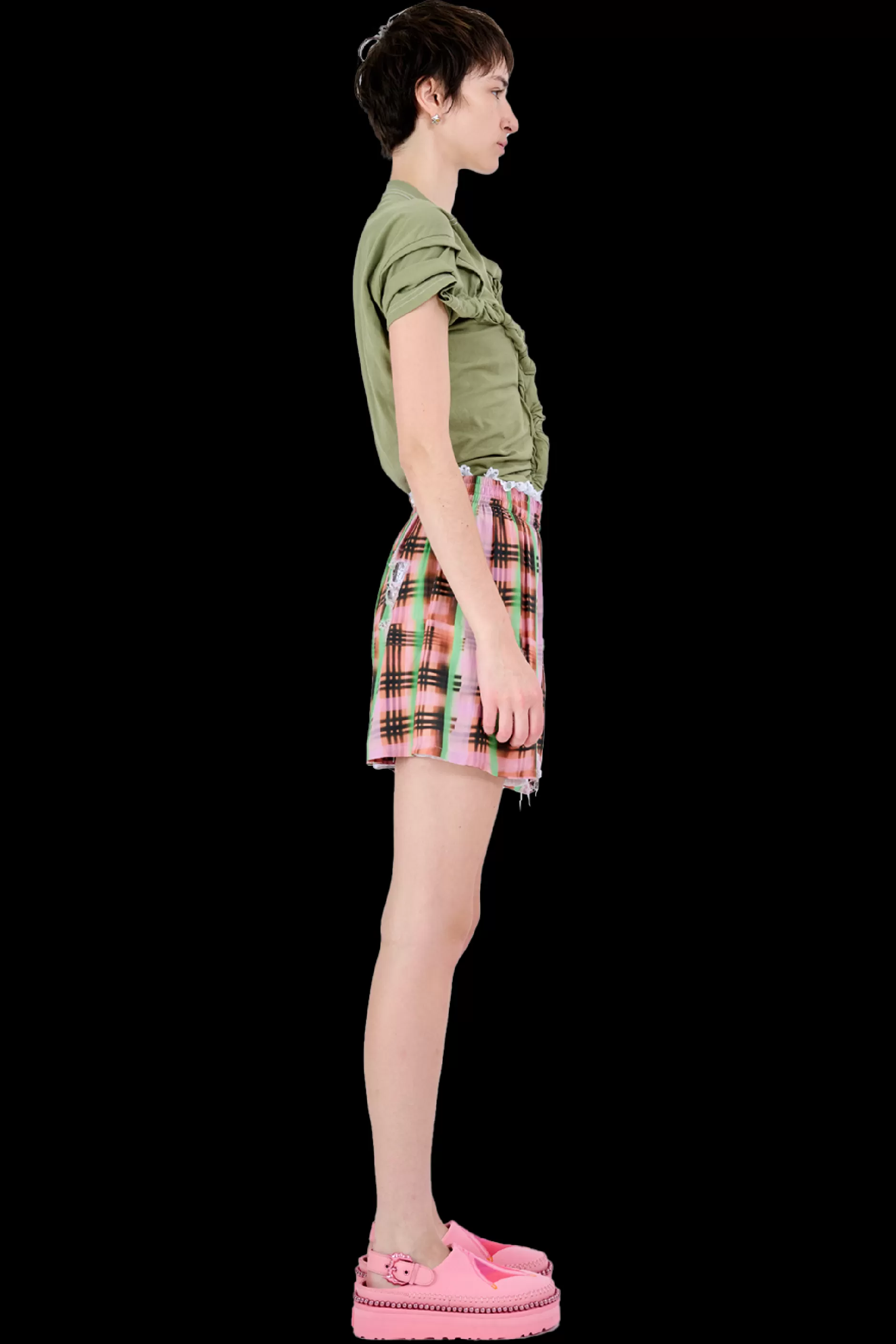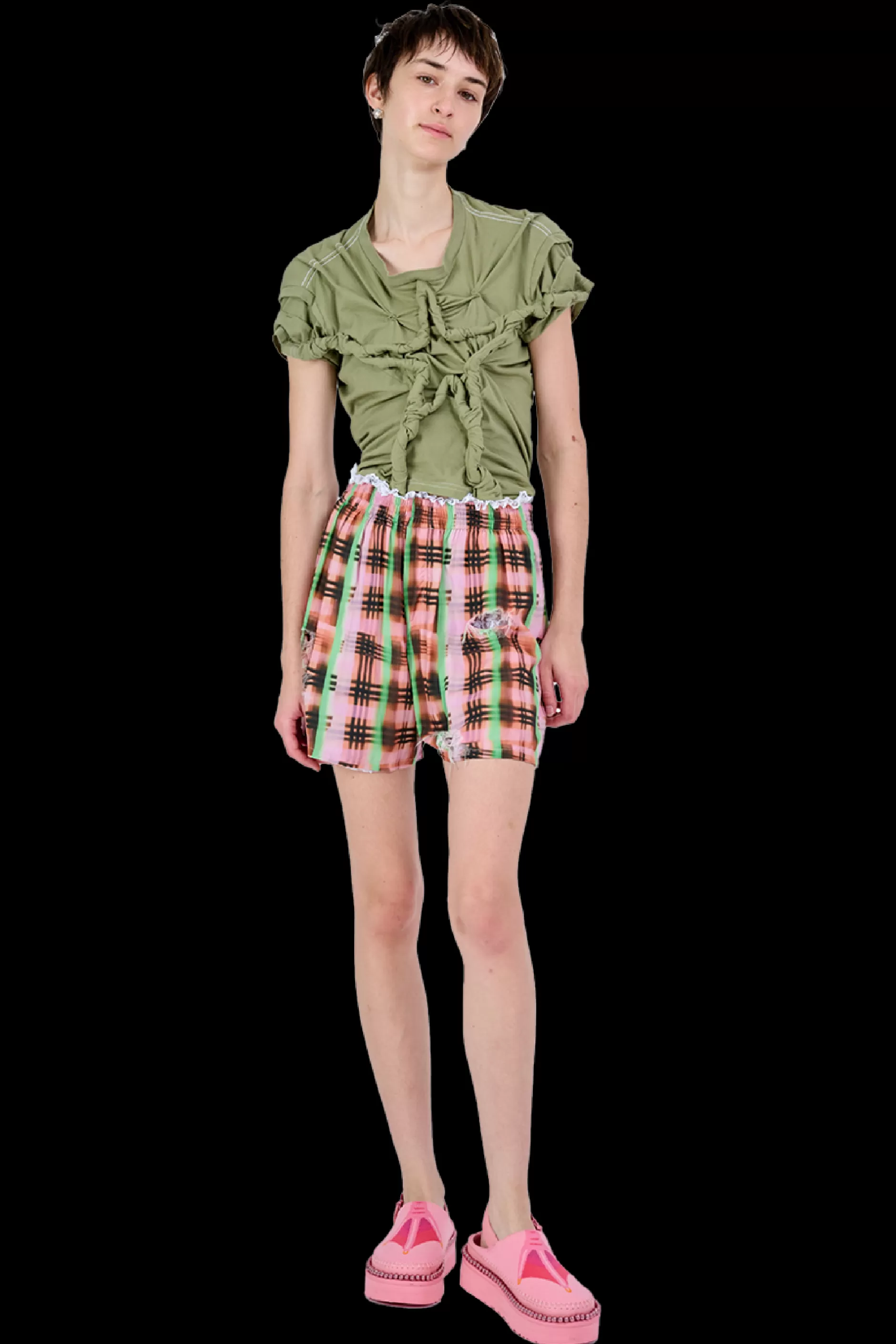 Distressed boxers with lace layer peeking through. Elastic waist.Collina Strada’s AI-generated Regenerative plaid print….