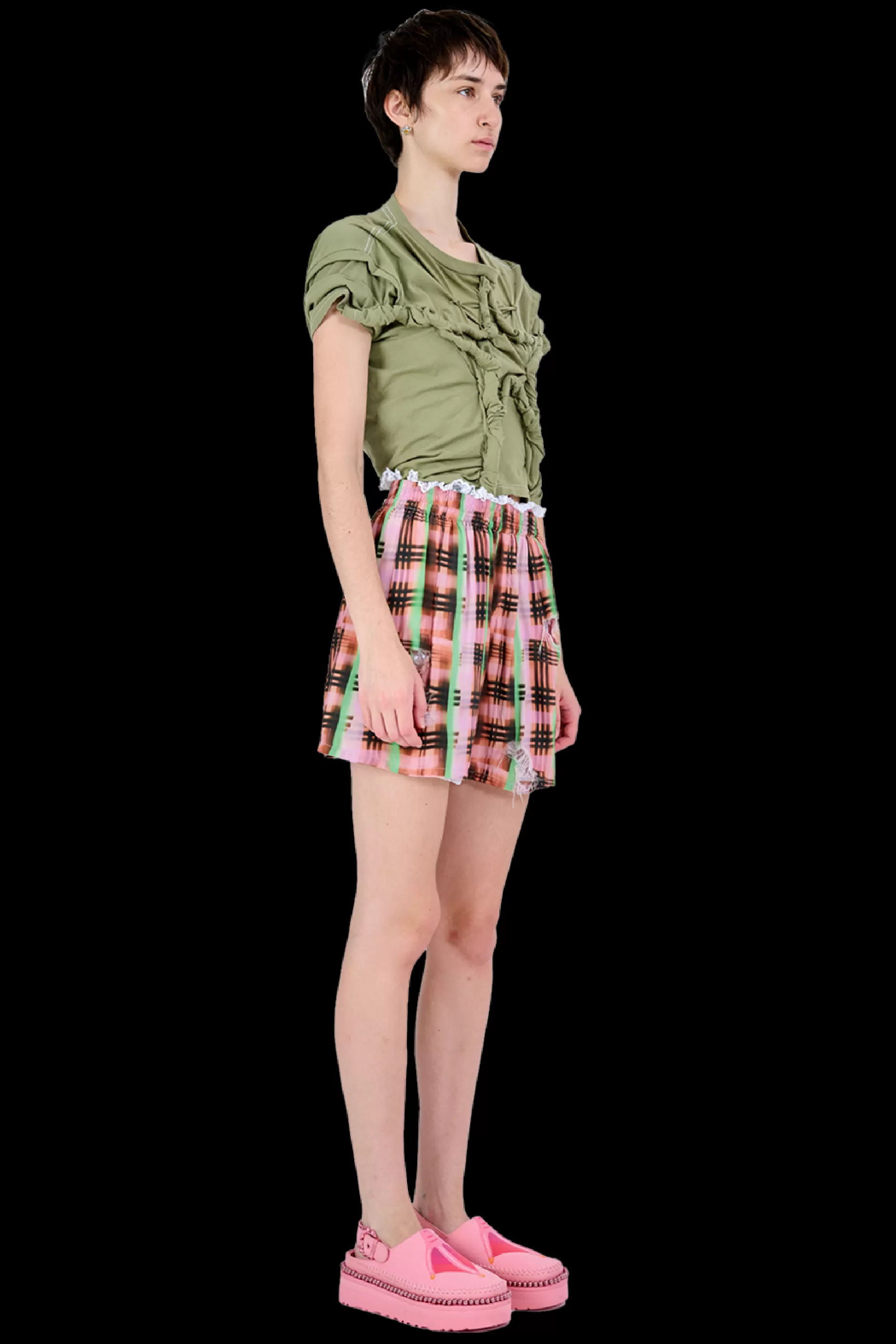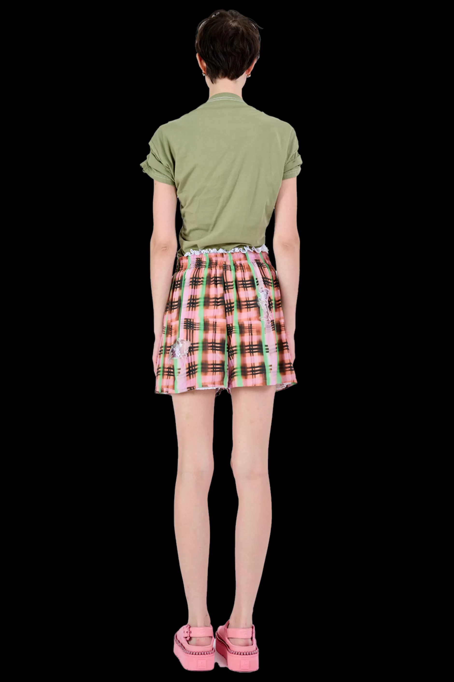 Distressed boxers with lace layer peeking through. Elastic waist.Collina Strada’s AI-generated Regenerative plaid print.