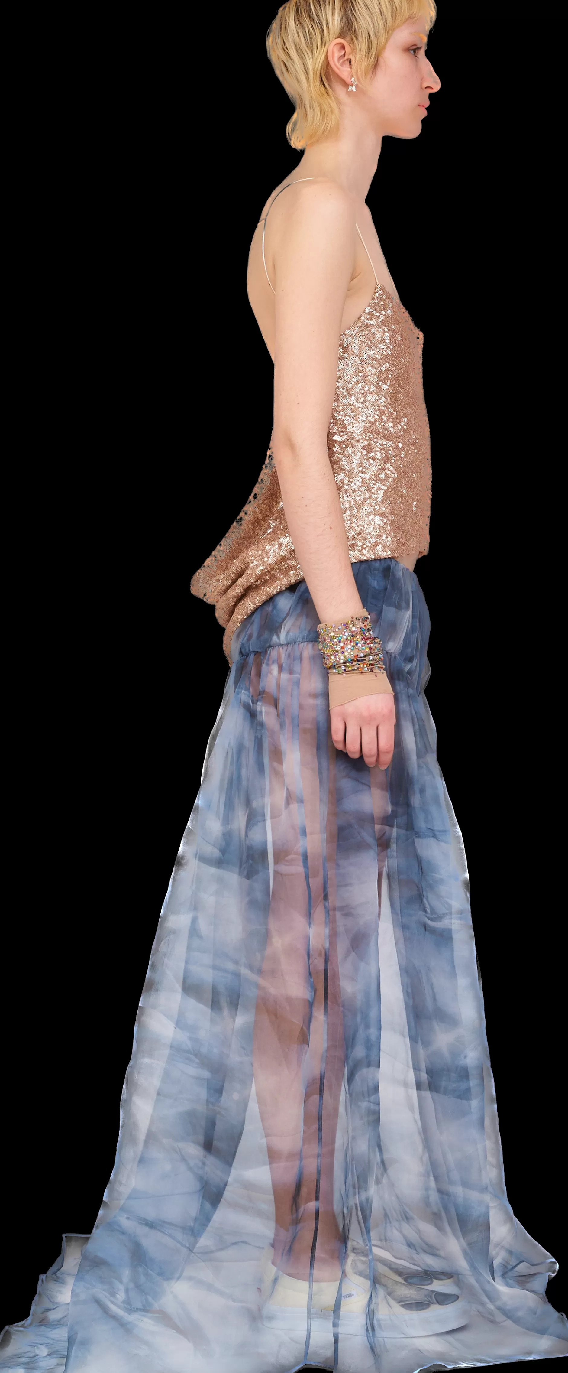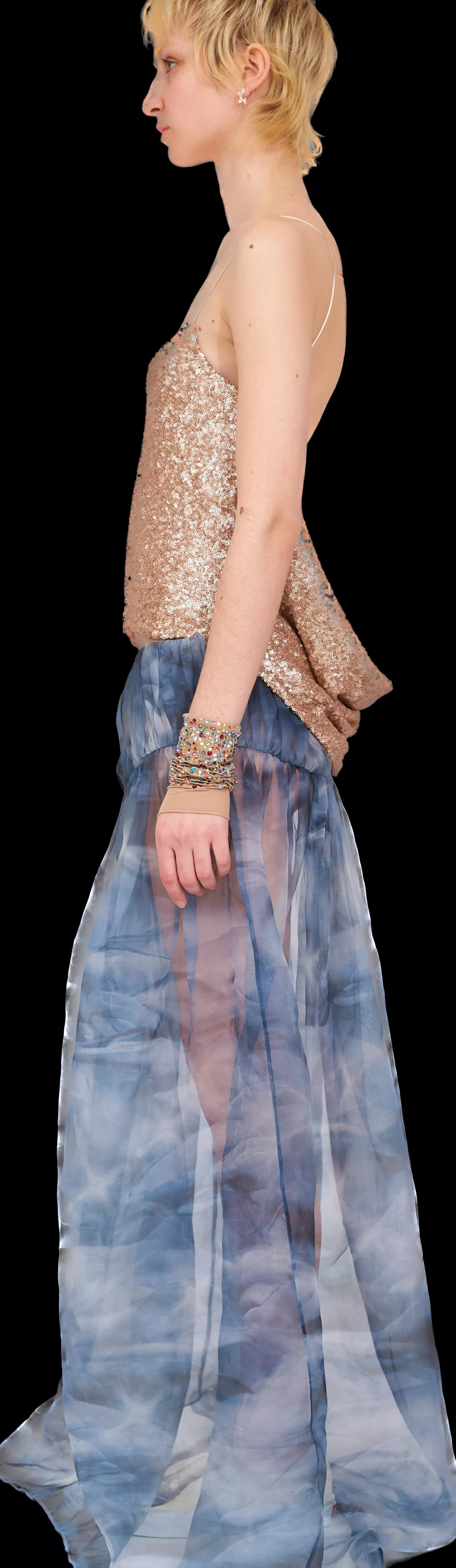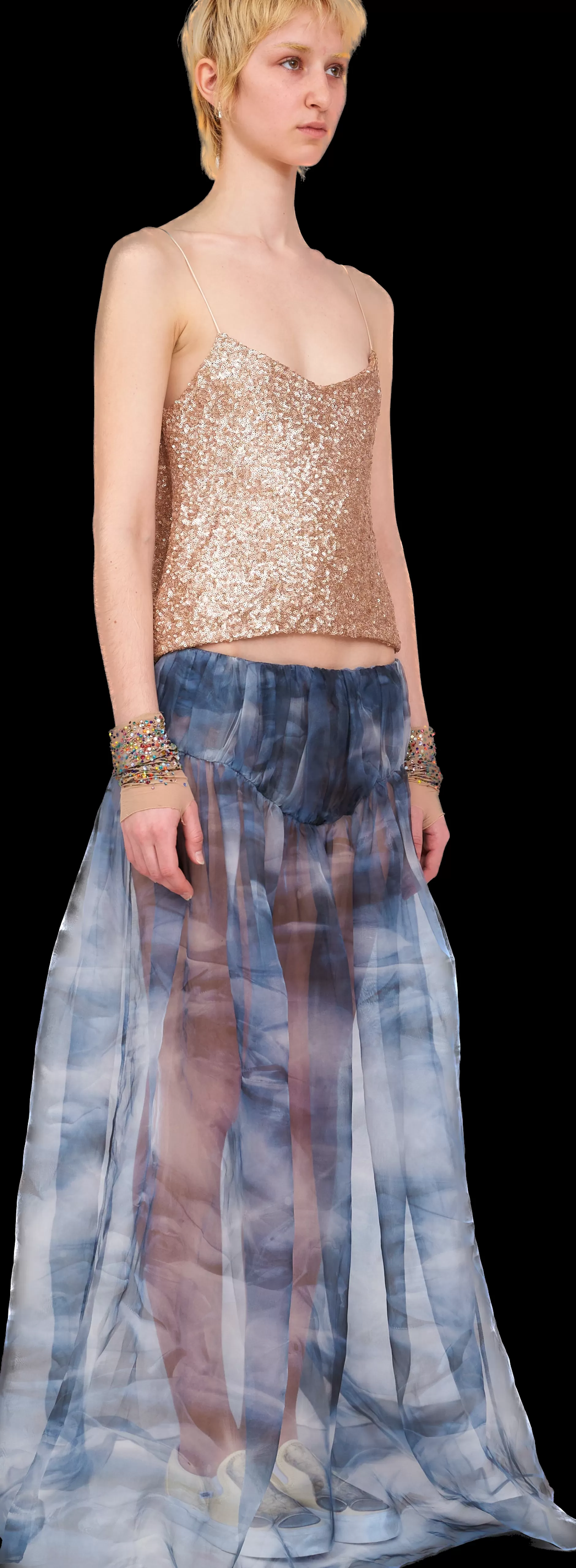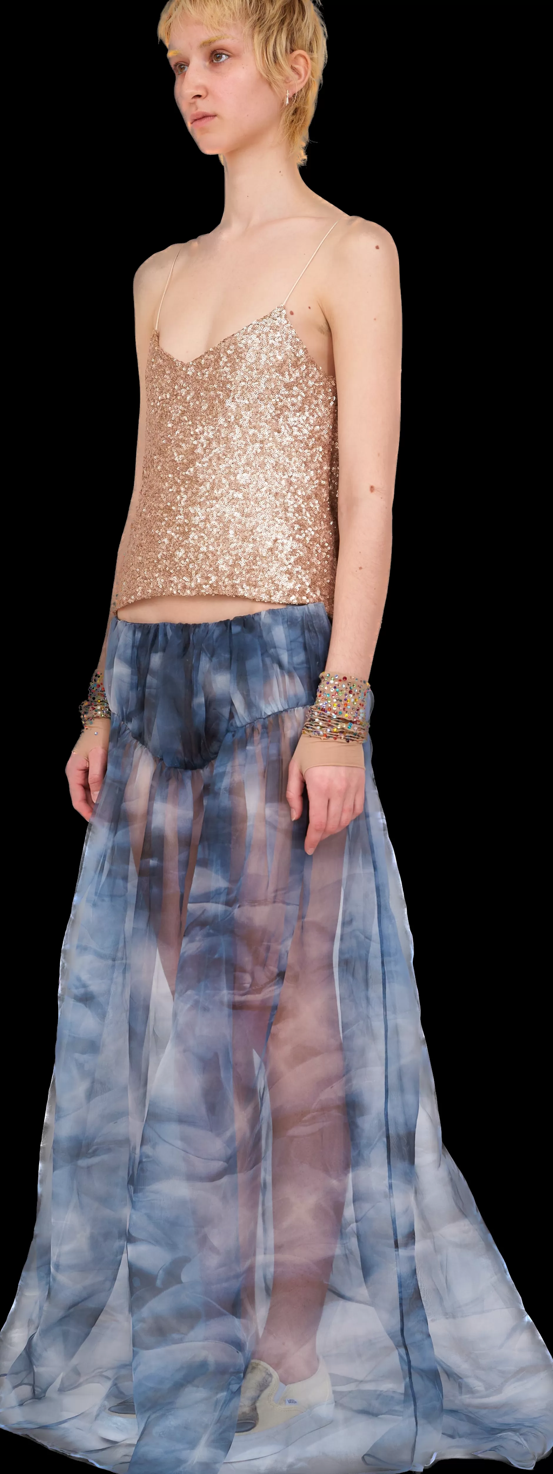 Spaghetti strap top with deep cowl back. All over sequins, front is fully lined with mesh.100% Deadstock Polyester and 1…