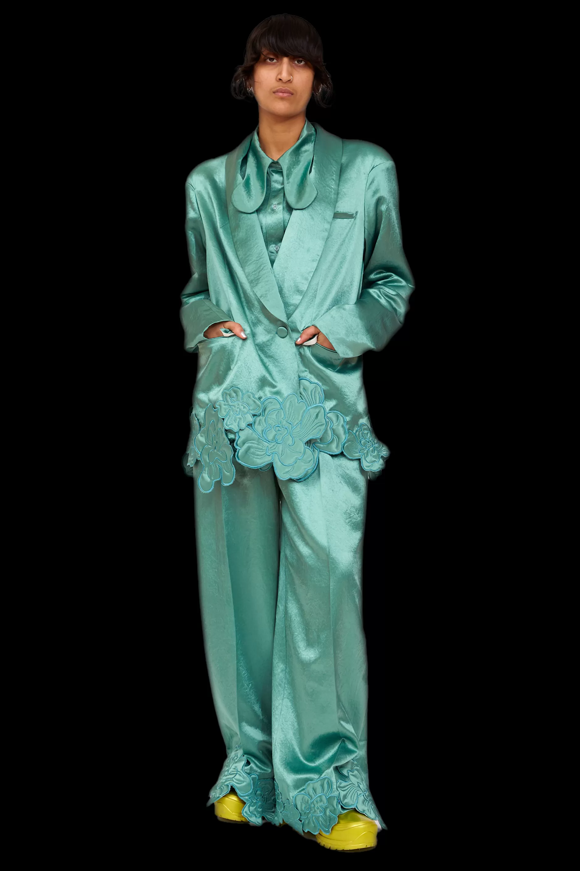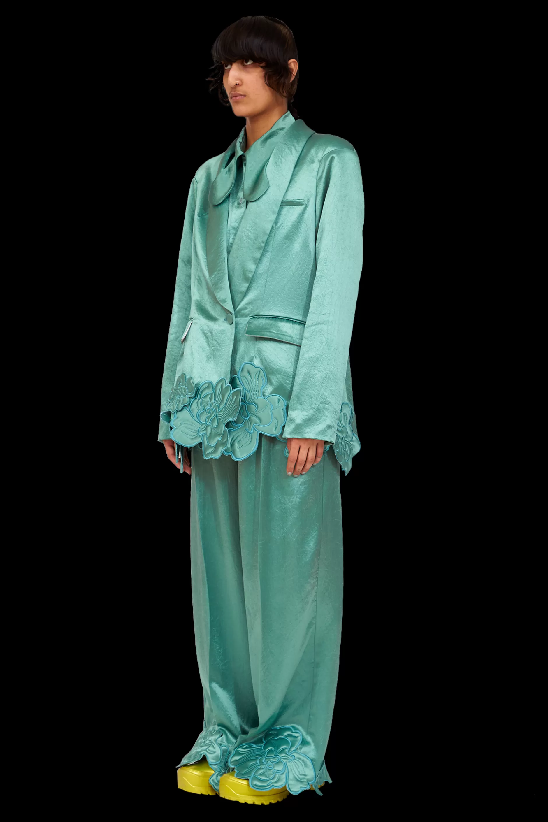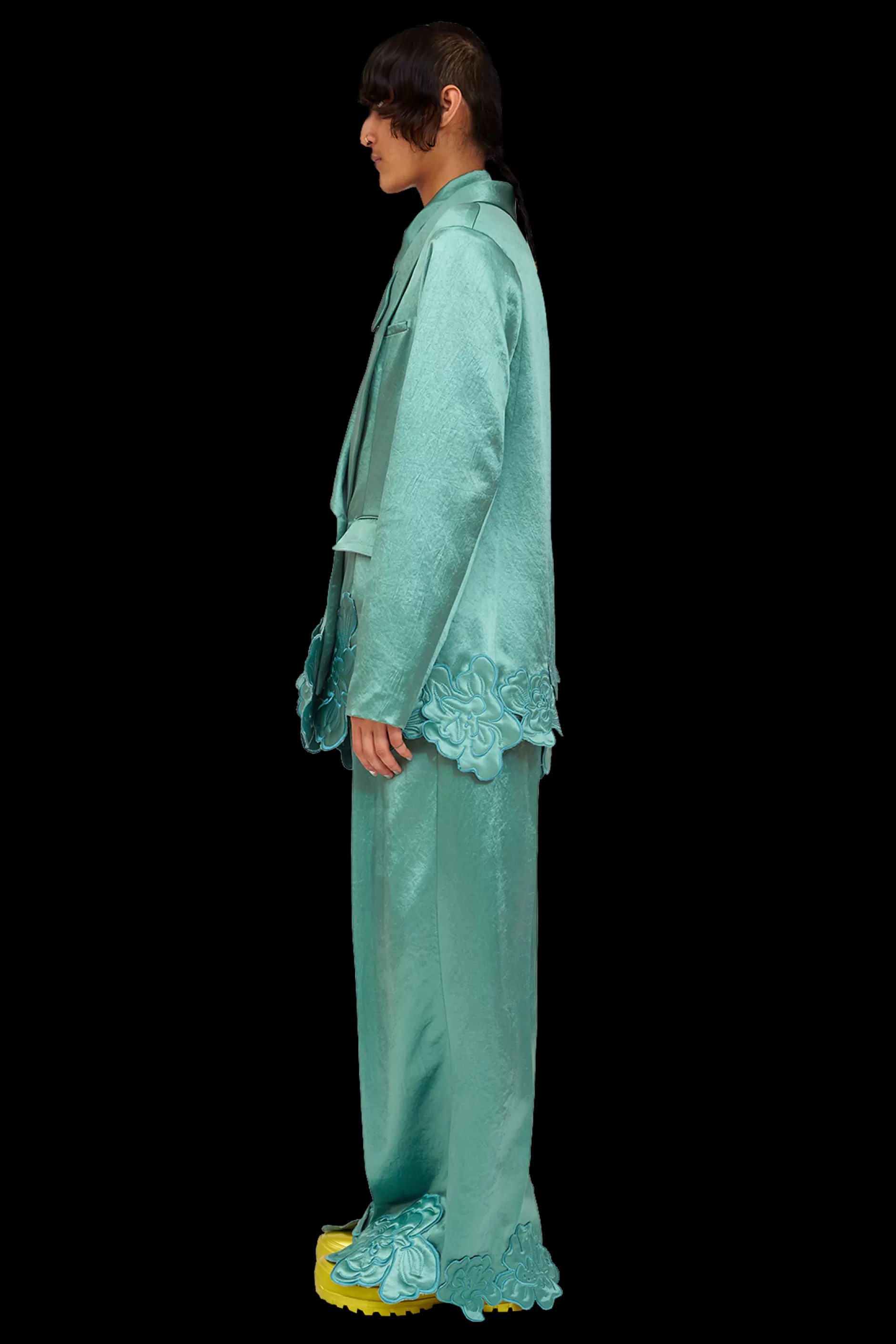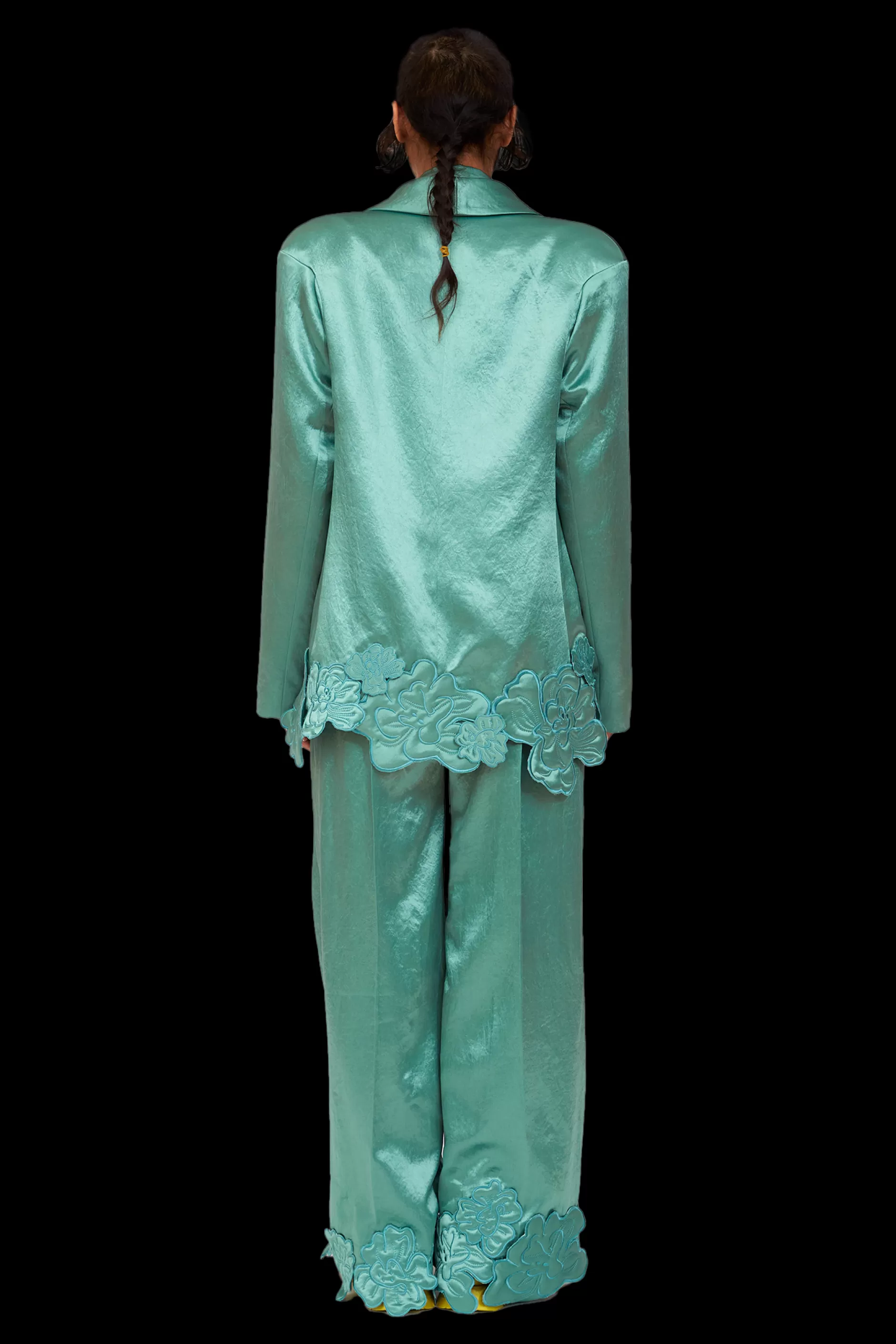Boxy blazer with embroidered flower appliqués at the them. Slightly sloped shoulders, double breasted with single button. Fully lined. Complete the suit with the Ribbit Pant and Bunny Button Up.