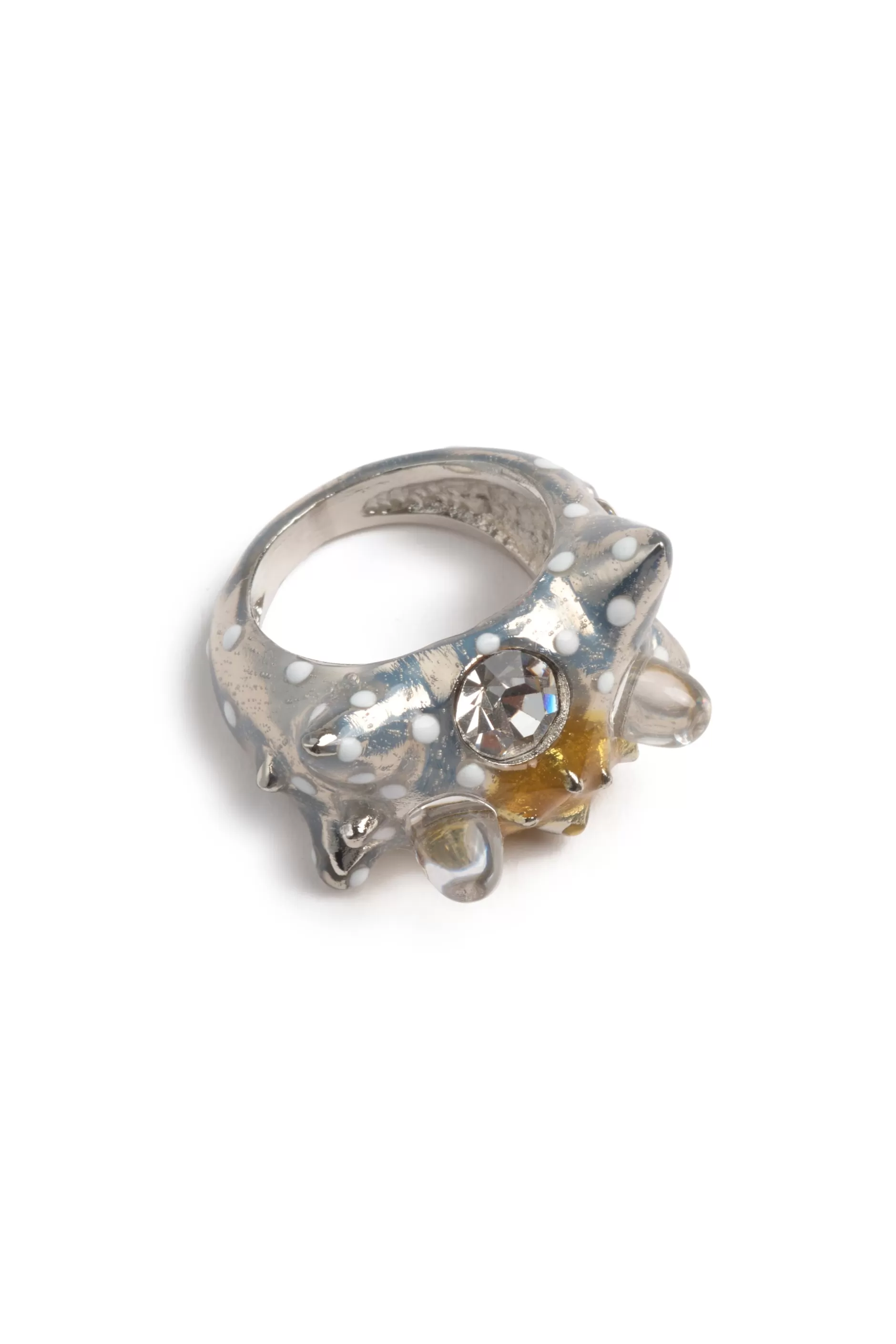 Spiky ring with gradient effect and rhinestones and cabochons. Hand enameled