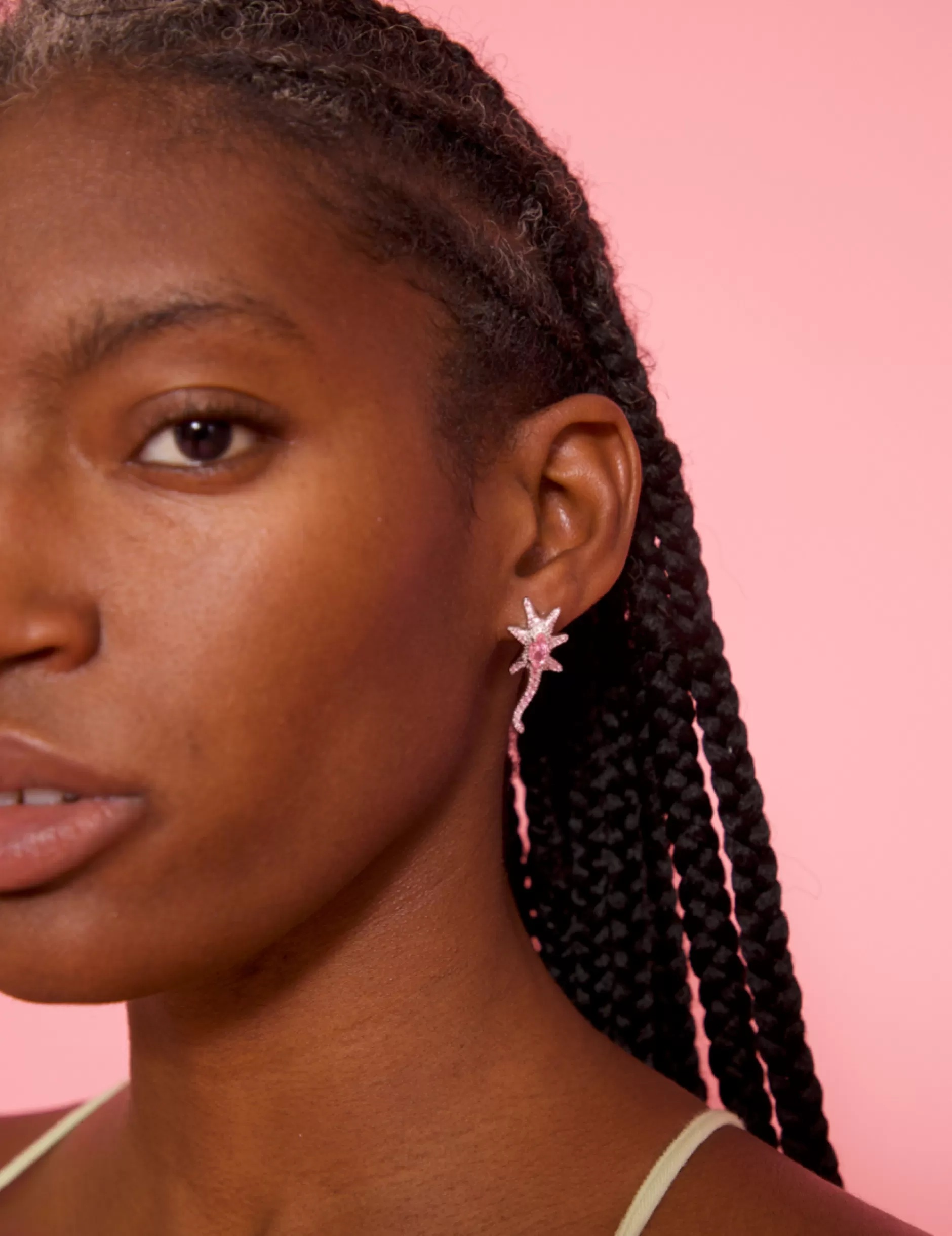 Sterling silver star trail earrings encrusted in soft pink rhinestones. Stud back. 100% Sterling Silver and rose crystal.